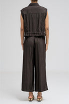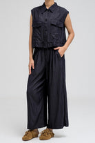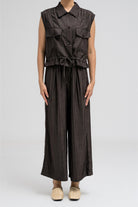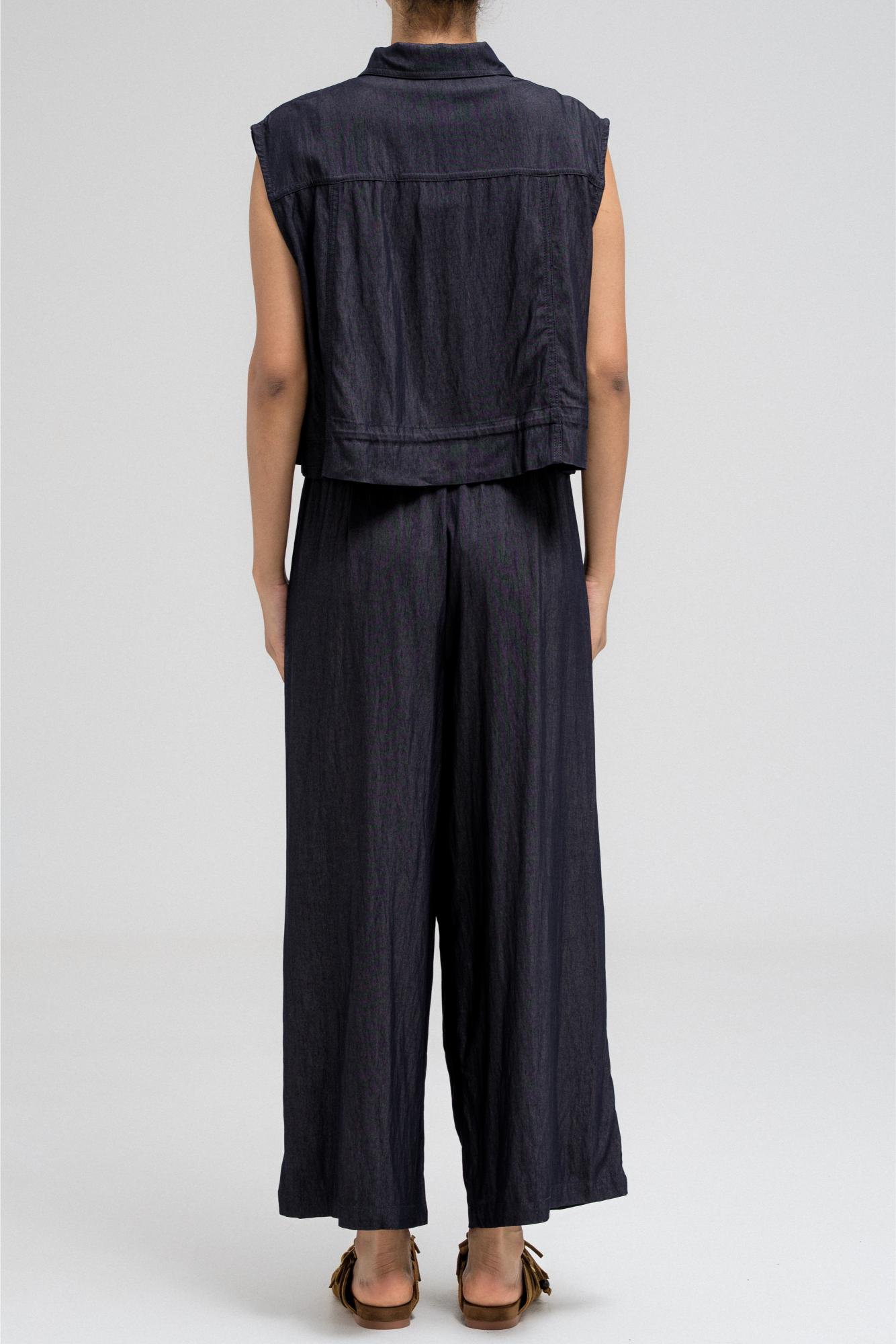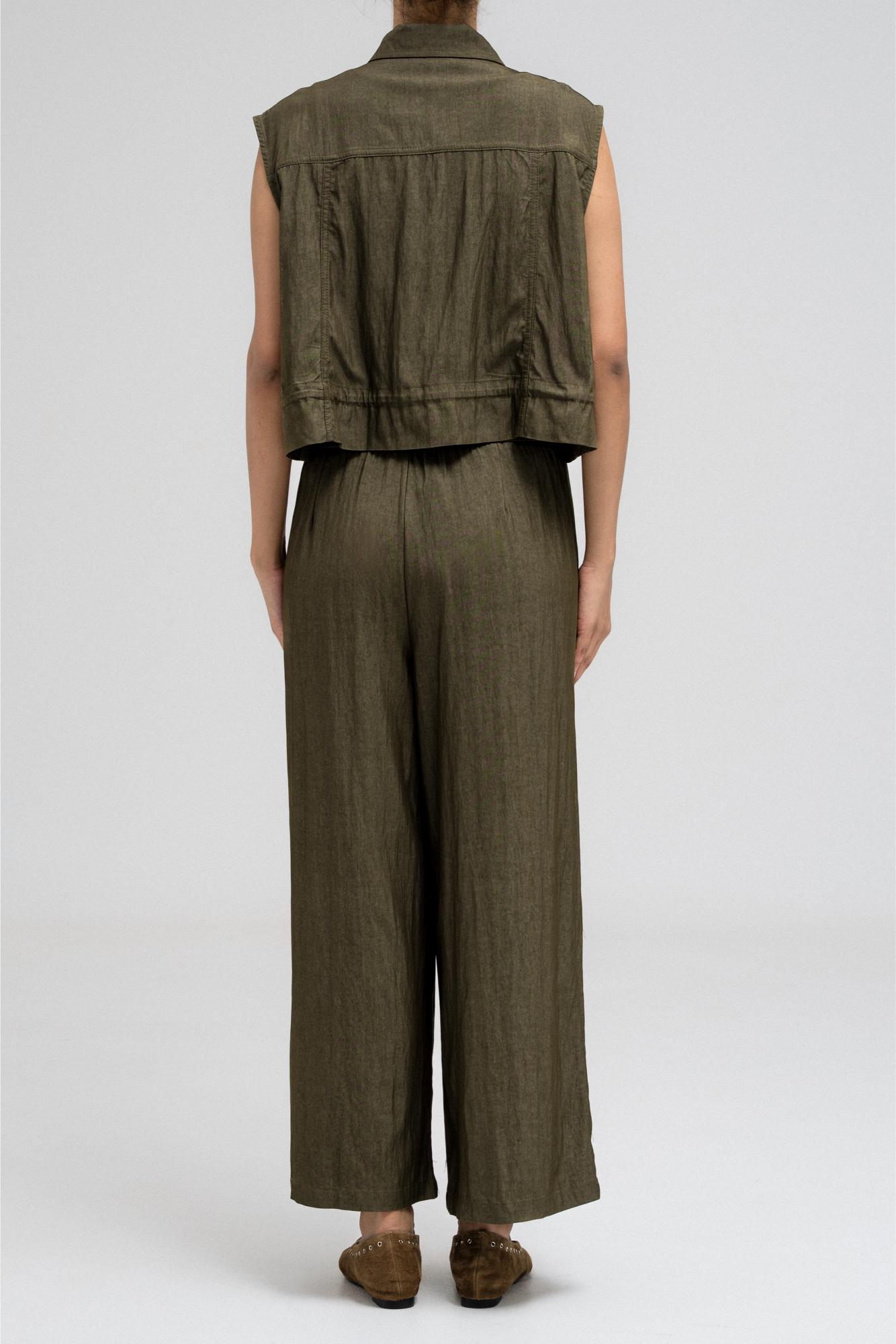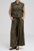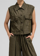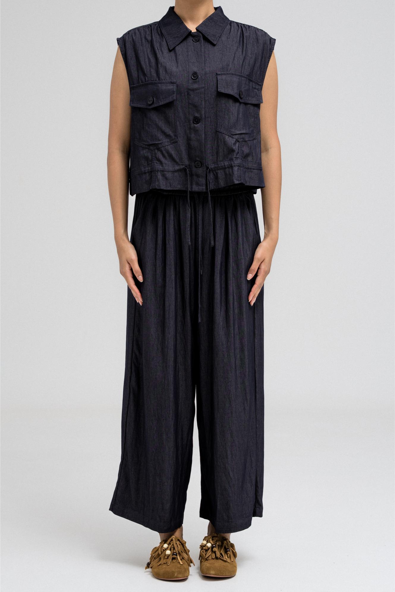 بلوزة عملية بدون أكمام، تتميز بياقة قميص أنيقة وأزرار أمامية للإغلاق. تحتوي على جيبين على الصدر بغطاء وأزرار للإغلاق، مما يضفي عليها لمسةً مستوحاة من ملابس الكارجو. يأتي طرفها مزودًا برباط، ما يسمح لكِ بتضييقها وتنسيقها كما يحلو لكِ. مثالية للتنسيق مع البنطال المتناسق لإطلالة متكاملة ومتناسقة.
