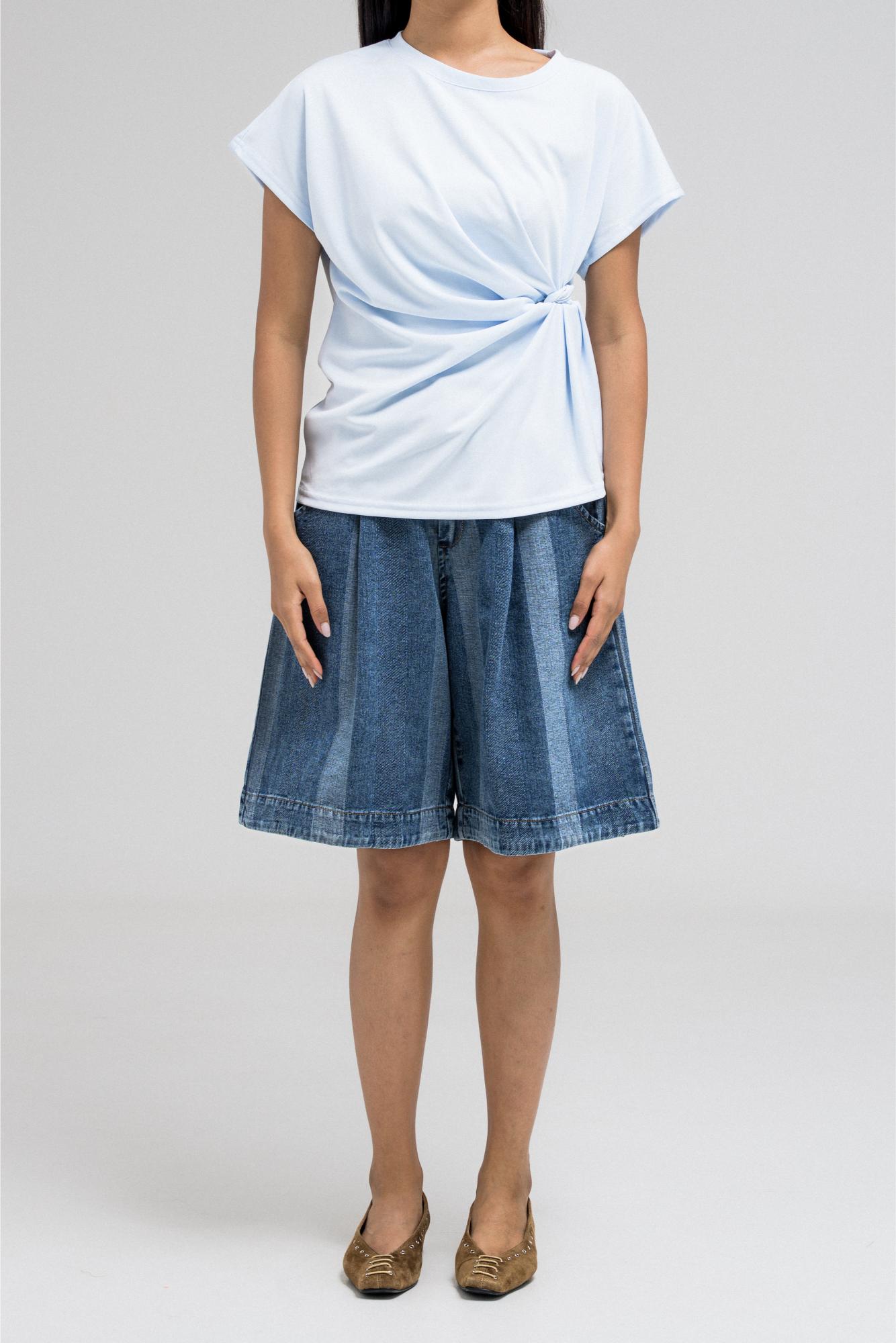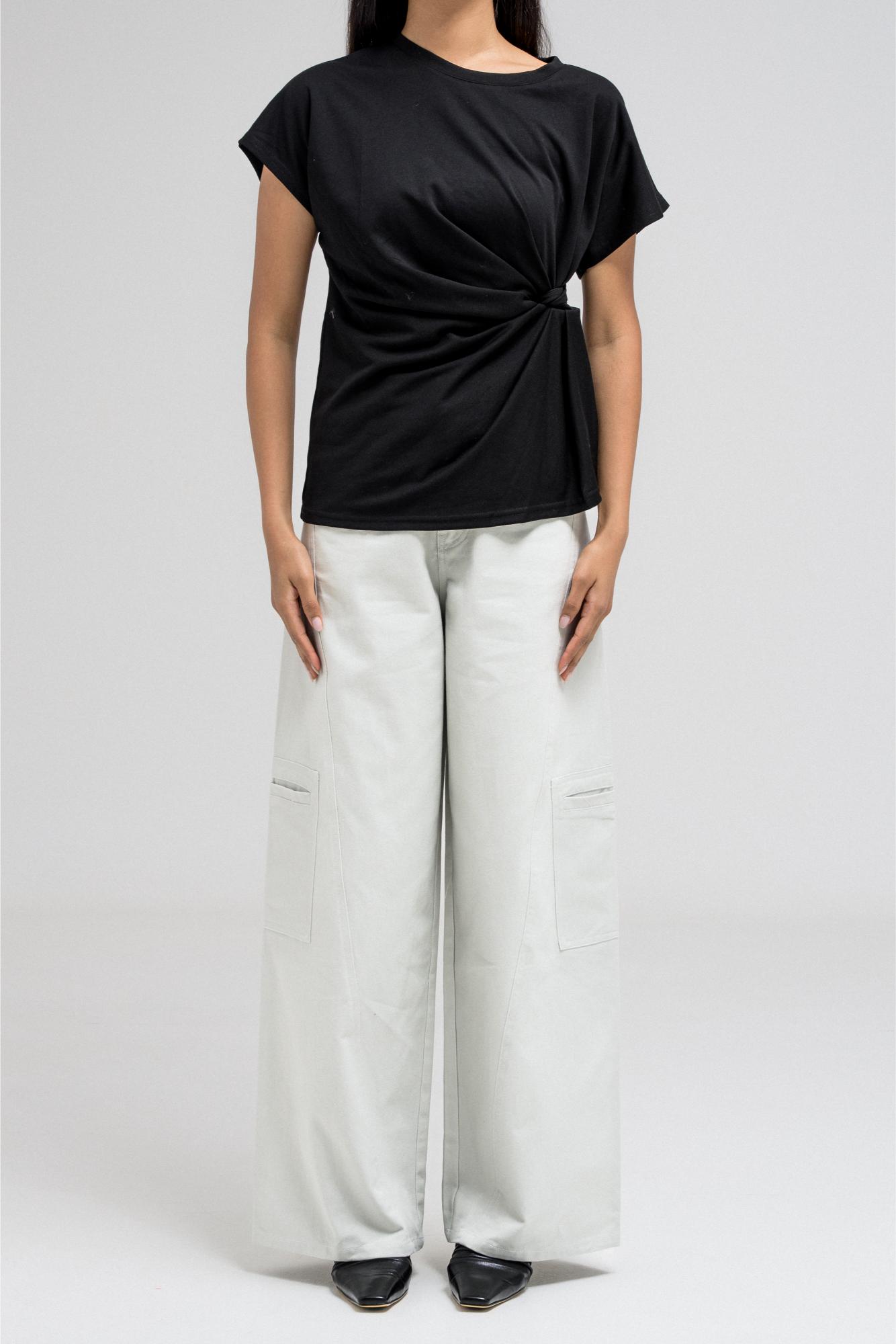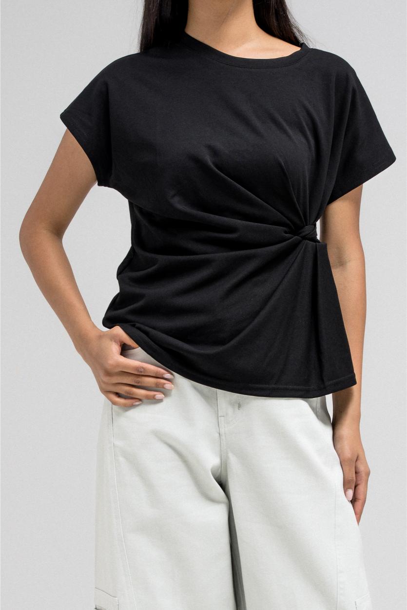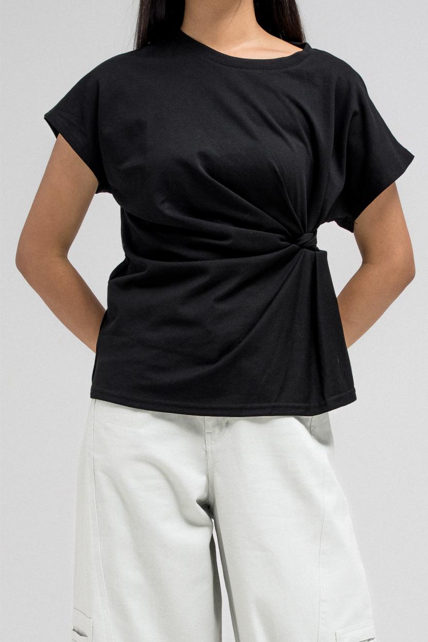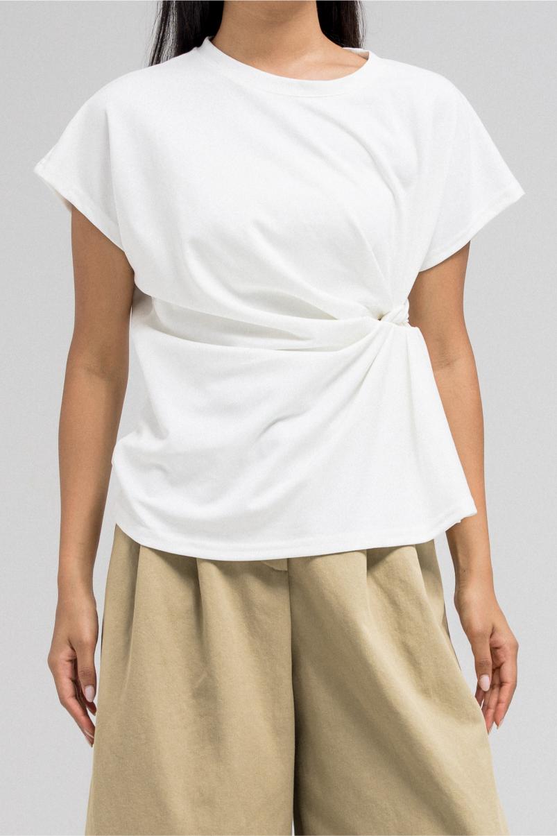 بلوزة بأكمام قصيرة بتصميم عقدة جانبية ناعمة تُضفي لمسةً أنيقةً ملفوفةً. مصنوعة من قماش خفيف الوزن وانسيابي.