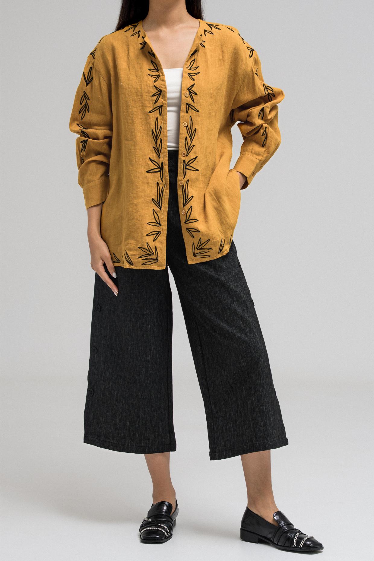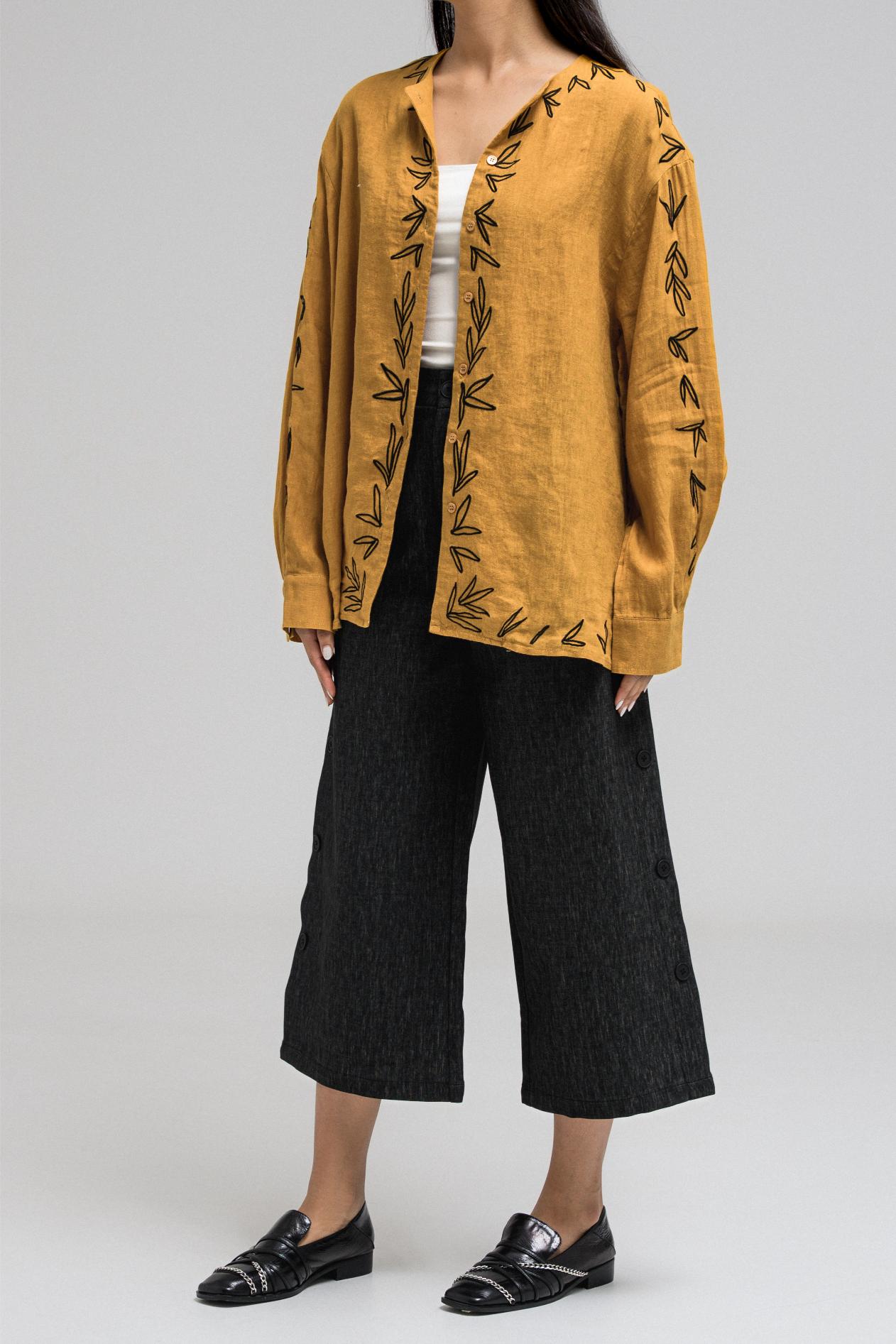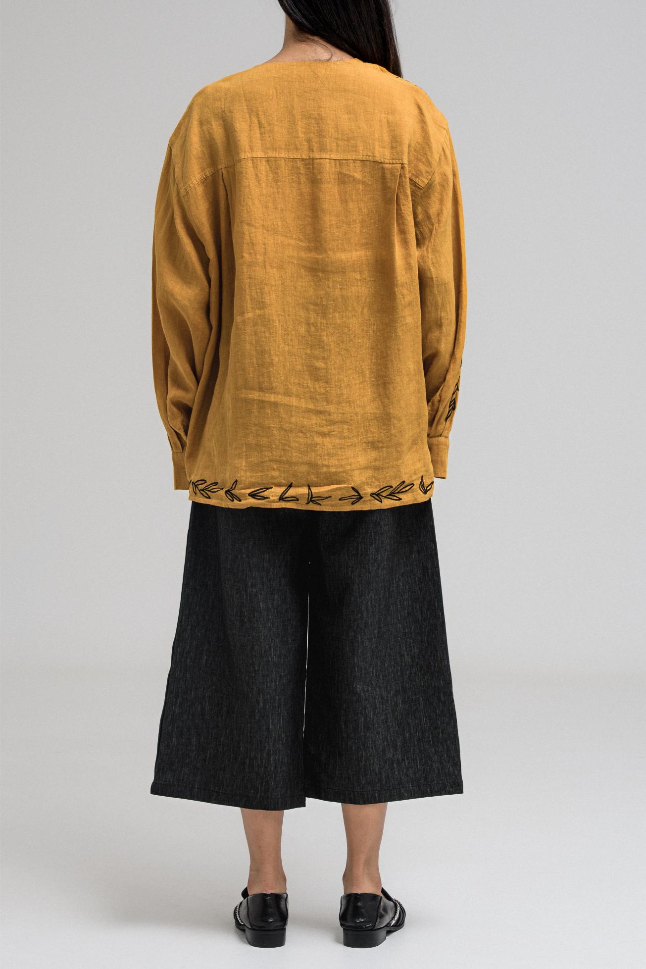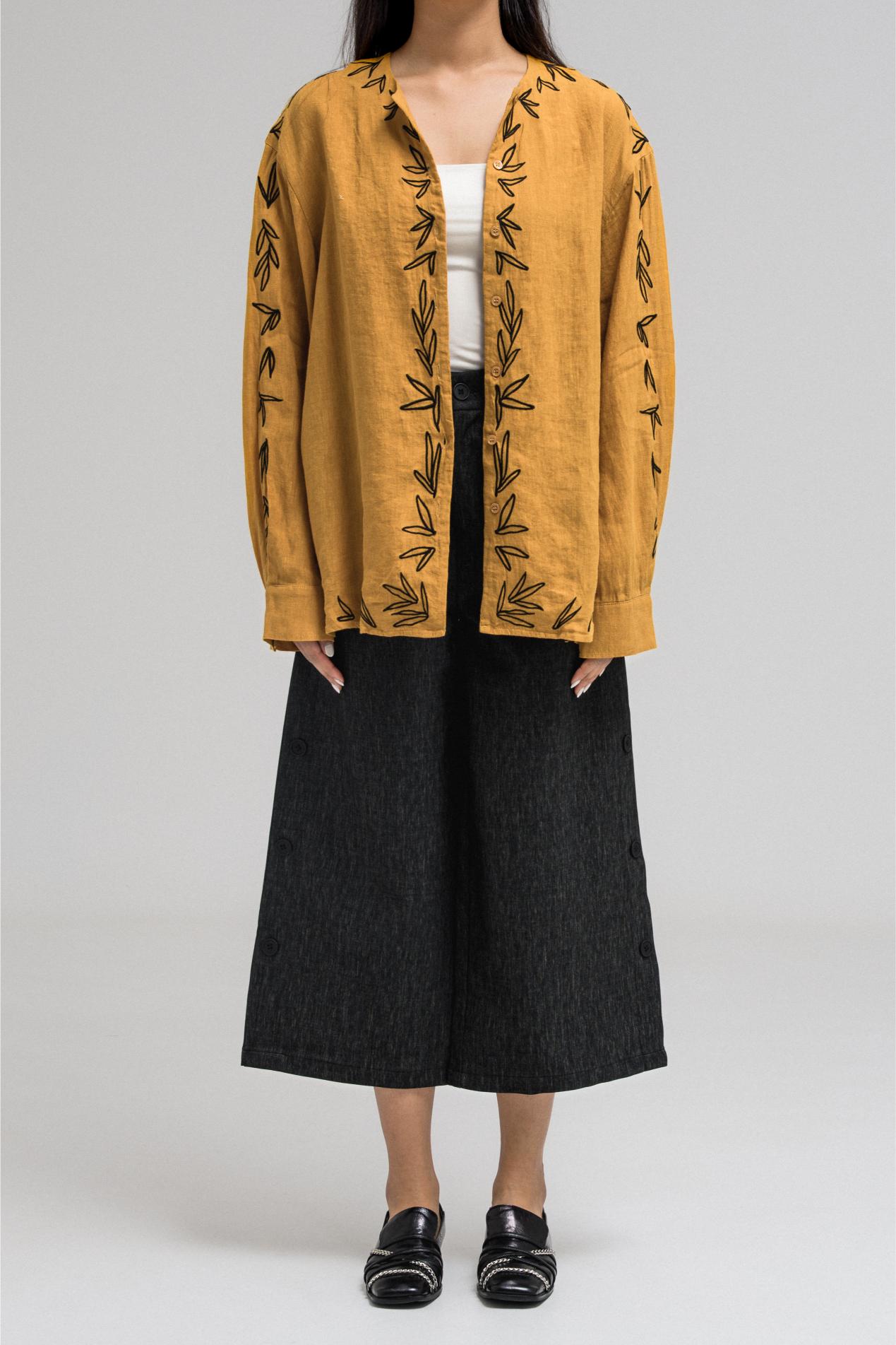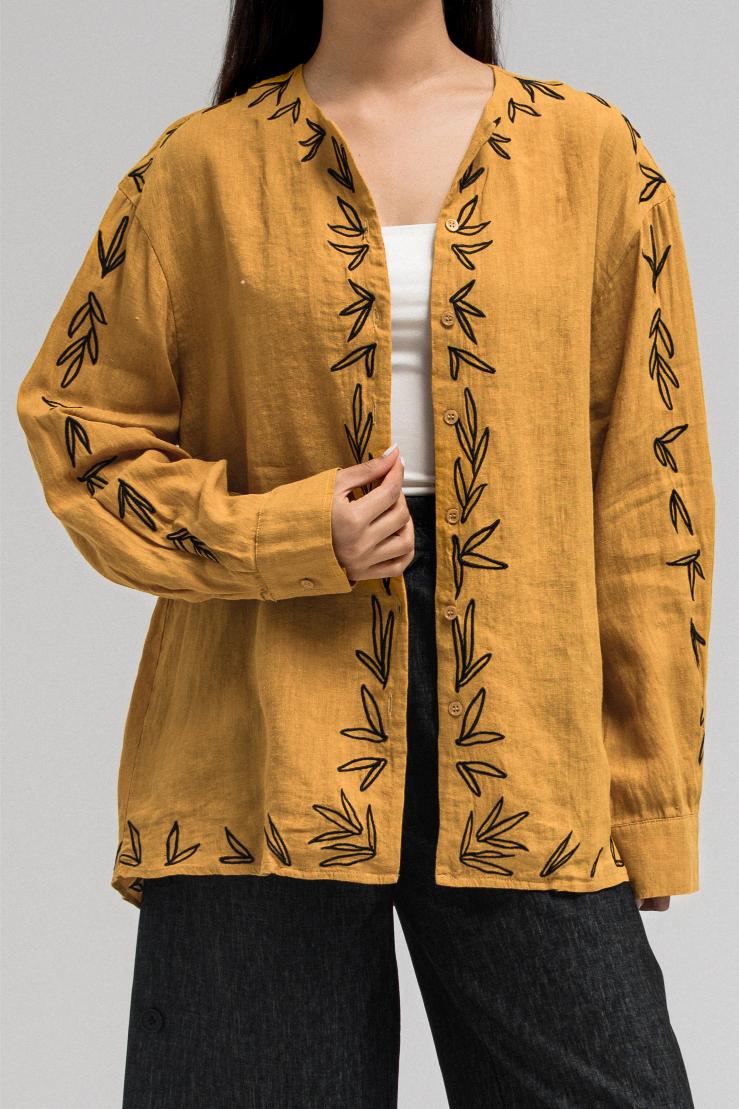 يتميز هذا القميص الكتاني الخفيف بأكمام طويلة وأزرار أمامية للإغلاق، مثالي للارتداء فوق ملابس أخرى أو بمفرده. يبرز التطريز الزخرفي على طول فتحة الأزرار وحاشية القميص.
