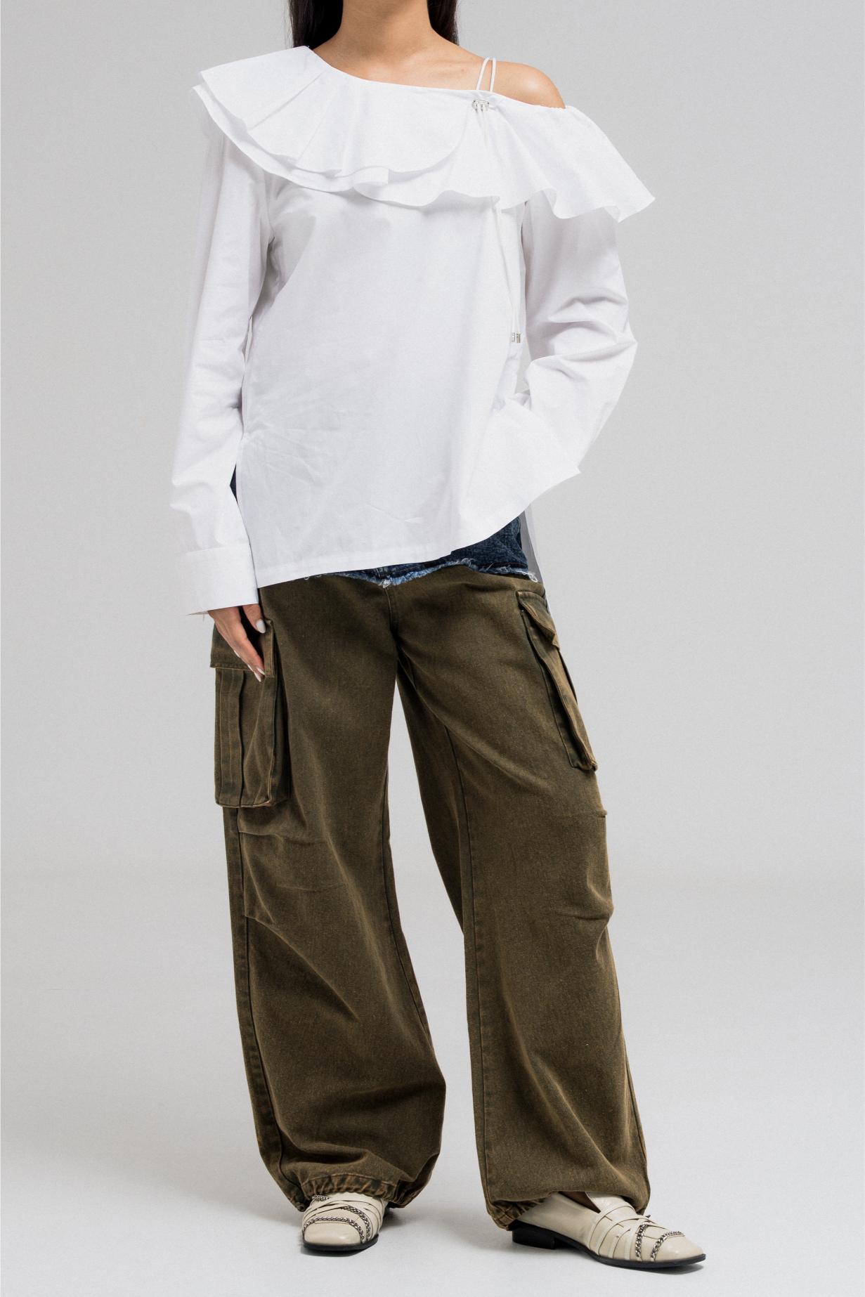 تتميز هذه البلوزة الفريدة بأكمام طويلة وقصّة مكشوفة الكتفين على أحد الجانبين، مزينة بتفاصيل خيطية رقيقة لإضفاء لمسة أنثوية. أبرز ما يميزها هو الكشكشة العريضة التي تمتد على الصدر والكتف، مما يضفي عليها حجمًا وطابعًا مرحًا. تبدأ الكشكشة من خط العنق وتنسدل برشاقة بشكل غير متماثل، مما يعزز التصميم العصري والجريء.