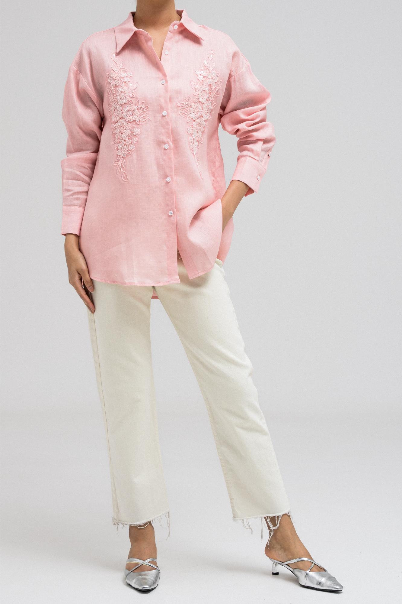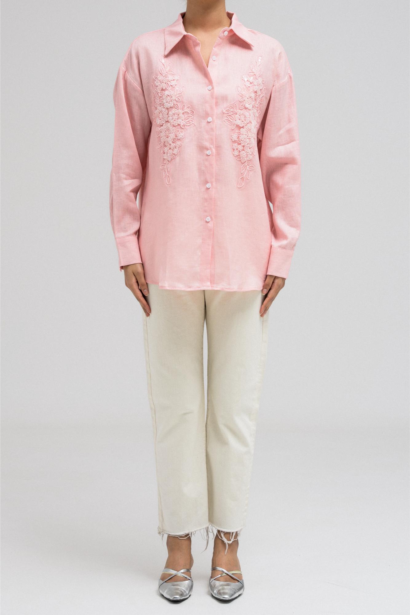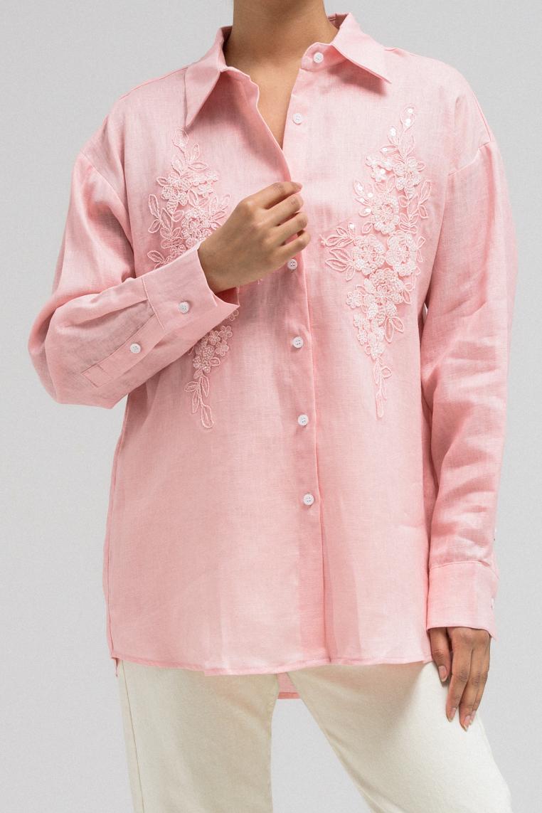 قميص كتان ناعم وخفيف الوزن بياقة كلاسيكية وأزرار أمامية للإغلاق. ما يميز هذه القطعة هو التطريز الزهري الرقيق على الصدر، والمُزين بلمسات تشبه الخرز الصغير، مما يُضفي لمسةً من التألق والملمس الرقيق.