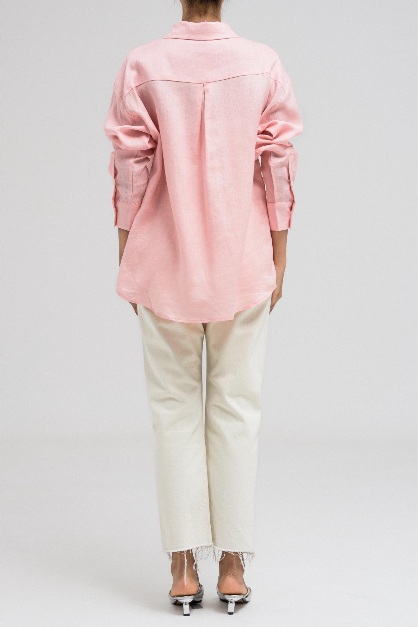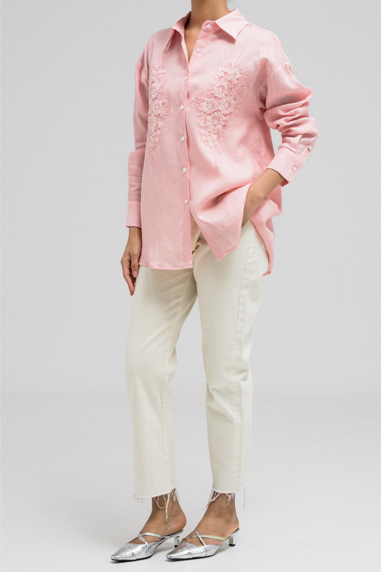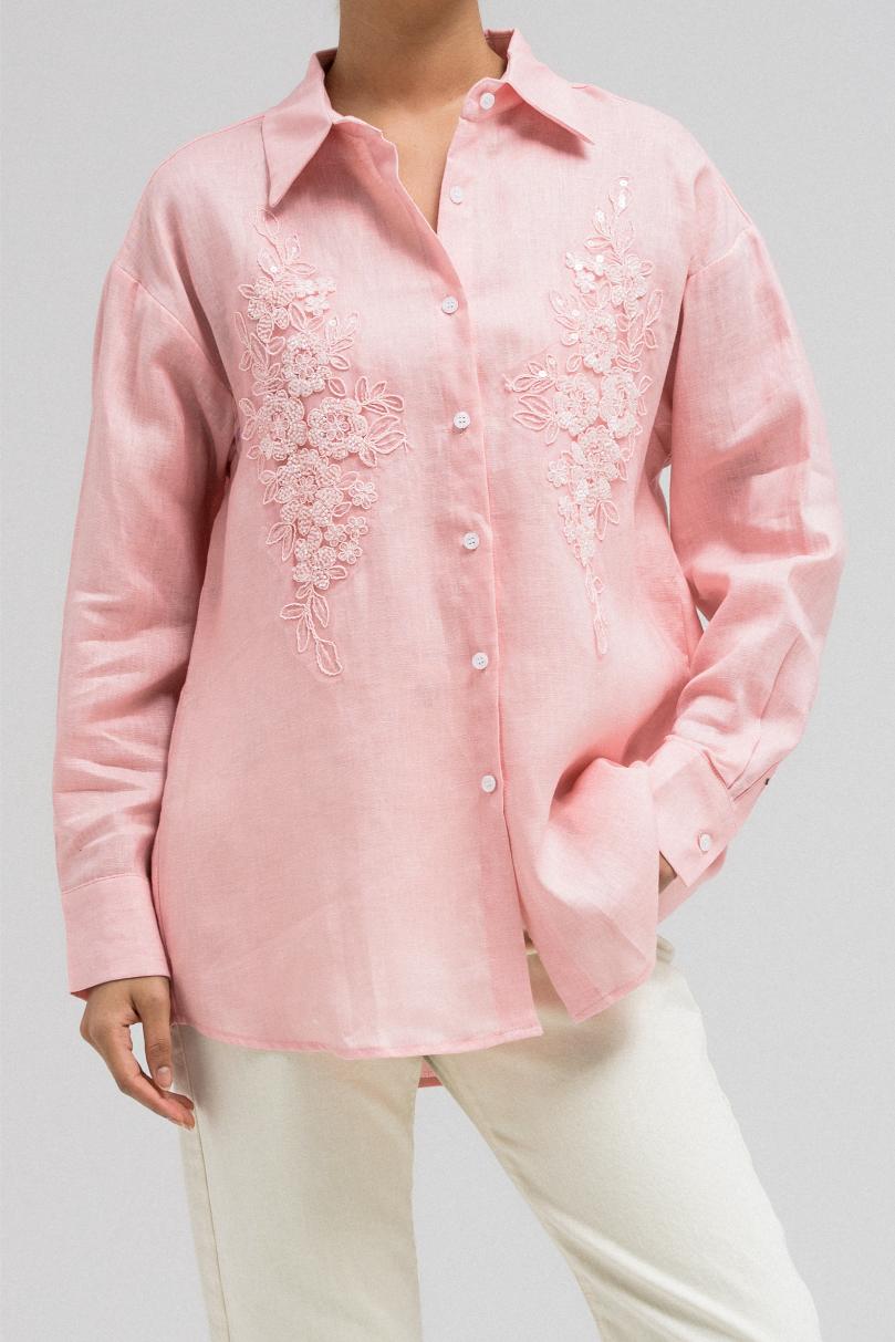 قميص كتان ناعم وخفيف الوزن بياقة كلاسيكية وأزرار أمامية للإغلاق. ما يميز هذه القطعة هو التطريز الزهري الرقيق على الصدر، والمُزين بلمسات تشبه الخرز الصغير، مما يُضفي لمسةً من التألق والملمس الرقيق.
