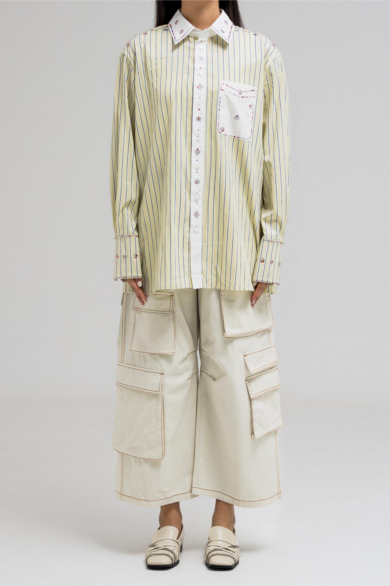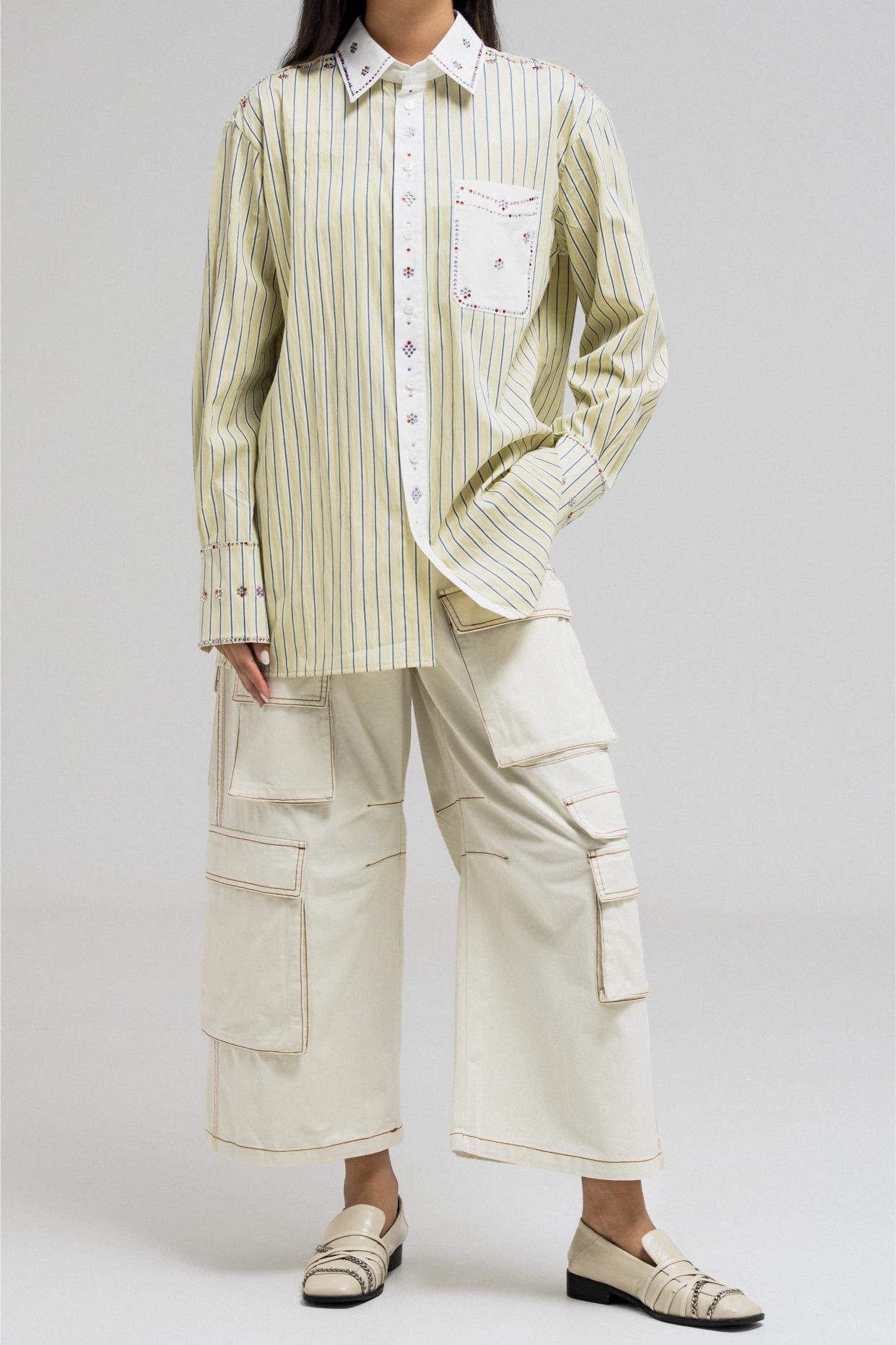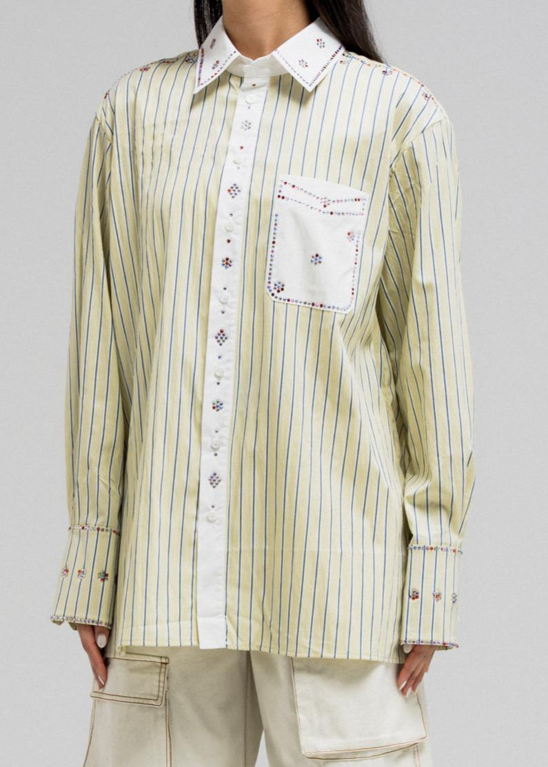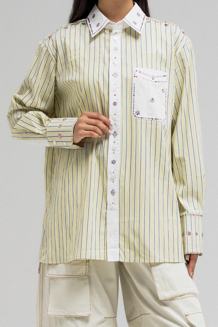 يتميز هذا القميص بنمط خطوط عمودية في جميع أنحائه وياقة قميص كلاسيكية. يتضمن التصميم زر إغلاق أمامي وجيبًا بلون متباين على الصدر. ما يميز هذه القطعة هو زينة أحجار الراين التي تُحيط بالياقة والأكمام وتمتد على طول فتحة الأزرار، مما يضفي عليها لمسة مرحة متألقة.