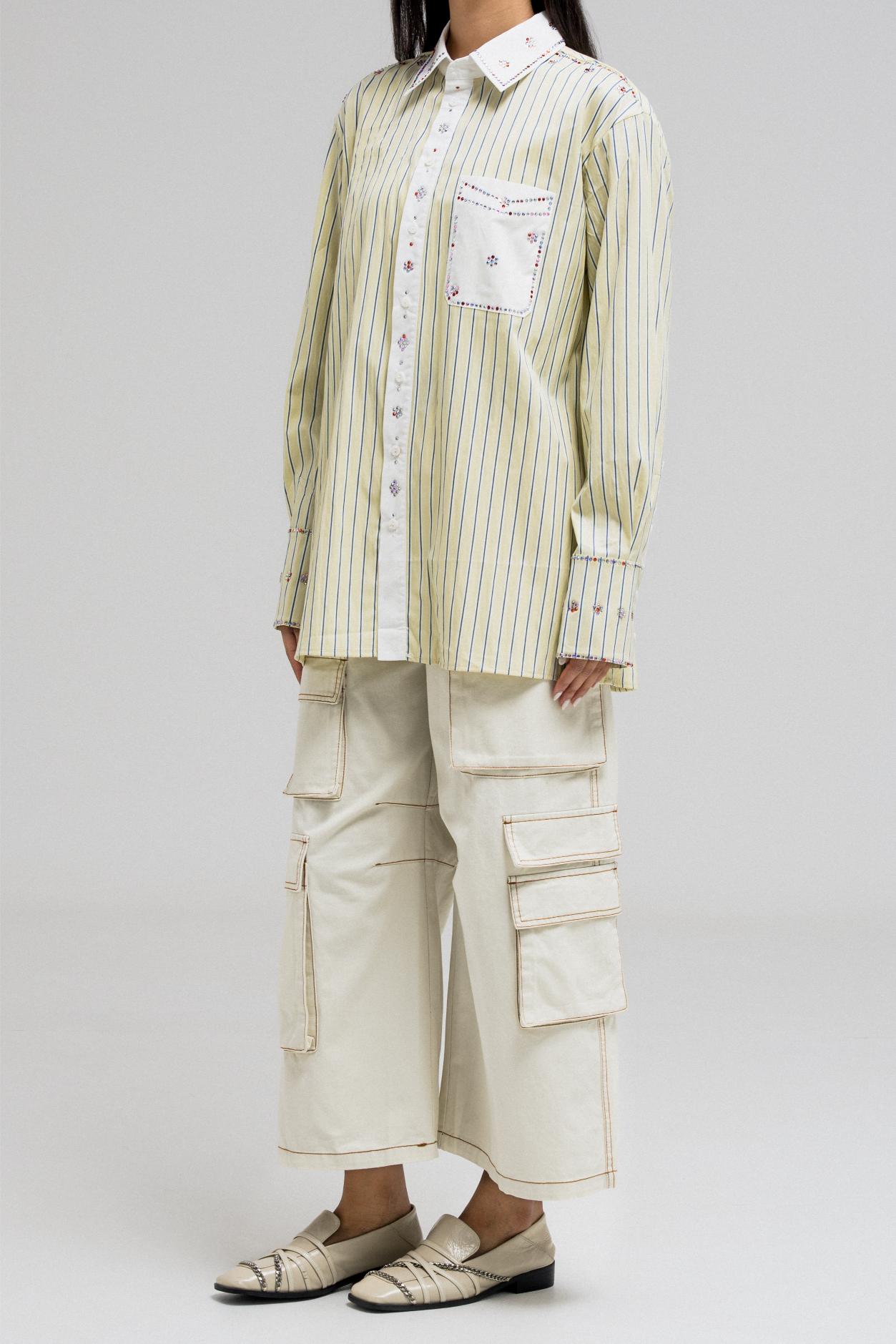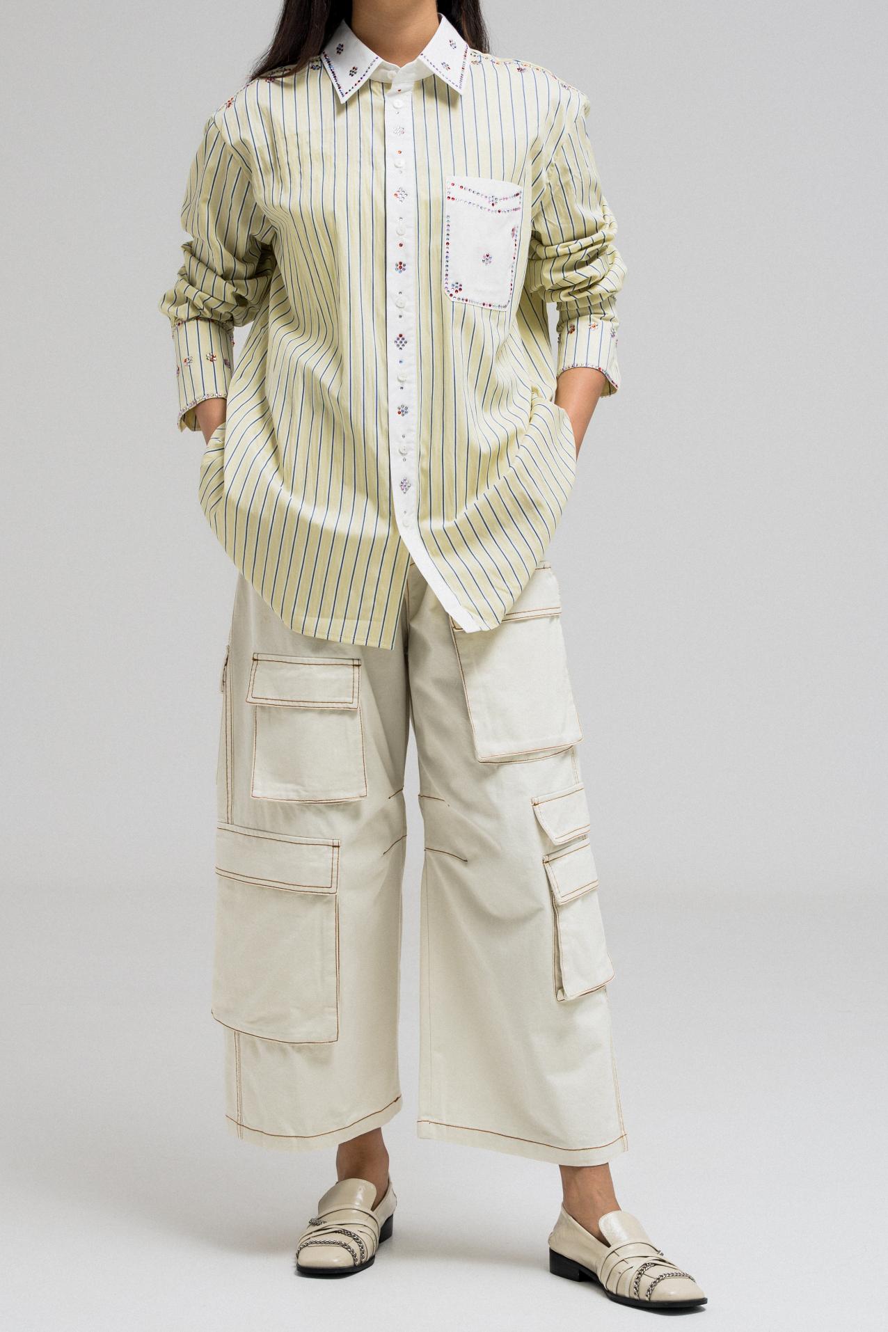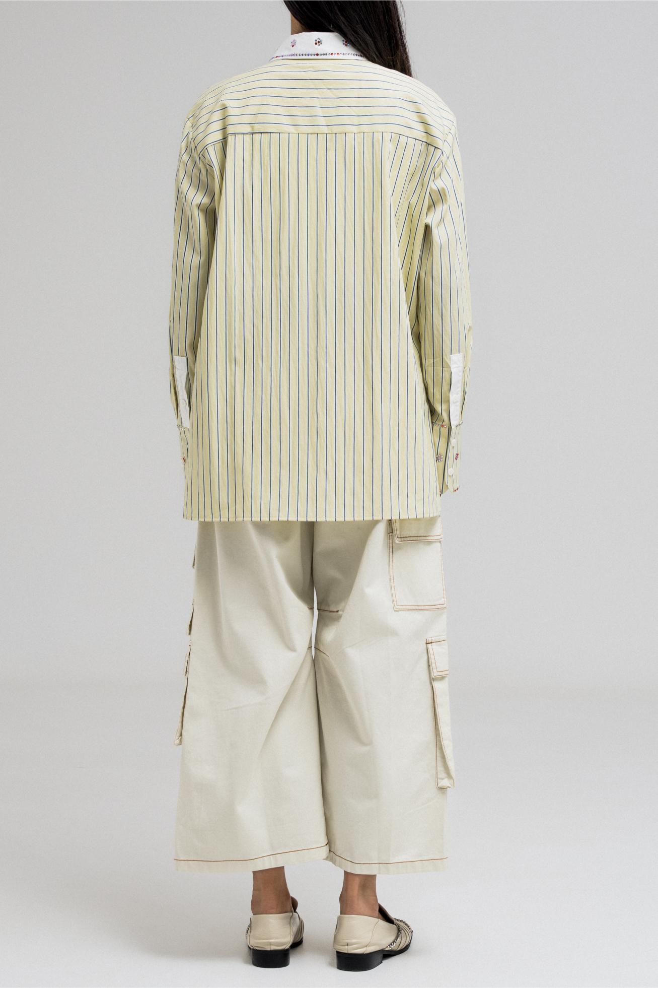 يتميز هذا القميص بنمط خطوط عمودية في جميع أنحائه وياقة قميص كلاسيكية. يتضمن التصميم زر إغلاق أمامي وجيبًا بلون متباين على الصدر. ما يميز هذه القطعة هو زينة أحجار الراين التي تُحيط بالياقة والأكمام وتمتد على طول فتحة الأزرار، مما يضفي عليها لمسة مرحة متألقة.