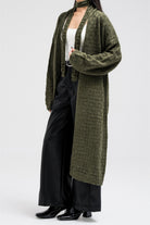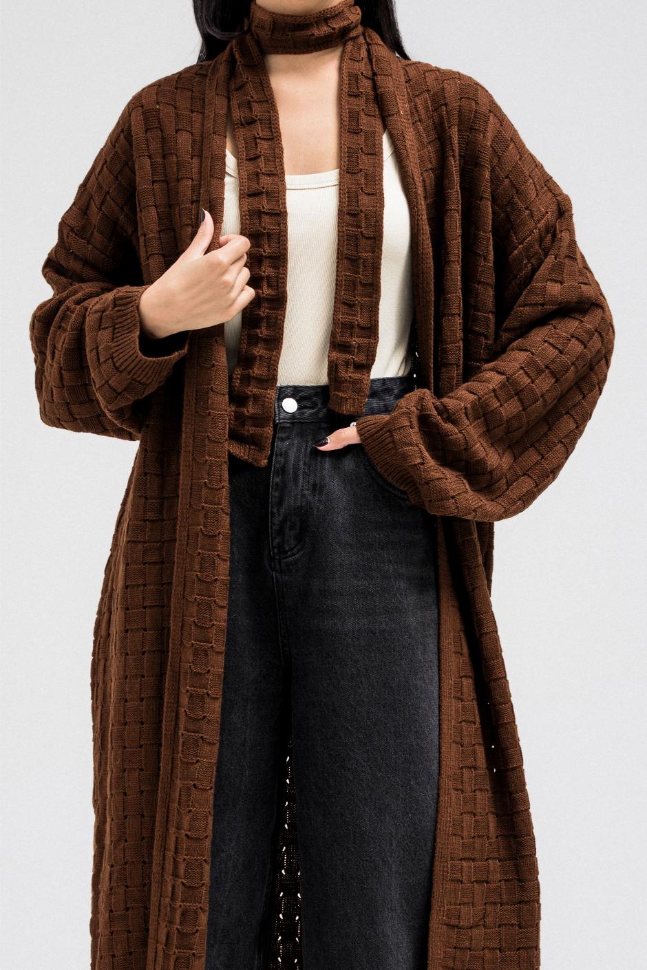 A cozy long cardigan designed with a soft textured knit and an open-front silhouette. It comes with a matching belt that can be styled around the waist for a cinched look or worn as a scarf for an elevated layered style. A versatile piece perfect for fall and winter.