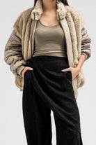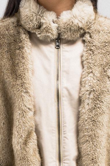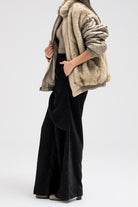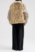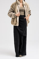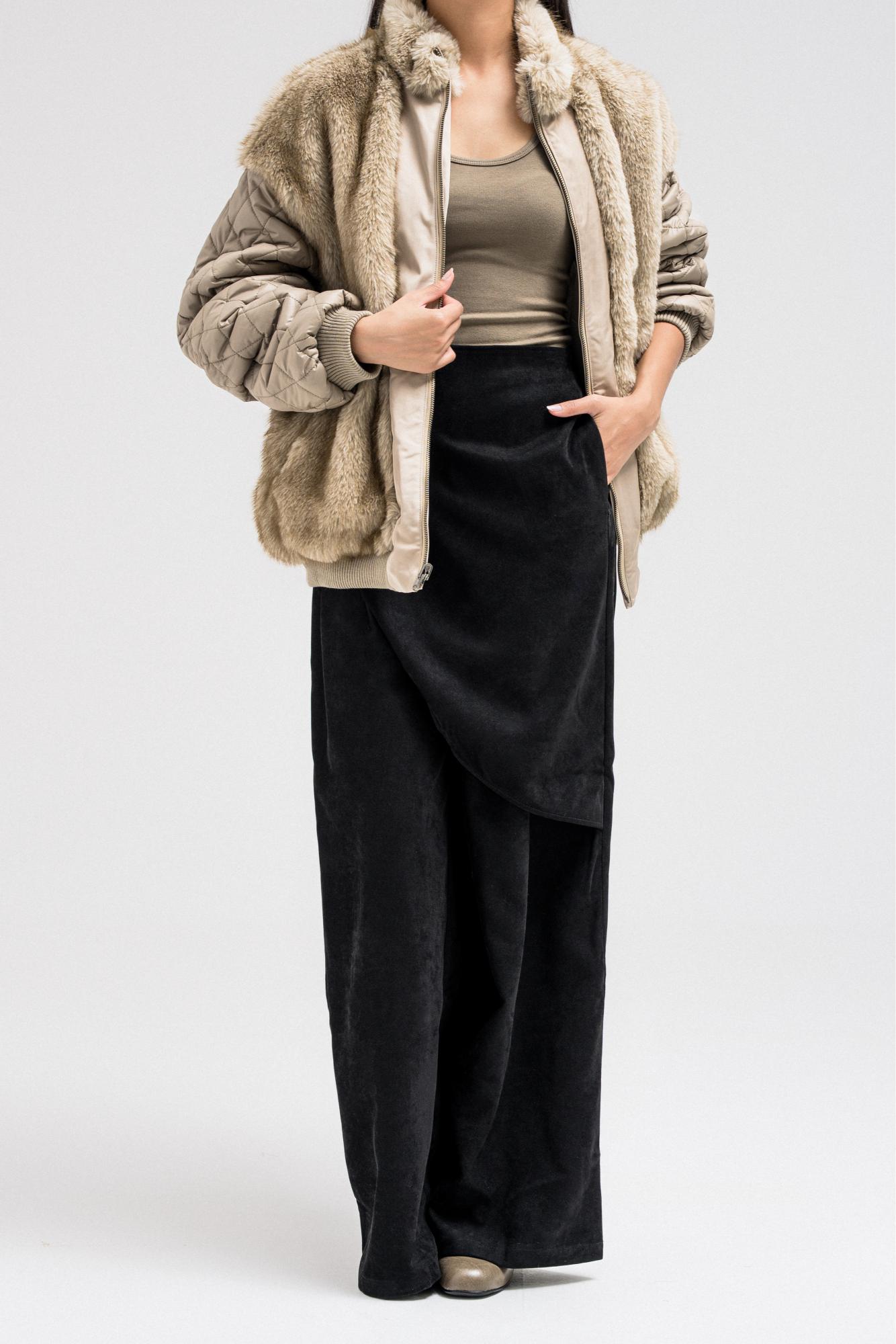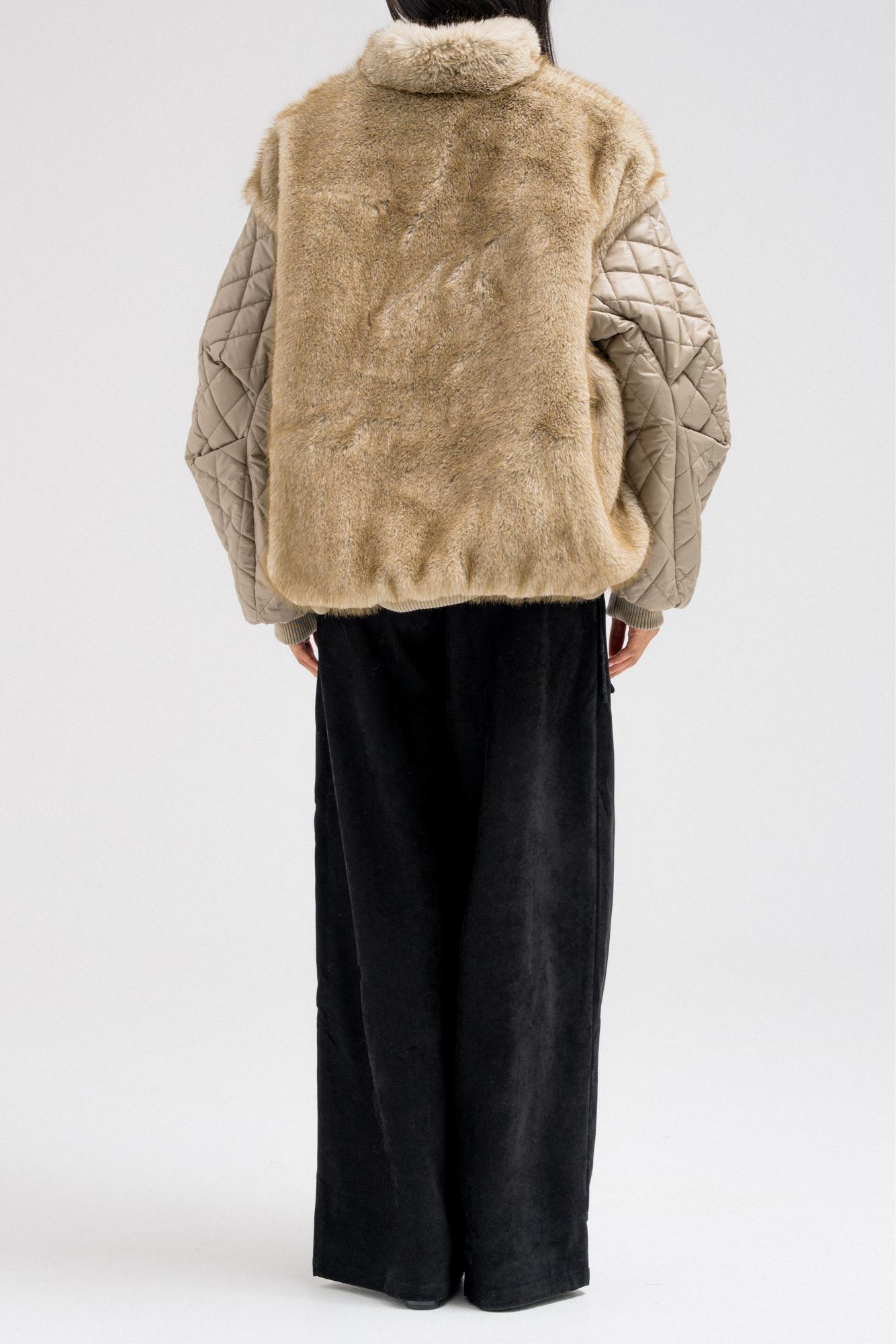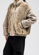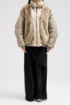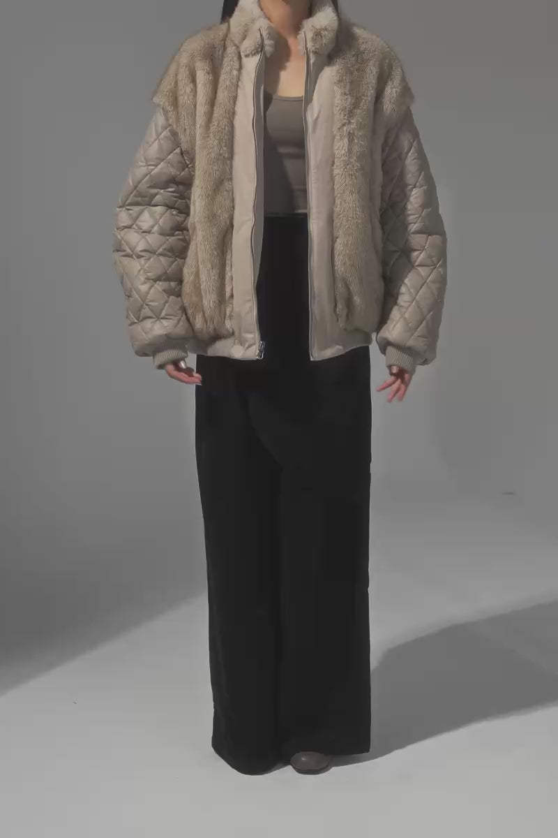 This unique jacket features a luxurious soft fur front paired with quilted bomber-style sleeves, blending comfort with contemporary edge. It includes a zipper closure and a cozy high neck for extra warmth. What makes it special is its reversible design, you can flip it inside out and wear it as a full bomber jacket, showcasing the quilted texture on the outside while keeping the fur on the inside for a warm, snug feel.