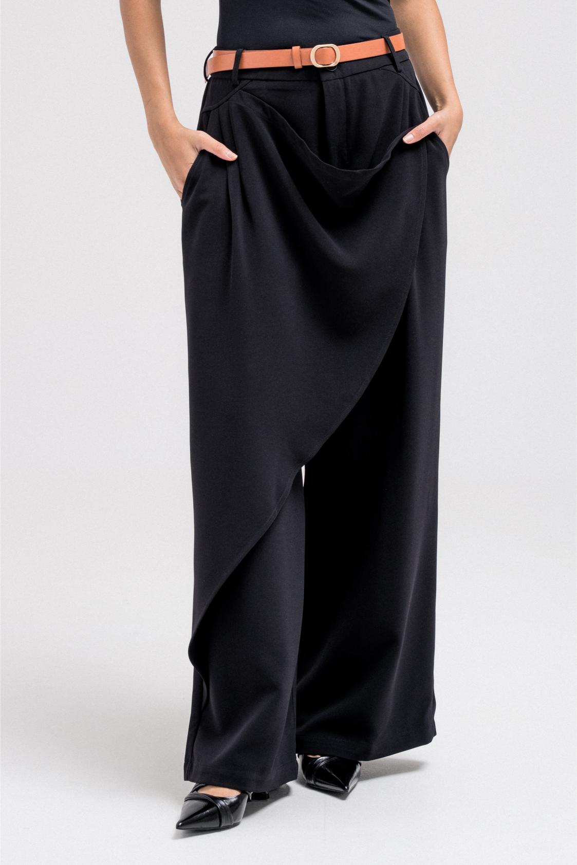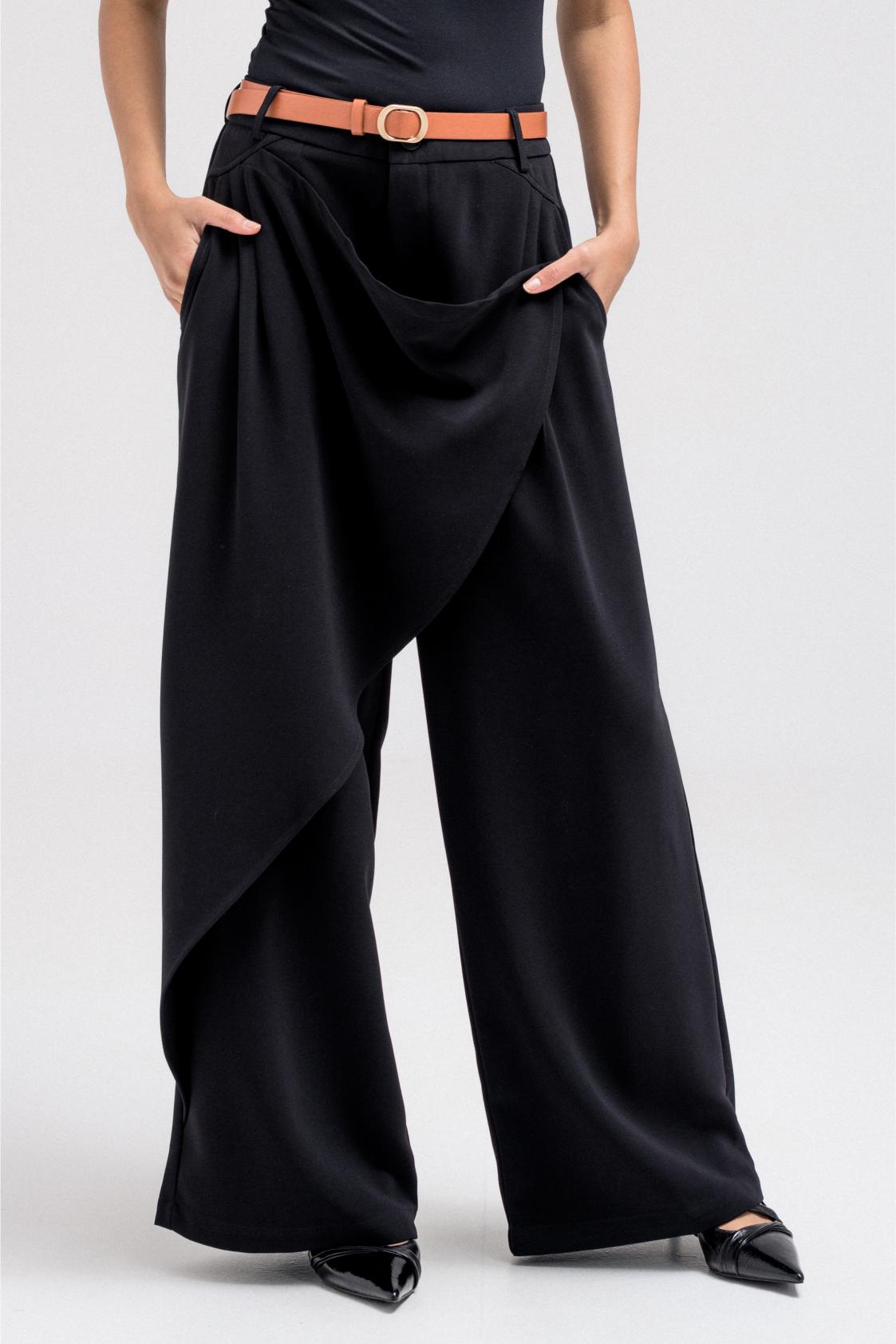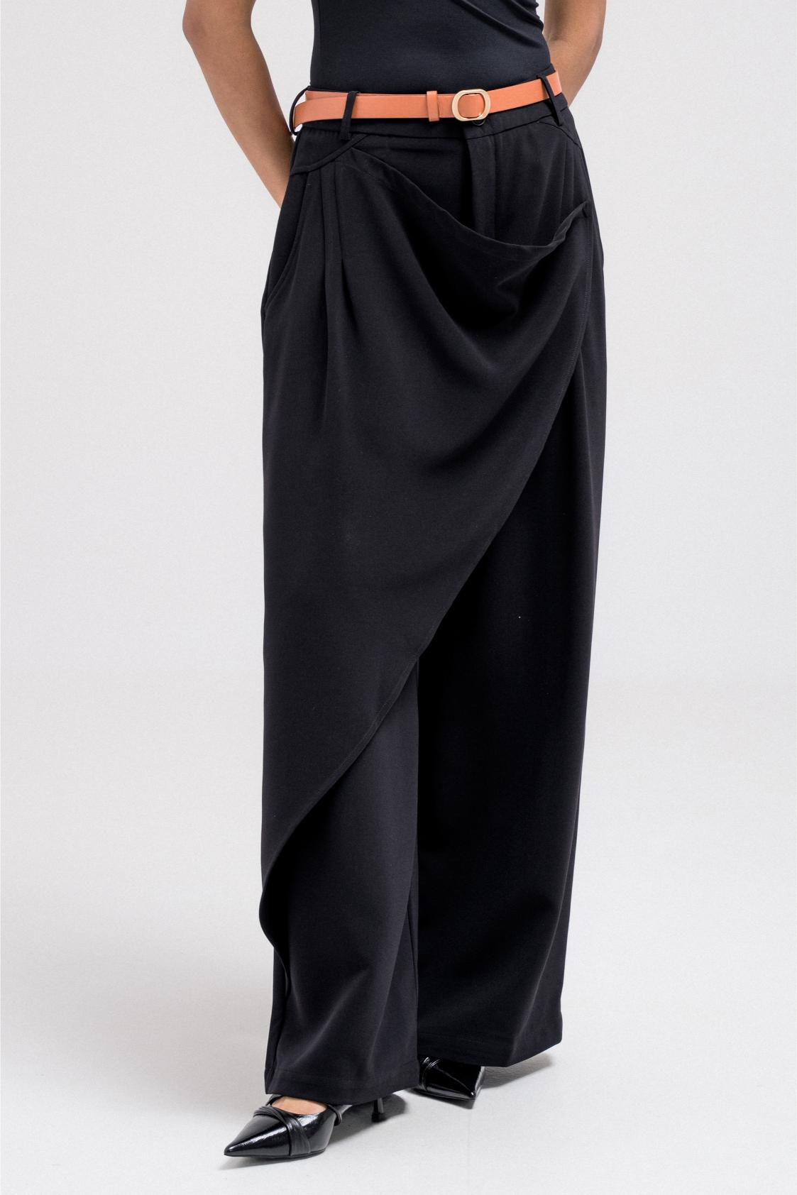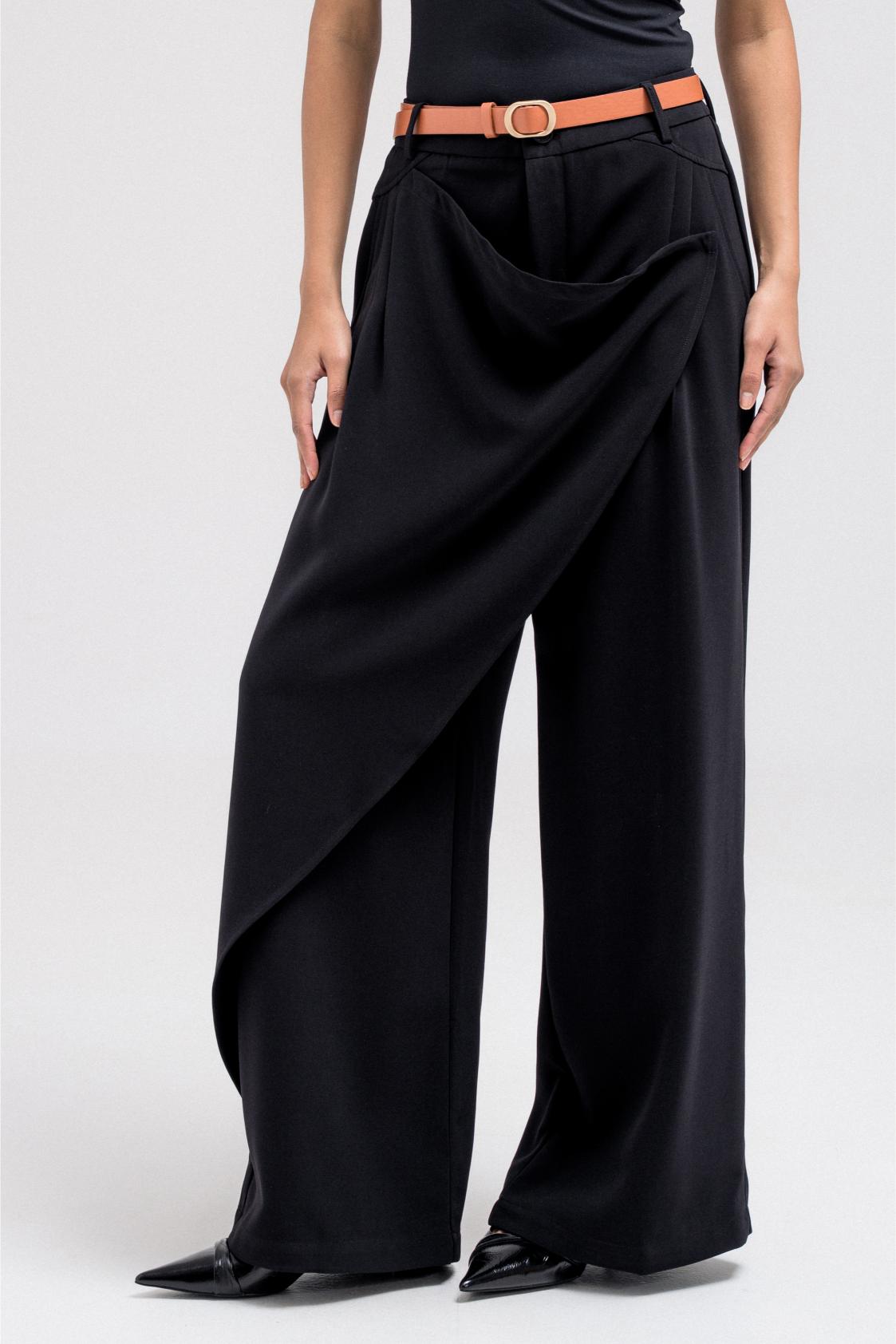Wide-leg pants designed with an asymmetrical wrap-style panel across the front that adds dimension and movement. The layered fabric creates a draped effect while maintaining a structured waistband