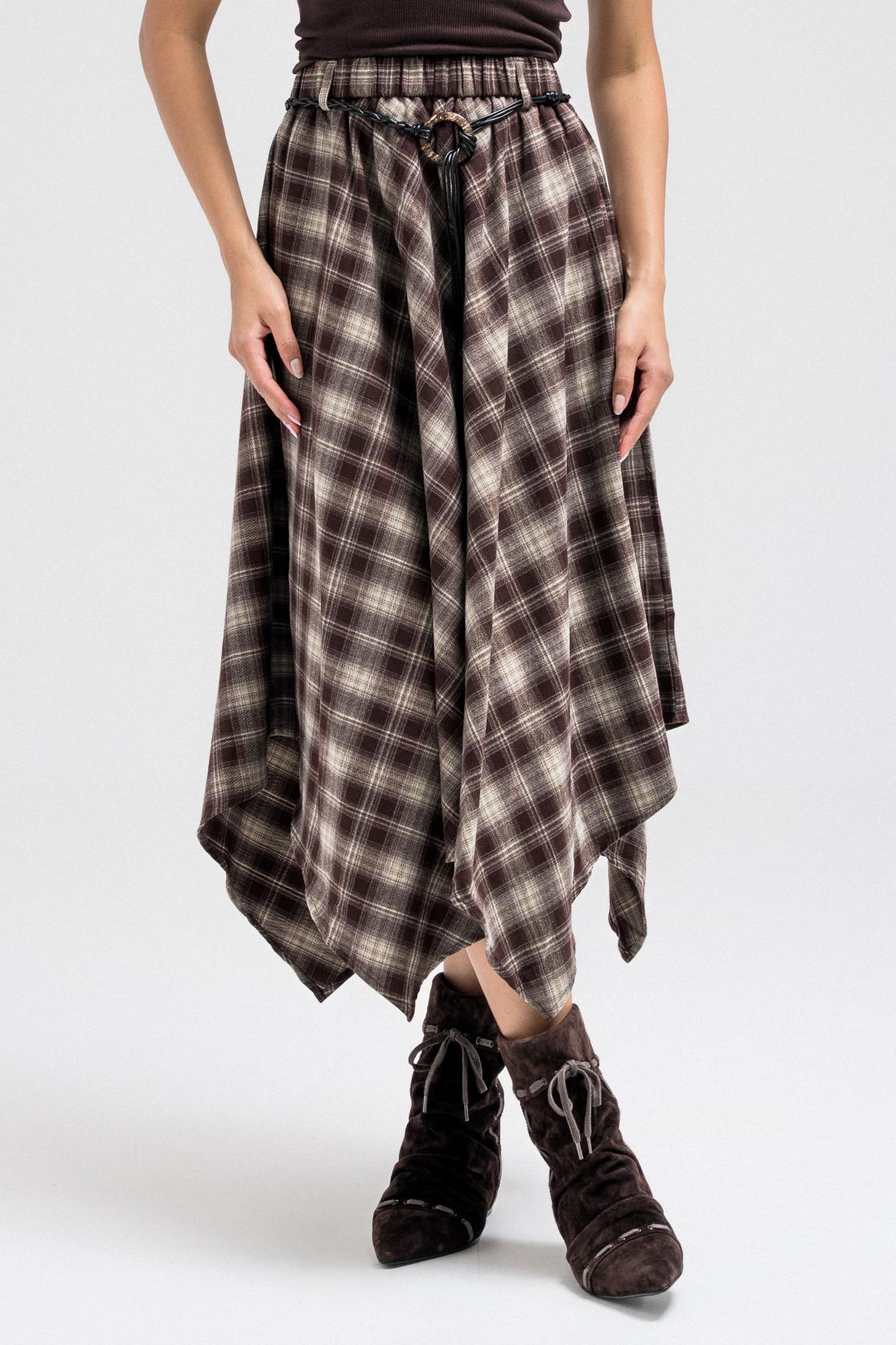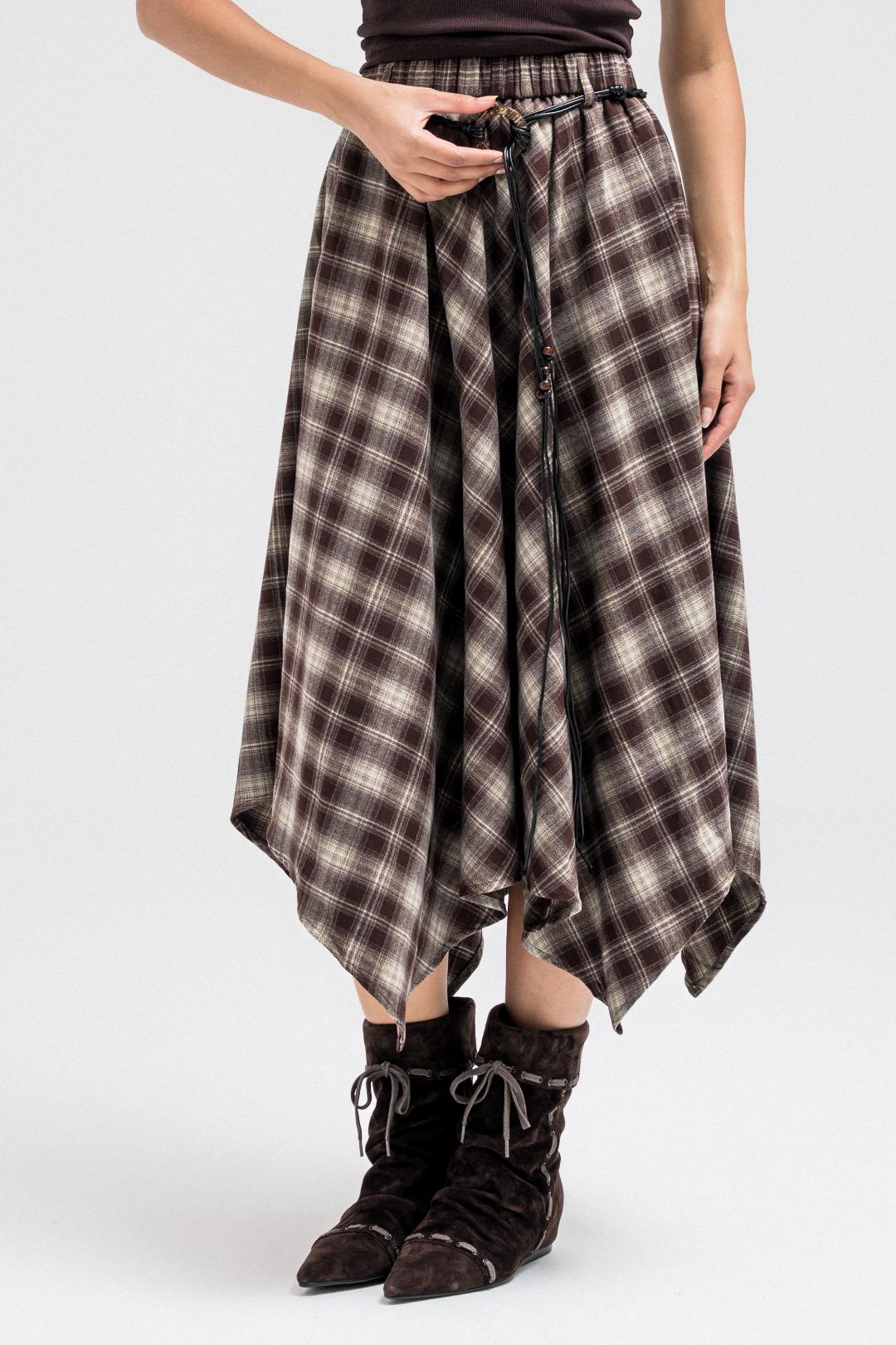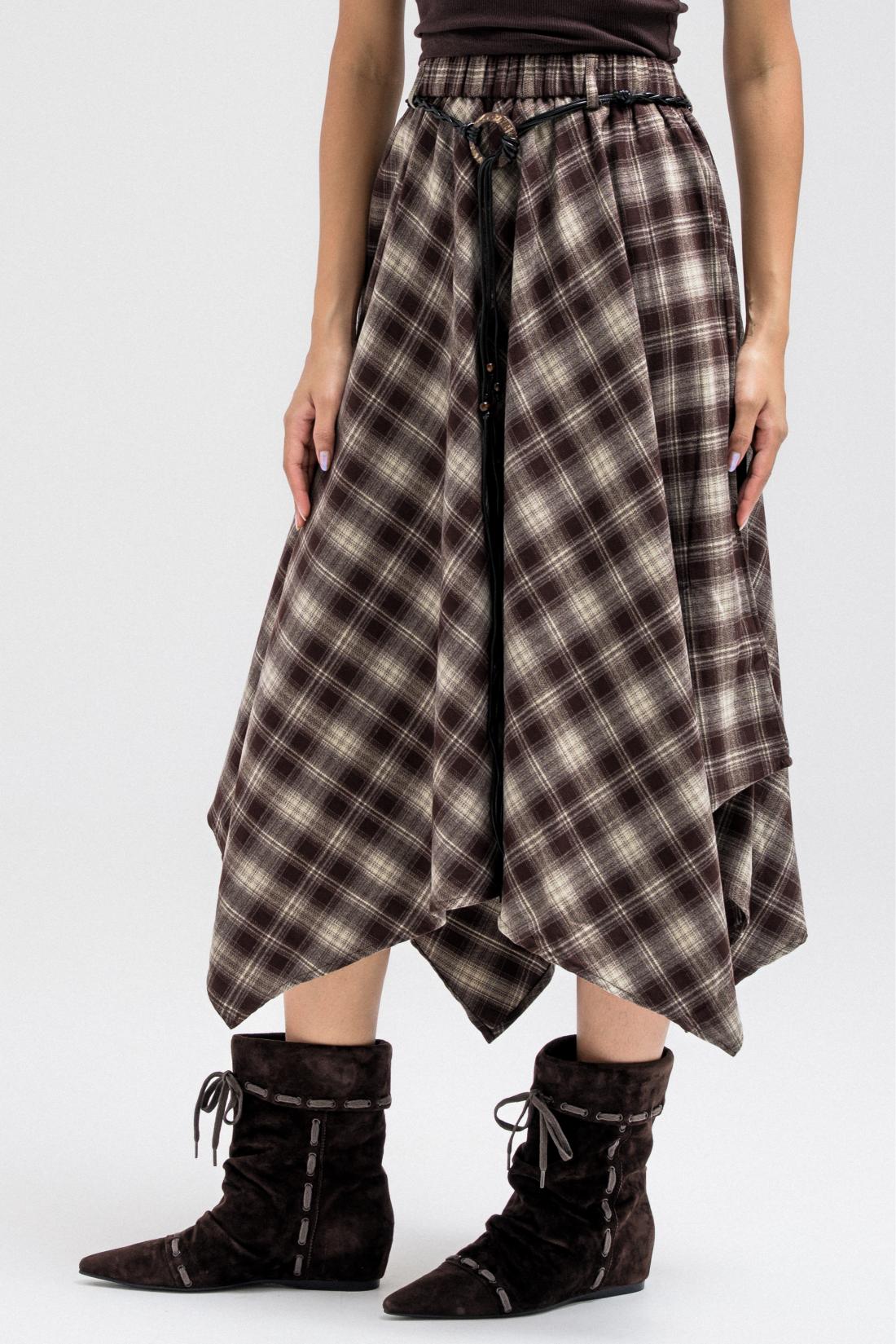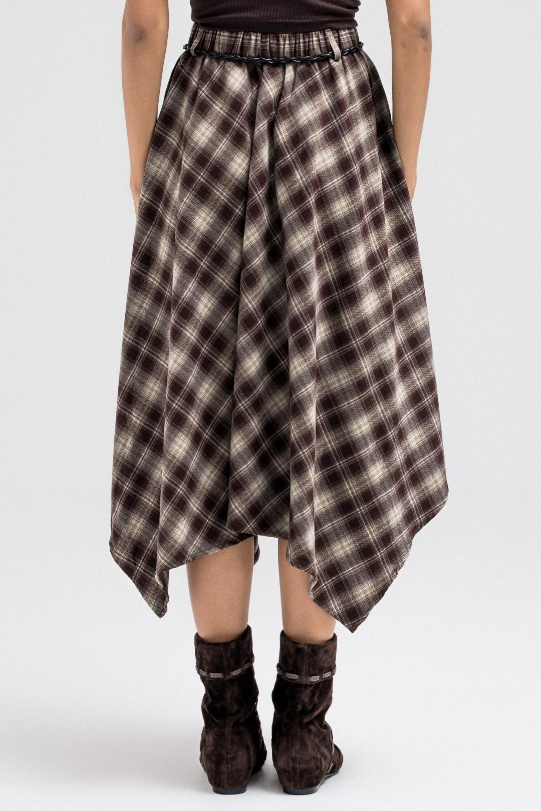 This skirt features a flowy asymmetric hem and a classic plaid pattern, giving it a stylish and modern silhouette. It has an elastic waistband for added comfort and easy wear. The skirt also comes with a thin leather belt, allowing you to cinch the waist and add a polished, elevated touch to the look.