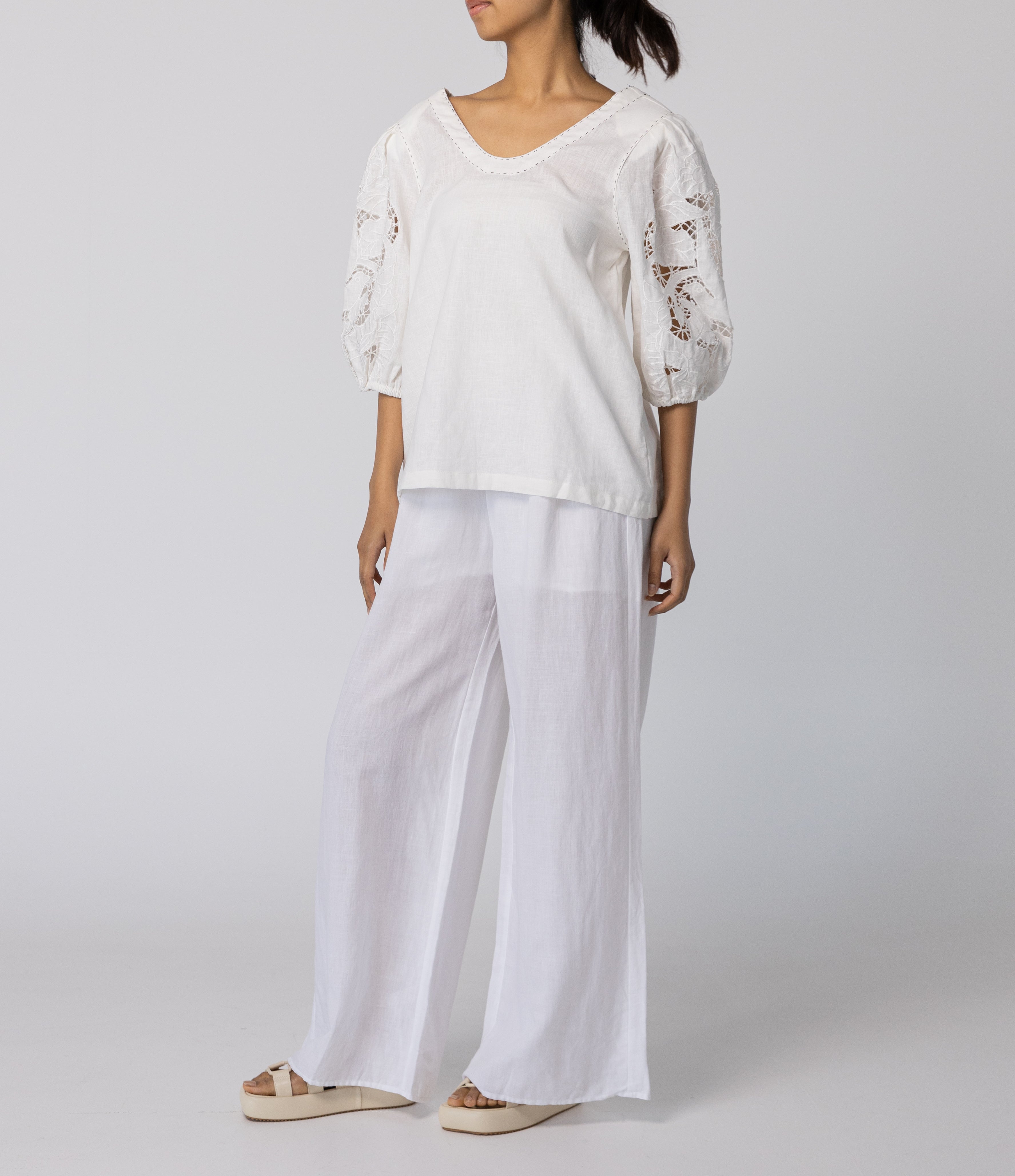 بلوزة من الكتان مع تصميم مزهر بأكمام