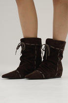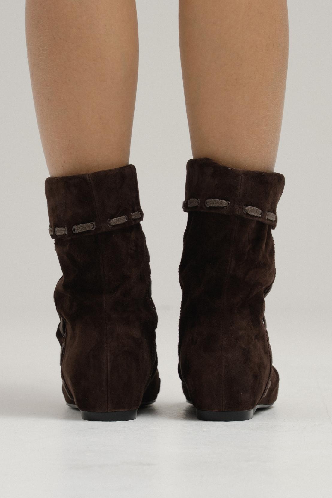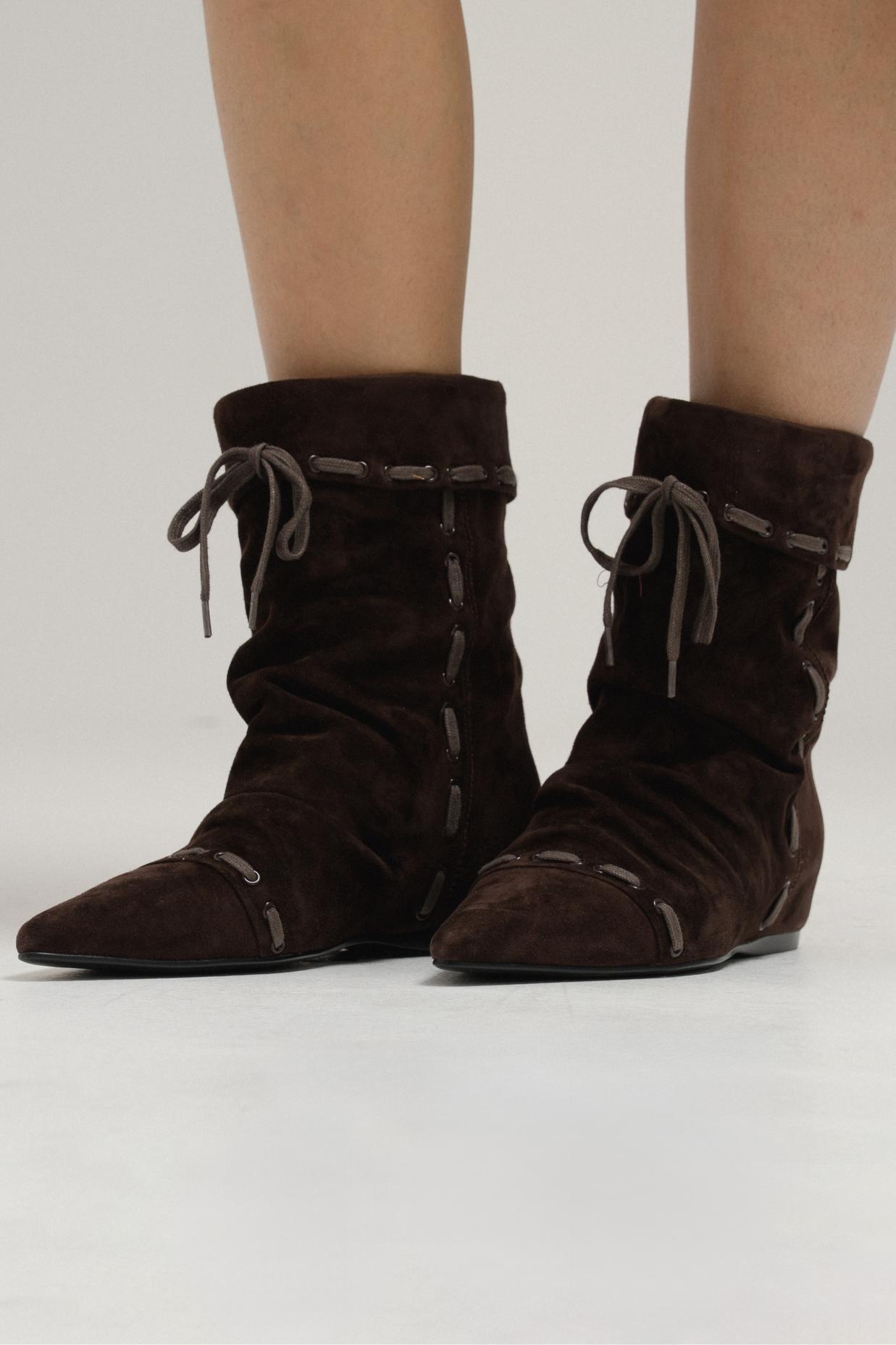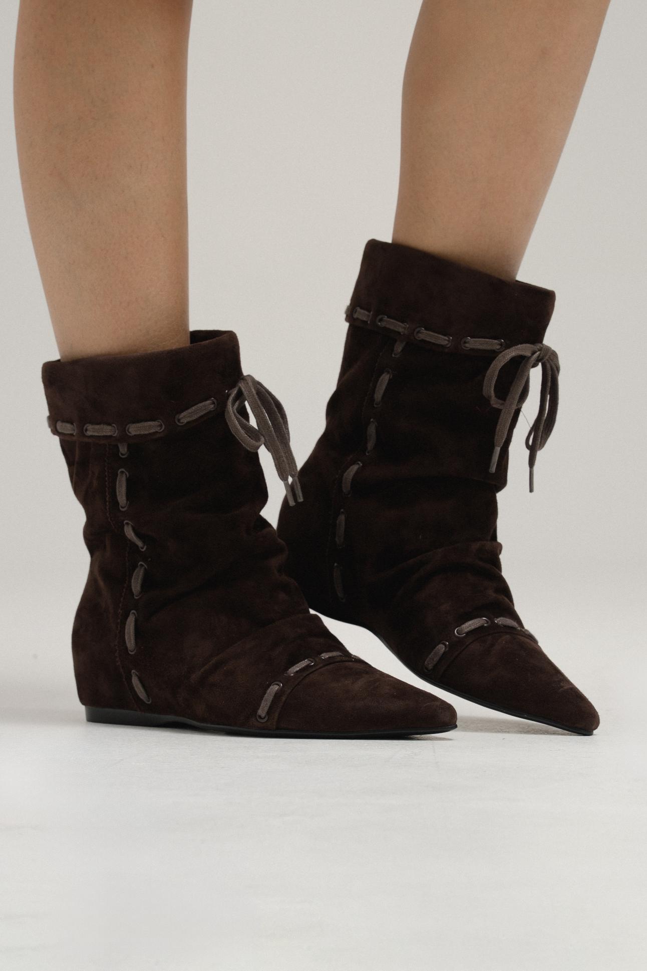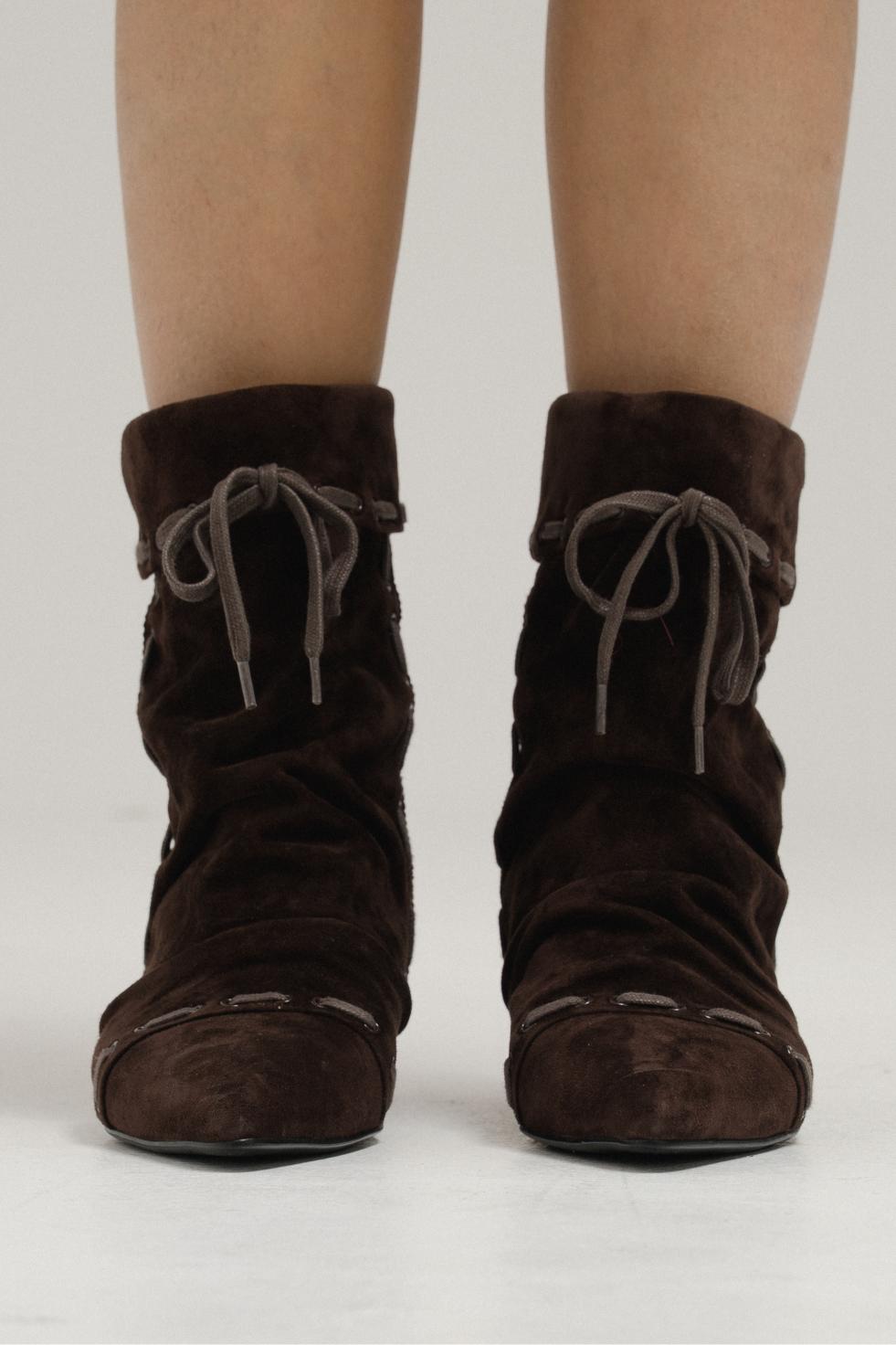 صُنع هذا الحذاء من جلد سويدي ناعم، ليضفي لمسةً من الأناقة والرقي. يُضفي مقدمة الحذاء المدببة الحادة لمسةً من الطول على التصميم، بينما تُضفي الخياطة المتباينة تفاصيل دقيقة على الحذاء. يُضفي خيط فيونكة على الجانب لمسةً من السحر على التصميم المُحكم.