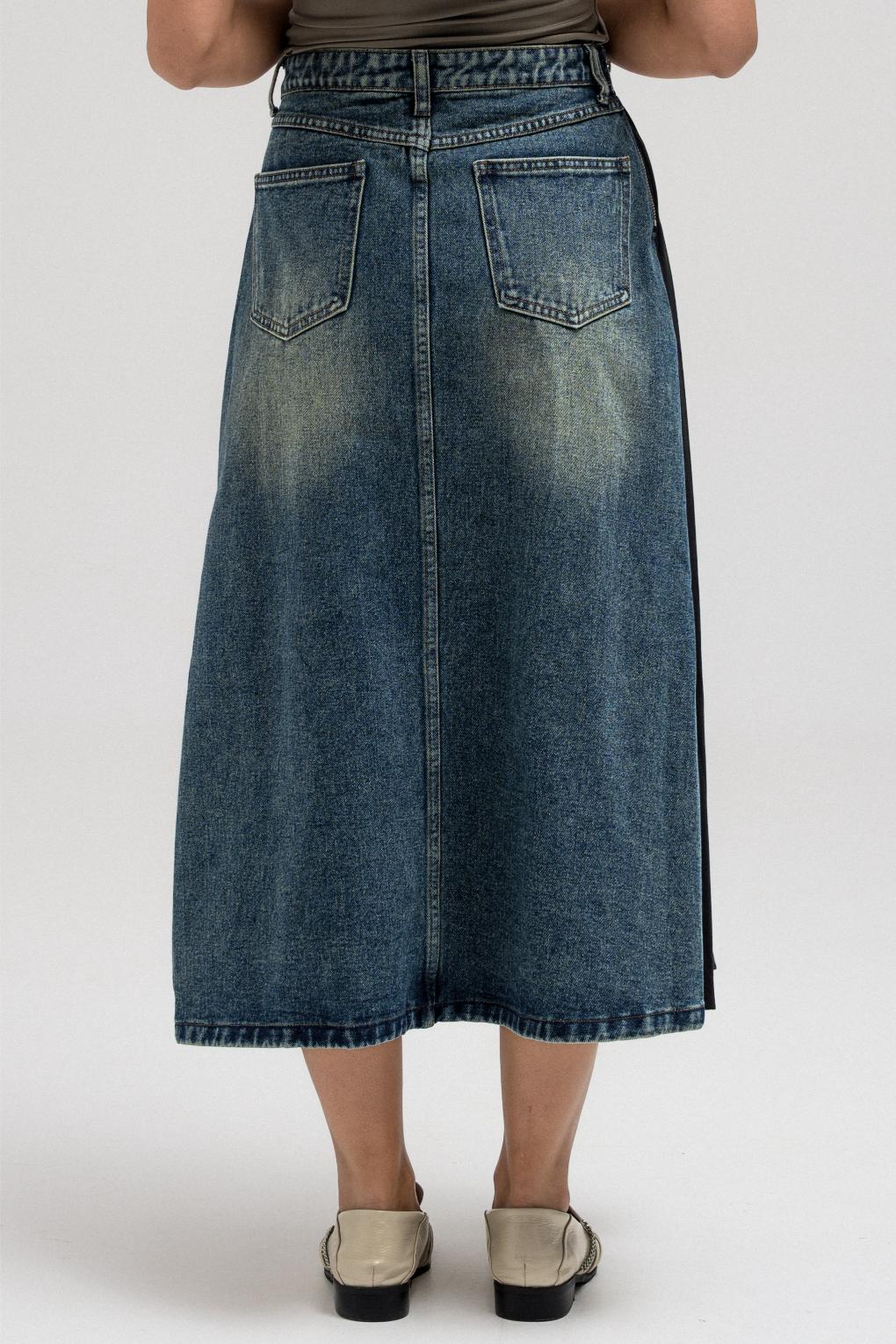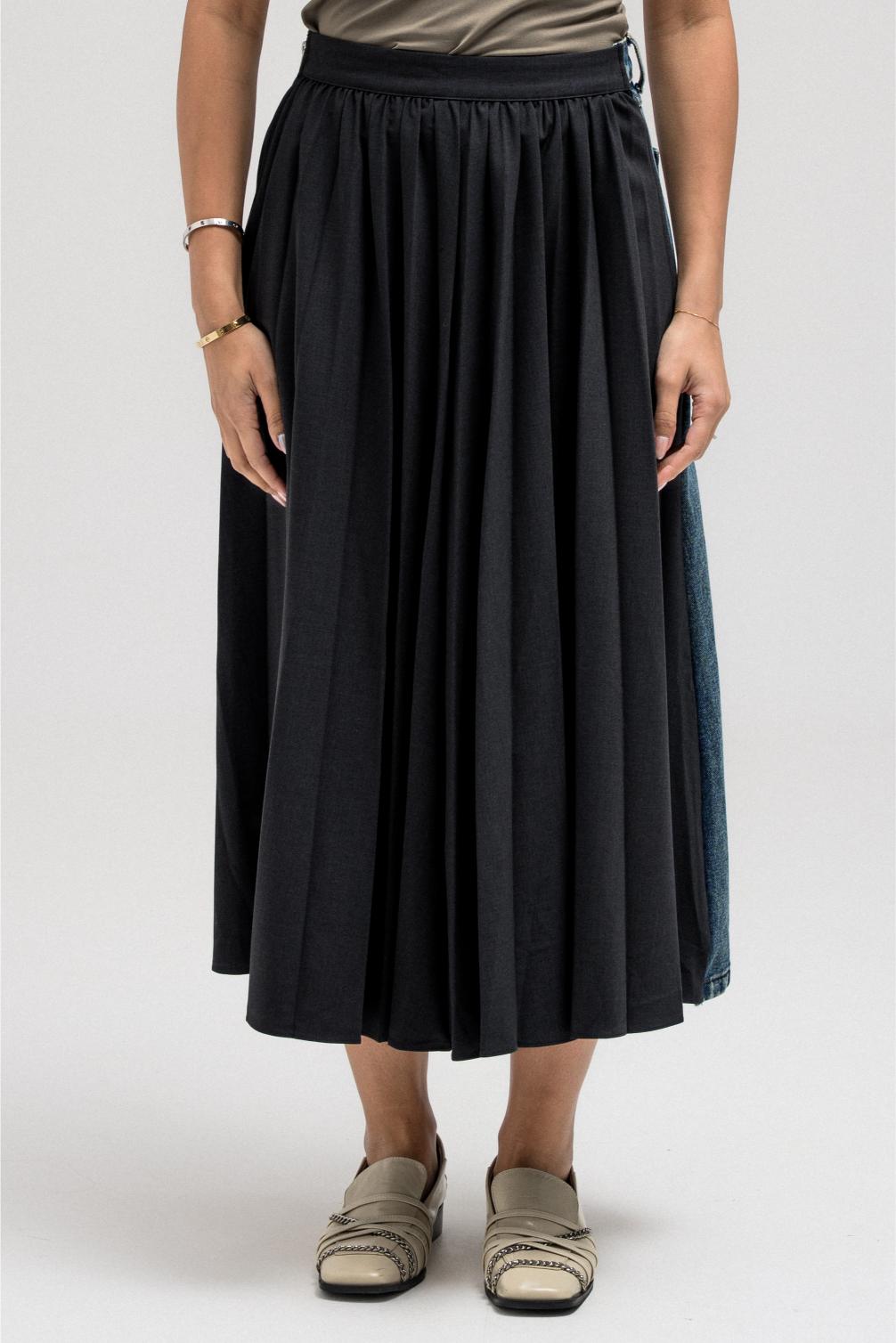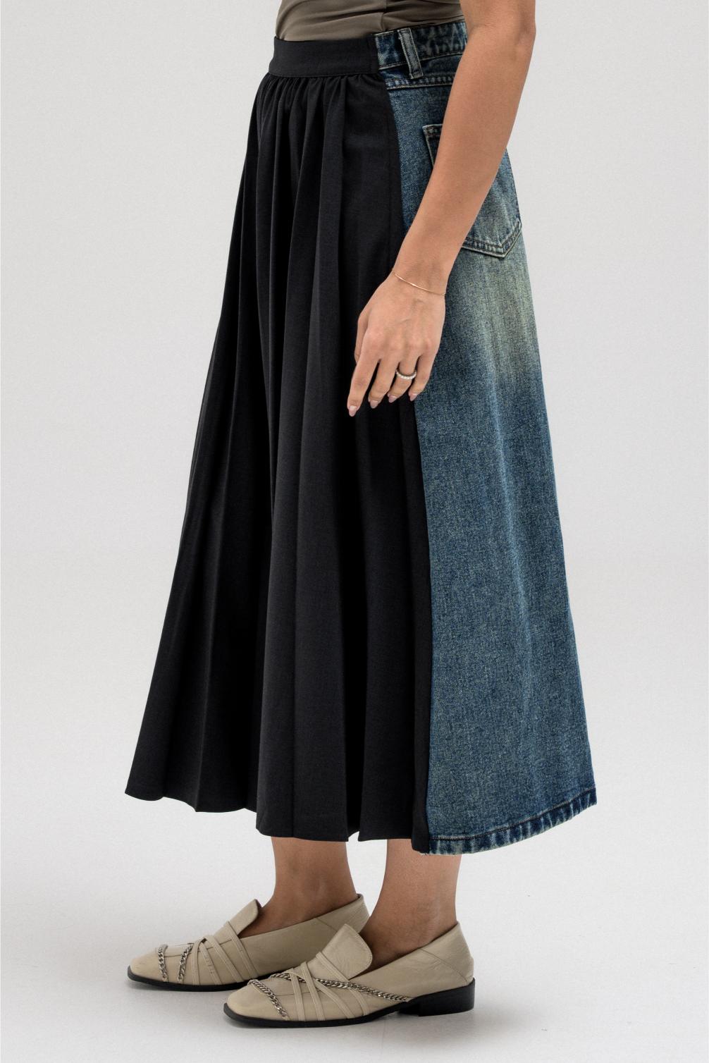 CONTRAST PLEATED DENIM-MIX SKIRT