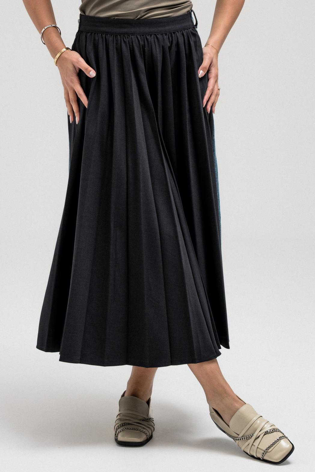 This statement skirt combines two textures for a modern look, a denim fabric at the back and a flowy pleated design at the front. Finished with a side zipper closure for ease of wear, the contrast adds movement and depth, making it a standout piece for both casual and elevated outfits.