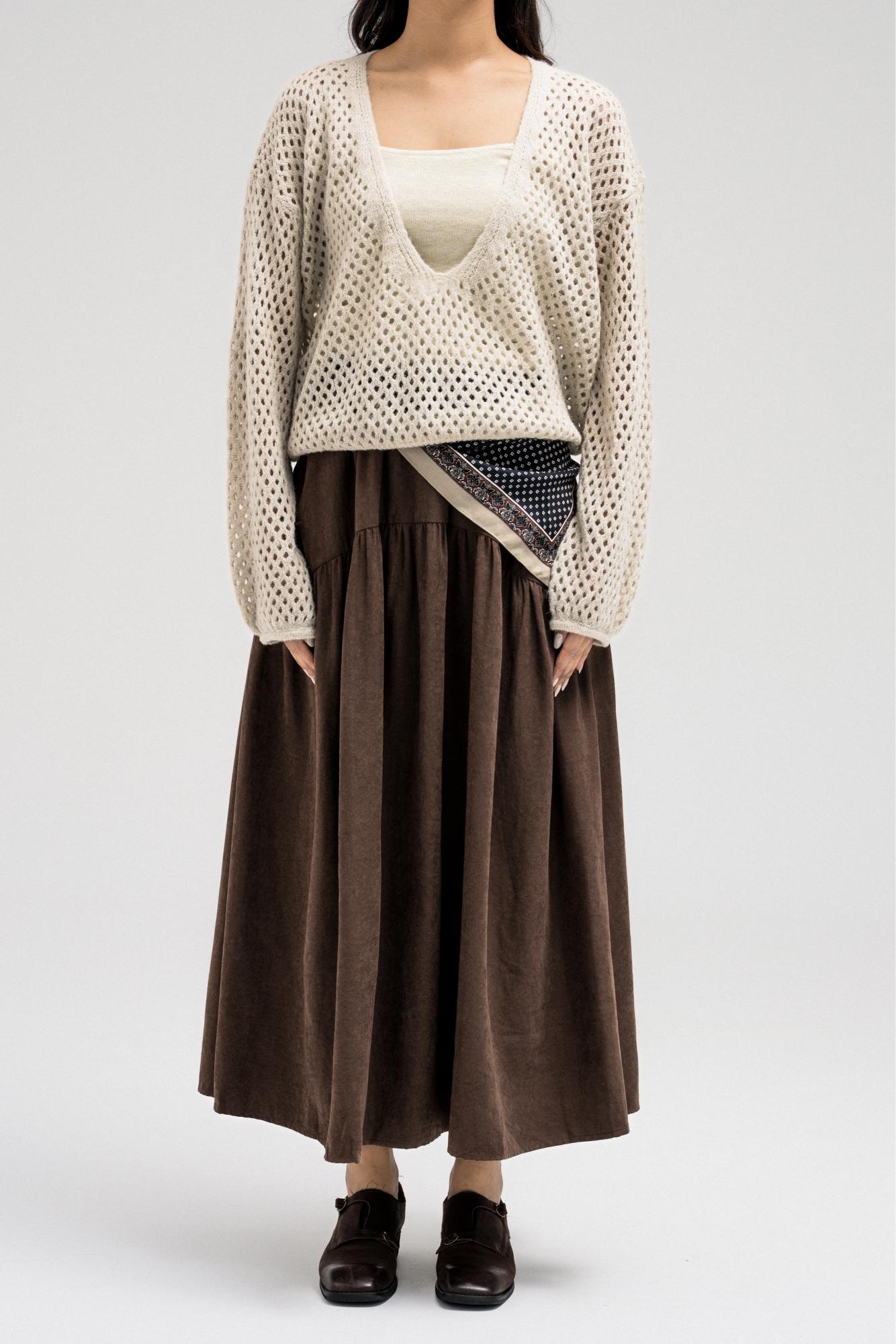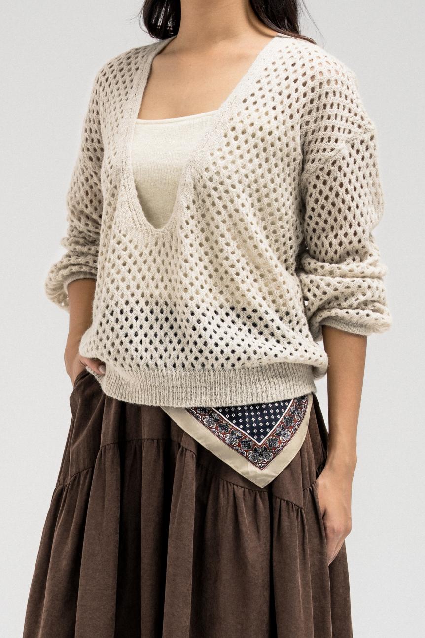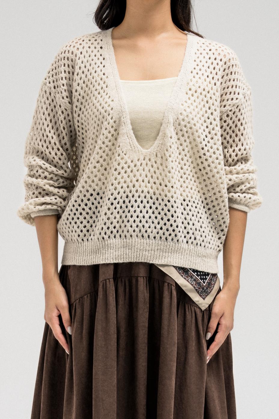بلوزة محبوكة خفيفة الوزن، مصممة بفتحة رقبة على شكل حرف V منخفضة ونسيج شفاف مفتوح. تأتي مع بلوزة داخلية محبوكة مطابقة لارتدائها فوق بعضها. قطعة متعددة الاستخدامات تجمع بين الراحة العملية والإطلالة الأنيقة والخفيفة.