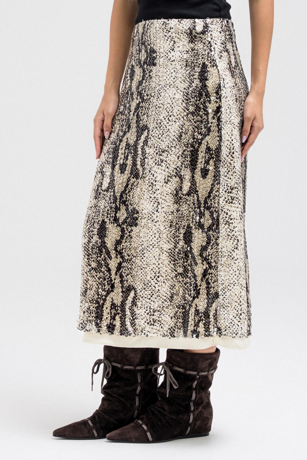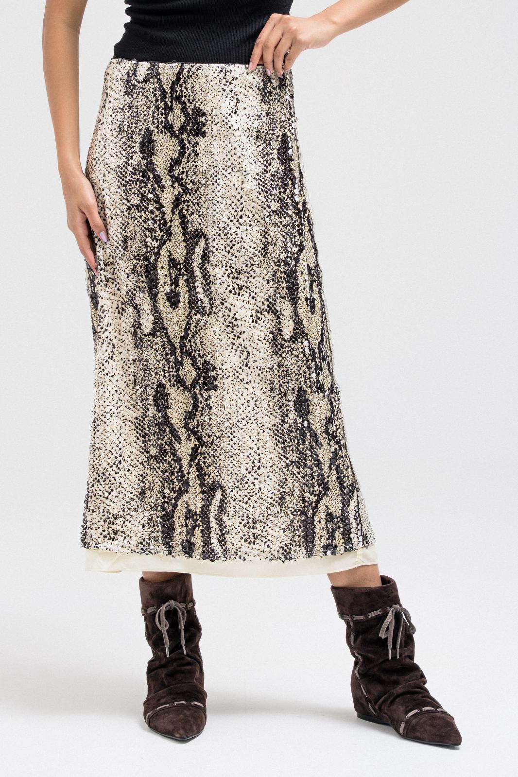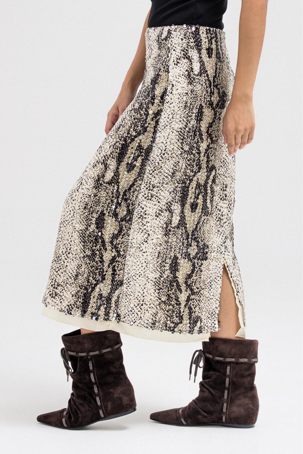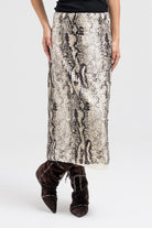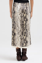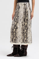 This striking snakeskin midi skirt features a sleek silhouette with a back zipper closure for easy wear. It includes a back slit that adds movement and comfort while maintaining a chic look. The hem subtly reveals a light inner fabric, giving the skirt a layered, elevated finish. A bold statement piece that pairs beautifully with simple tops for a polished, standout outfit.