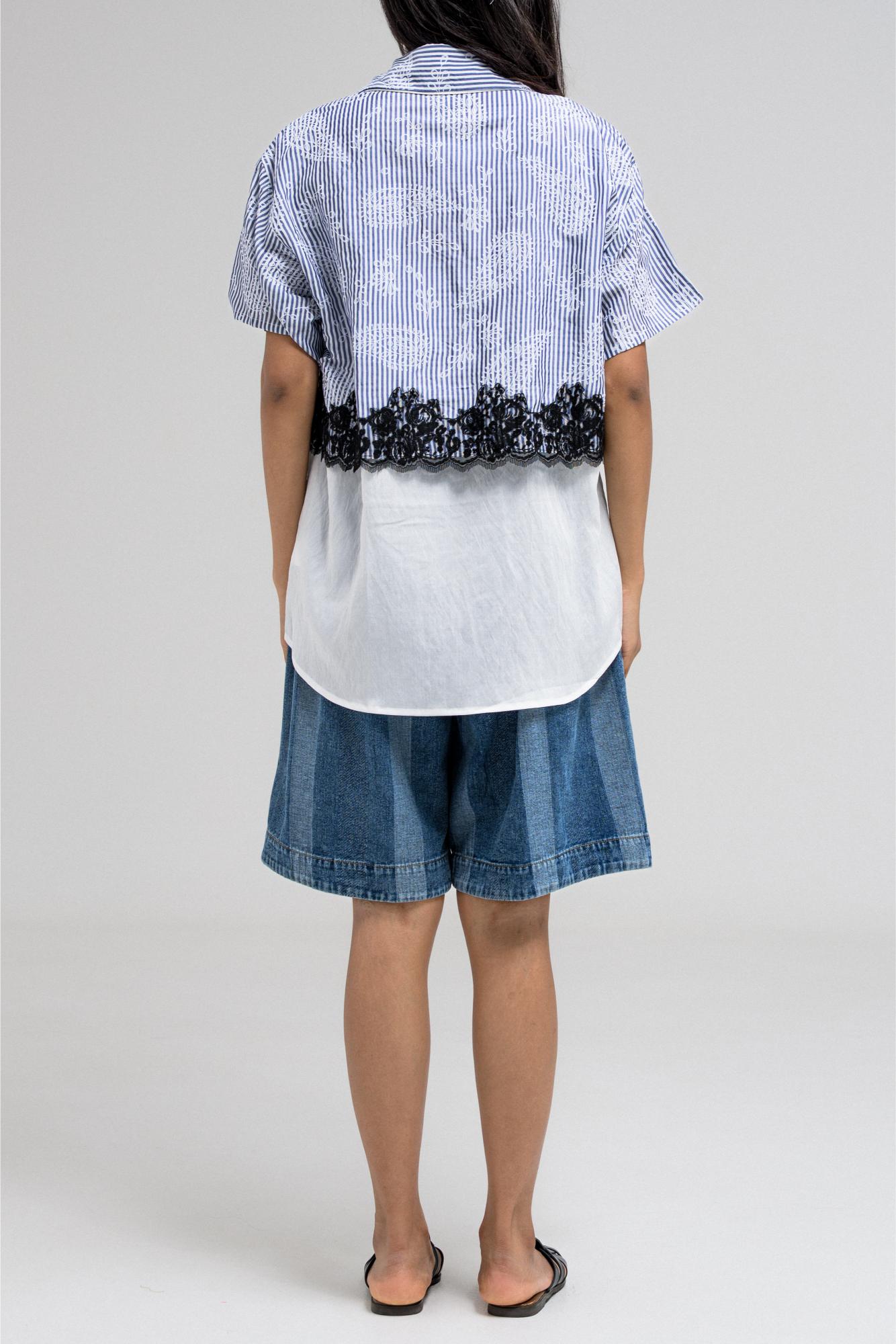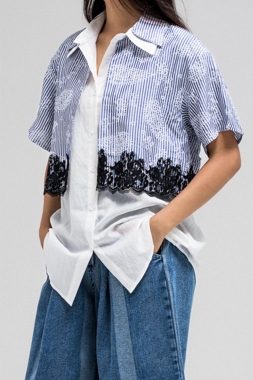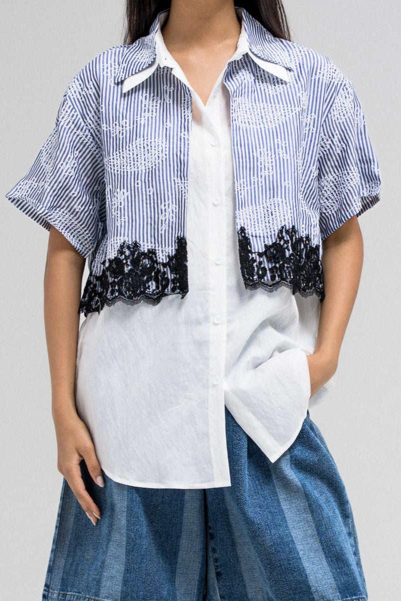 This unique short-sleeve shirt features a double-layered design. The base layer is a classic shirt with a collar and front button closure. Over it, an attached second layer in a contrasting striped fabric adds depth and texture. This outer layer is cropped and is connected to the shirt by threadwork and lace patterns along the collar, sleeves, and waist, giving it a deconstructed yet feminine look.