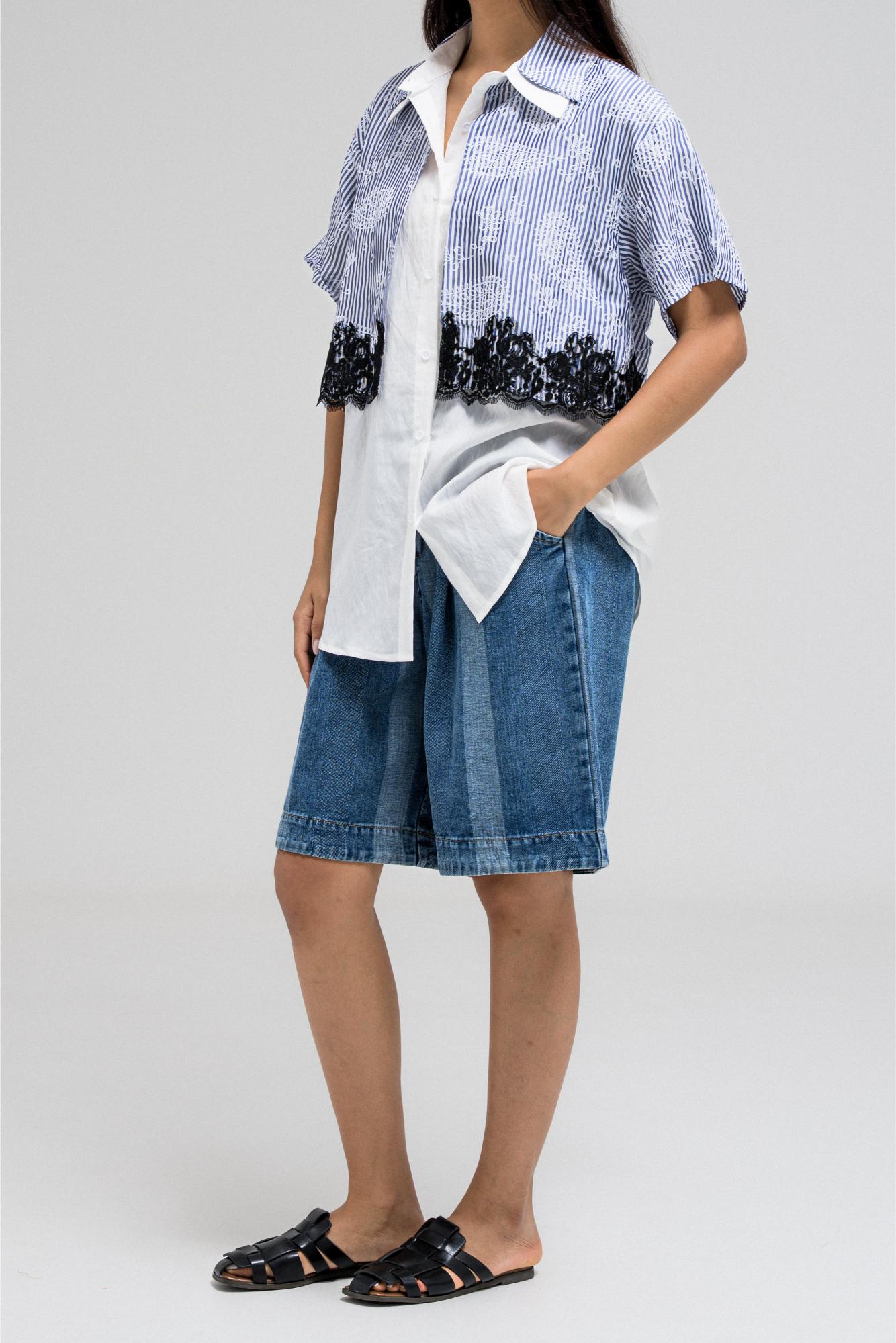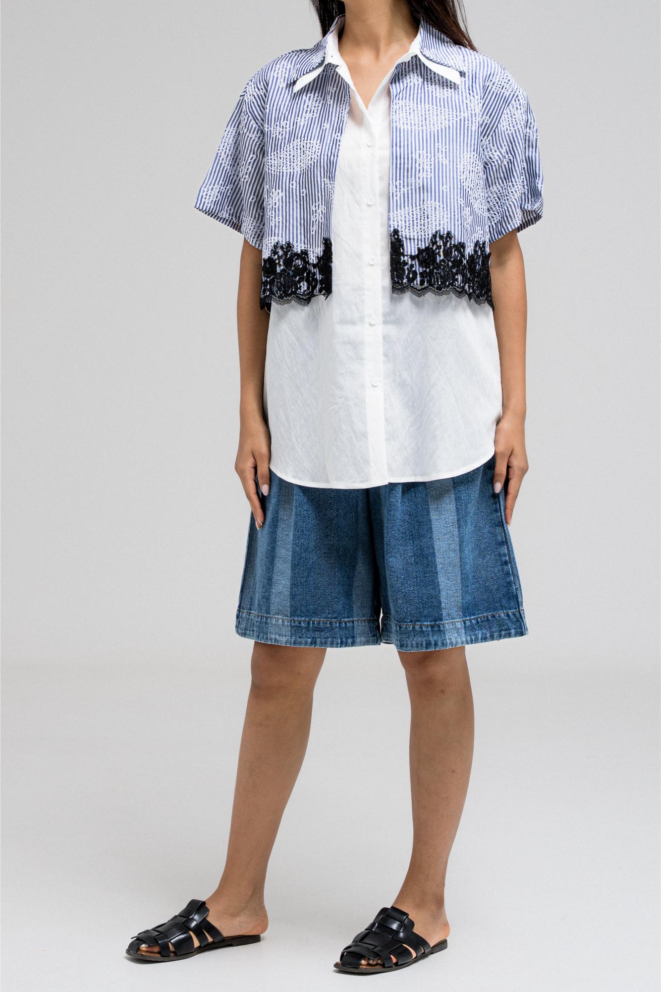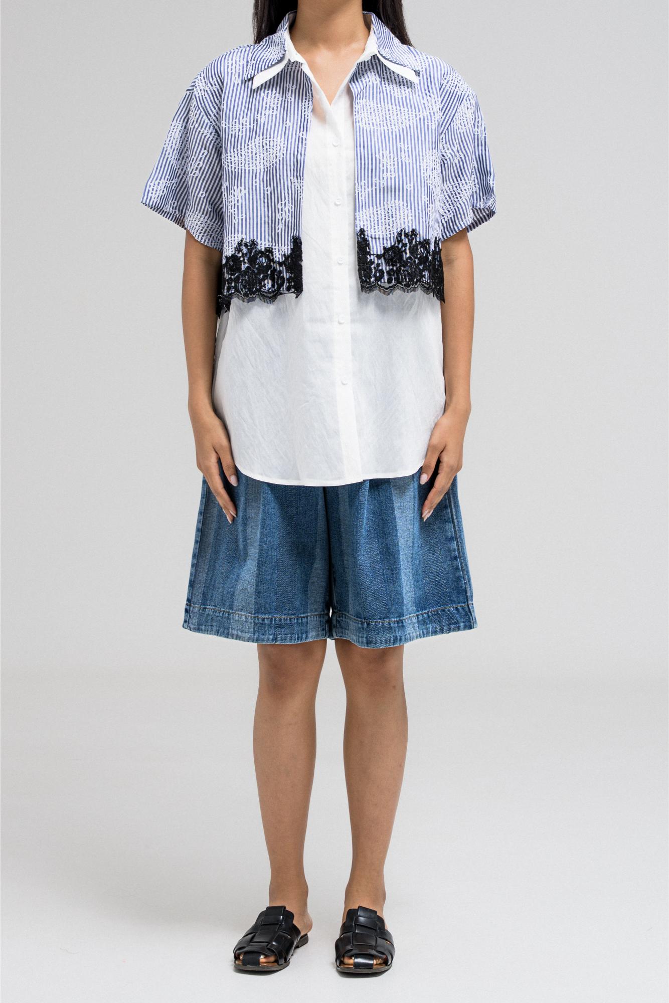 This unique short-sleeve shirt features a double-layered design. The base layer is a classic shirt with a collar and front button closure. Over it, an attached second layer in a contrasting striped fabric adds depth and texture. This outer layer is cropped and is connected to the shirt by threadwork and lace patterns along the collar, sleeves, and waist, giving it a deconstructed yet feminine look.