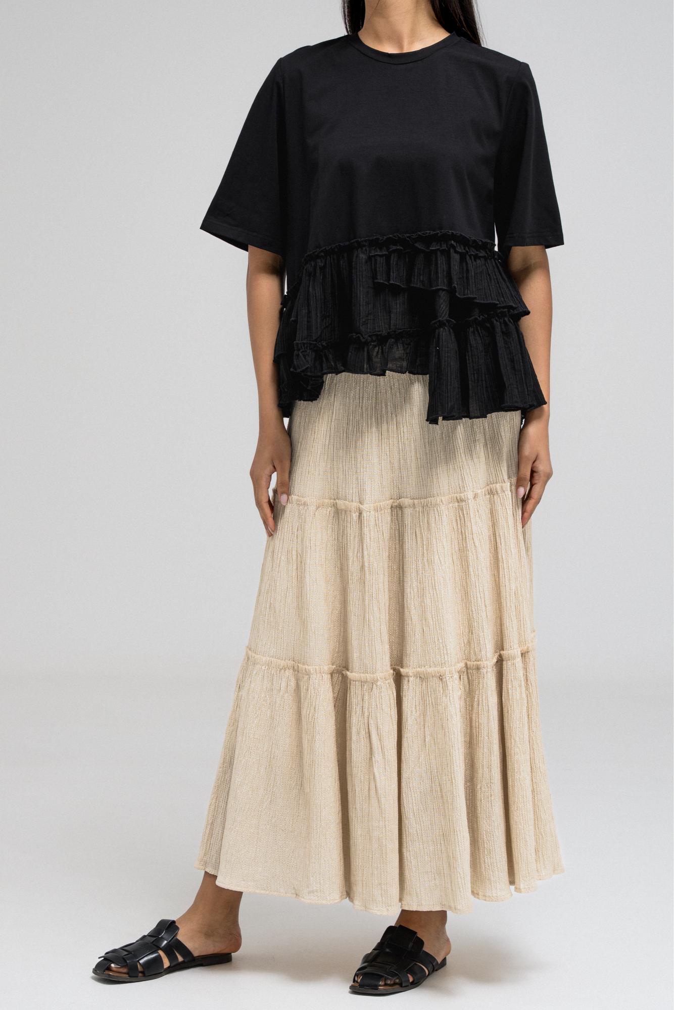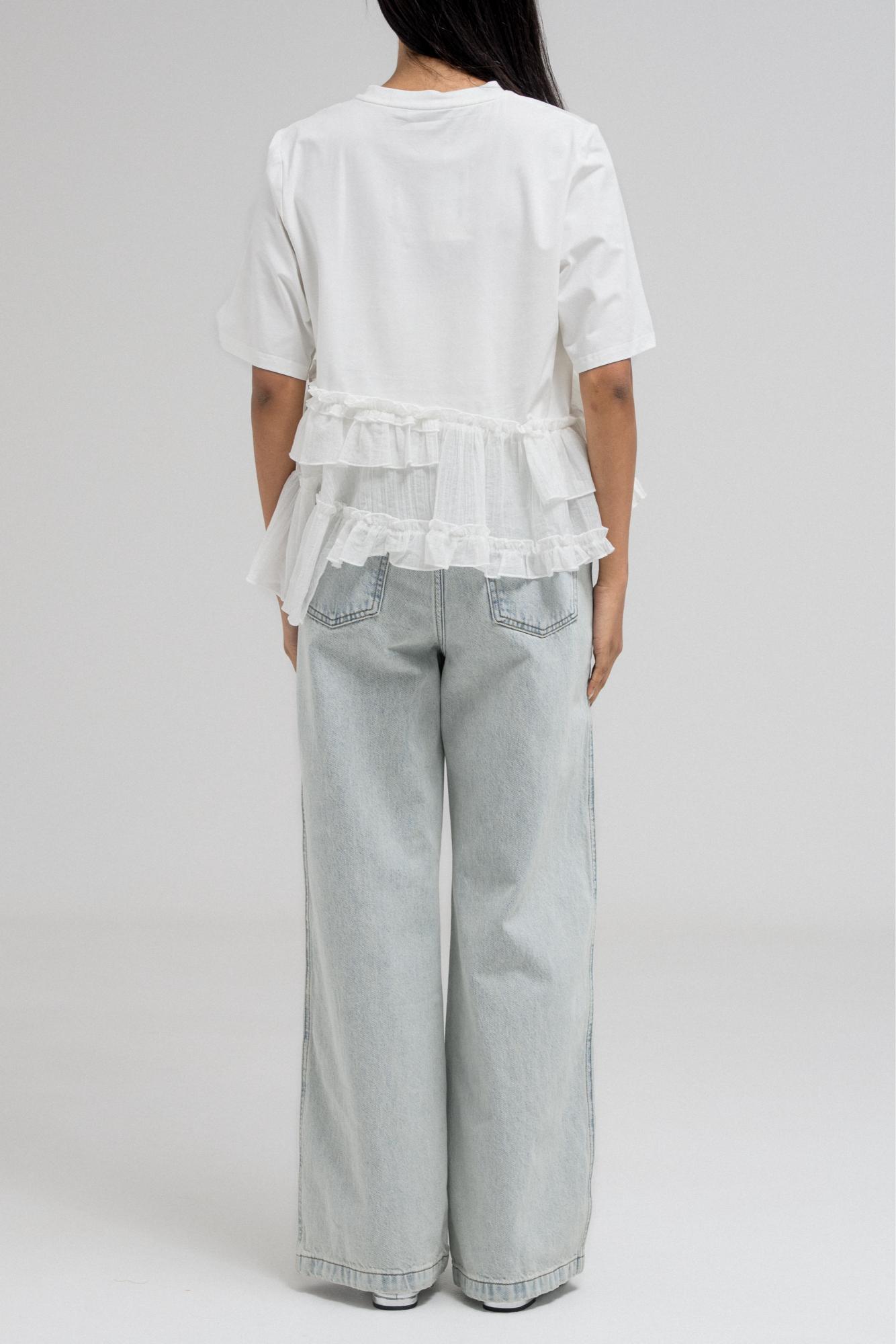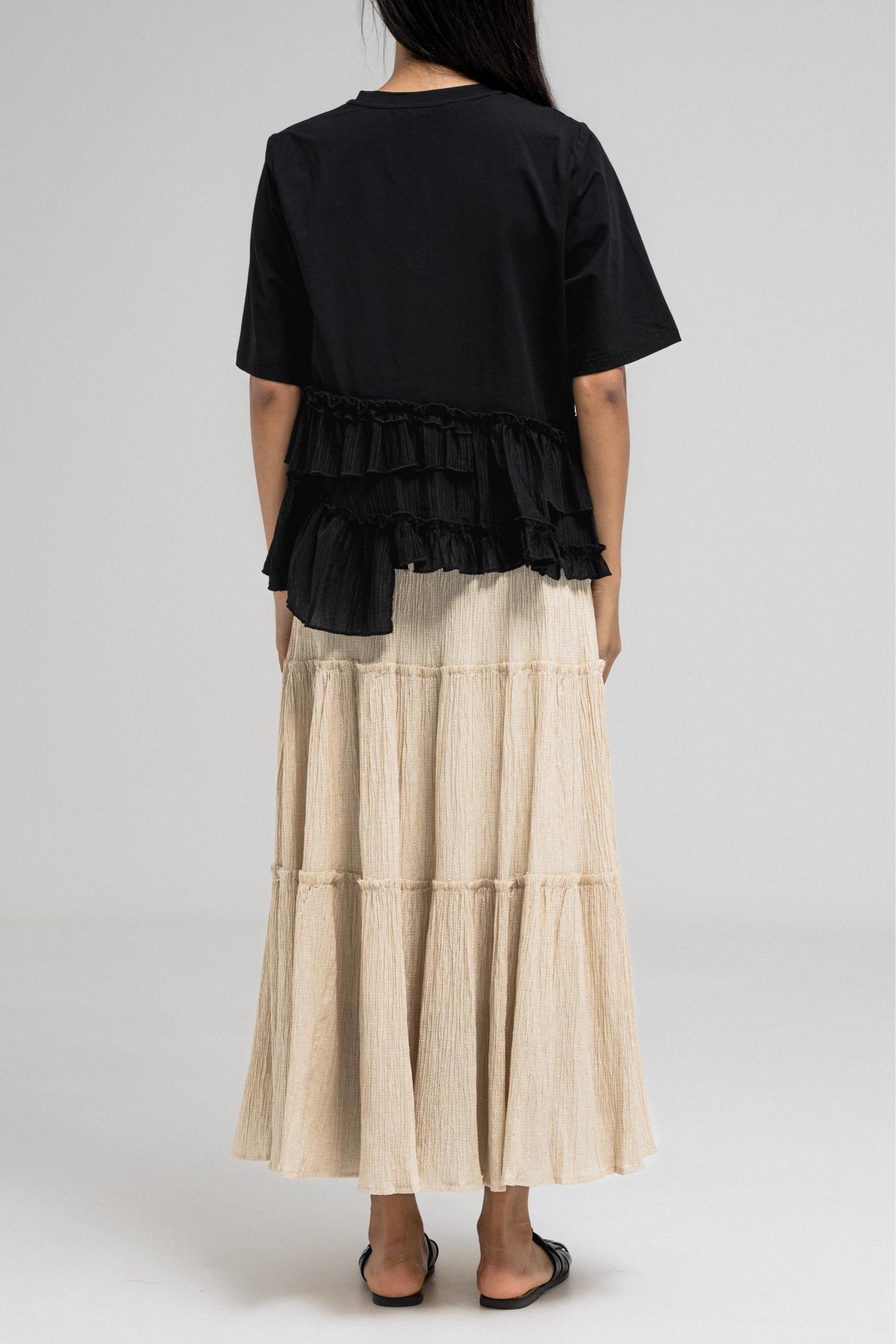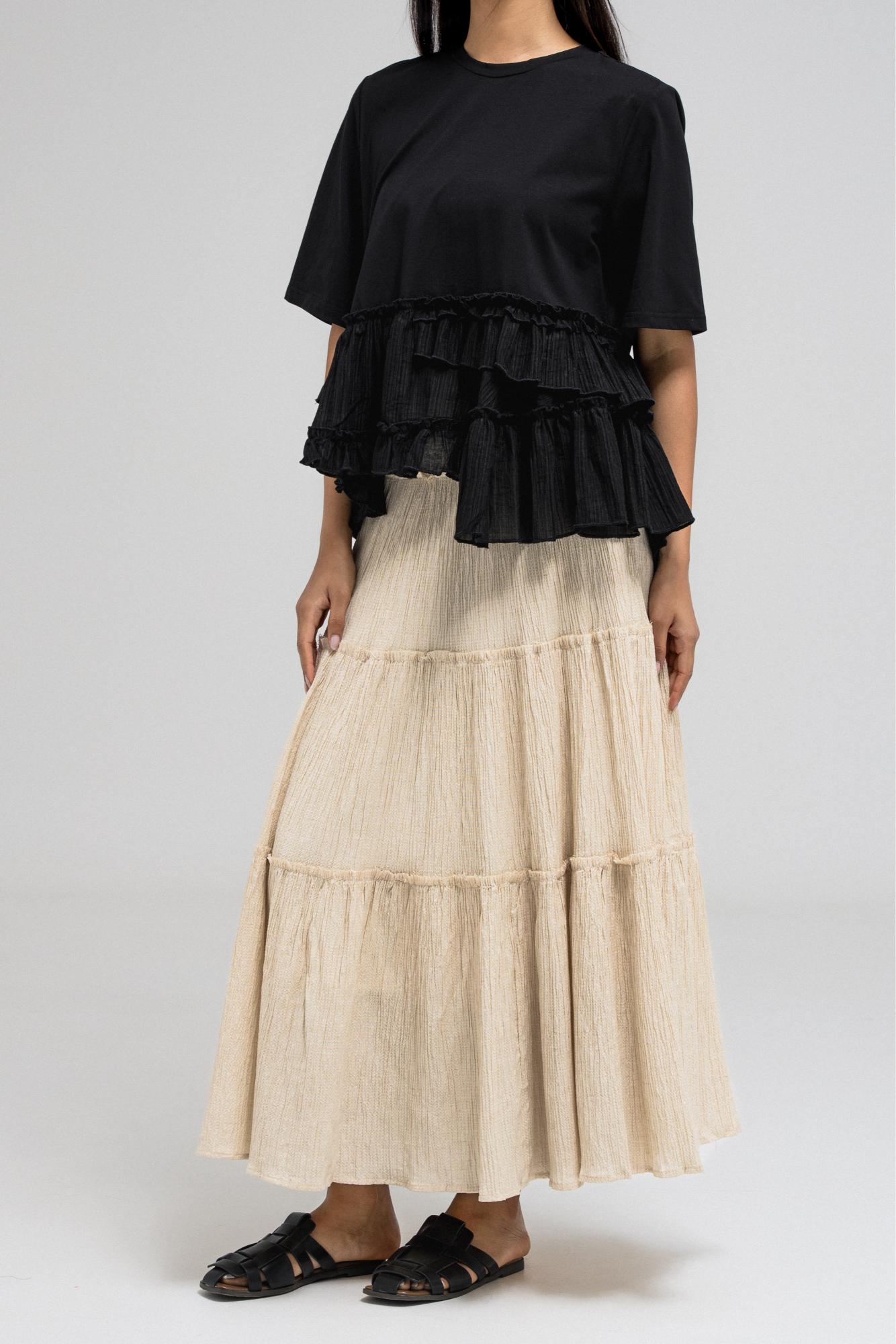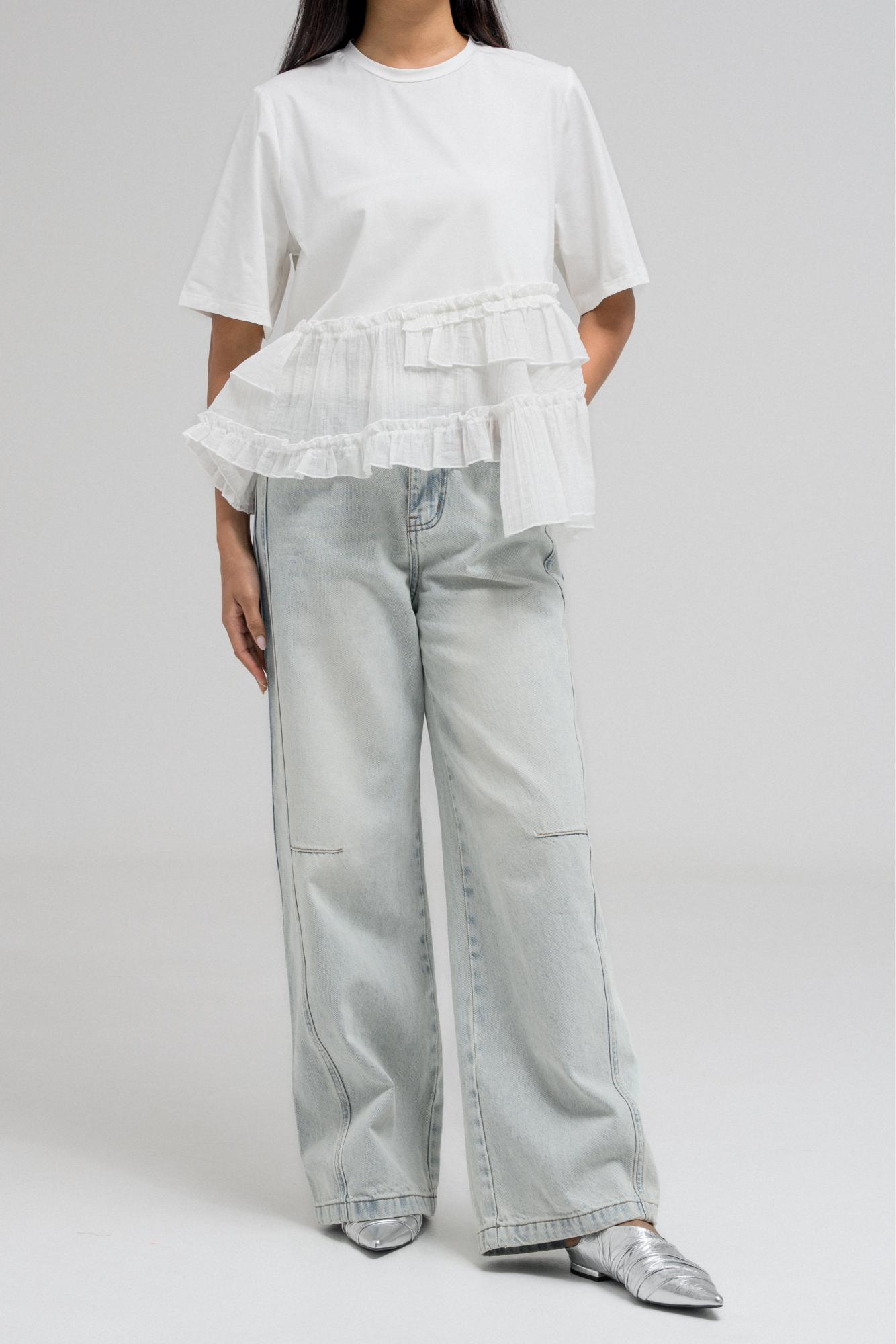 A stylish short-sleeved top with a round neckline, featuring soft, layered ruffles in an asymmetrical cut along the hem. The ruffles add dimension and a playful edge, perfect for a casual yet elevated look.