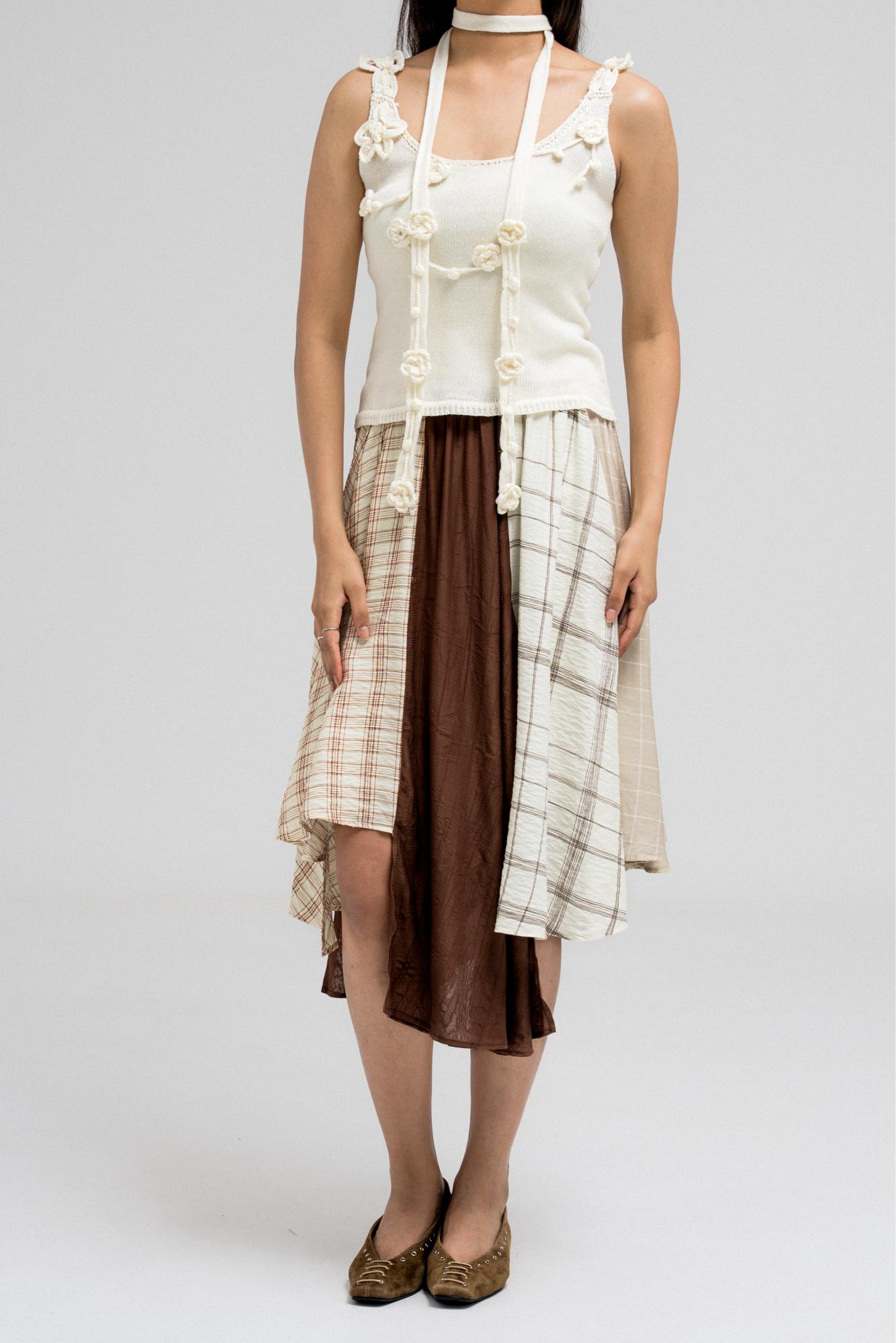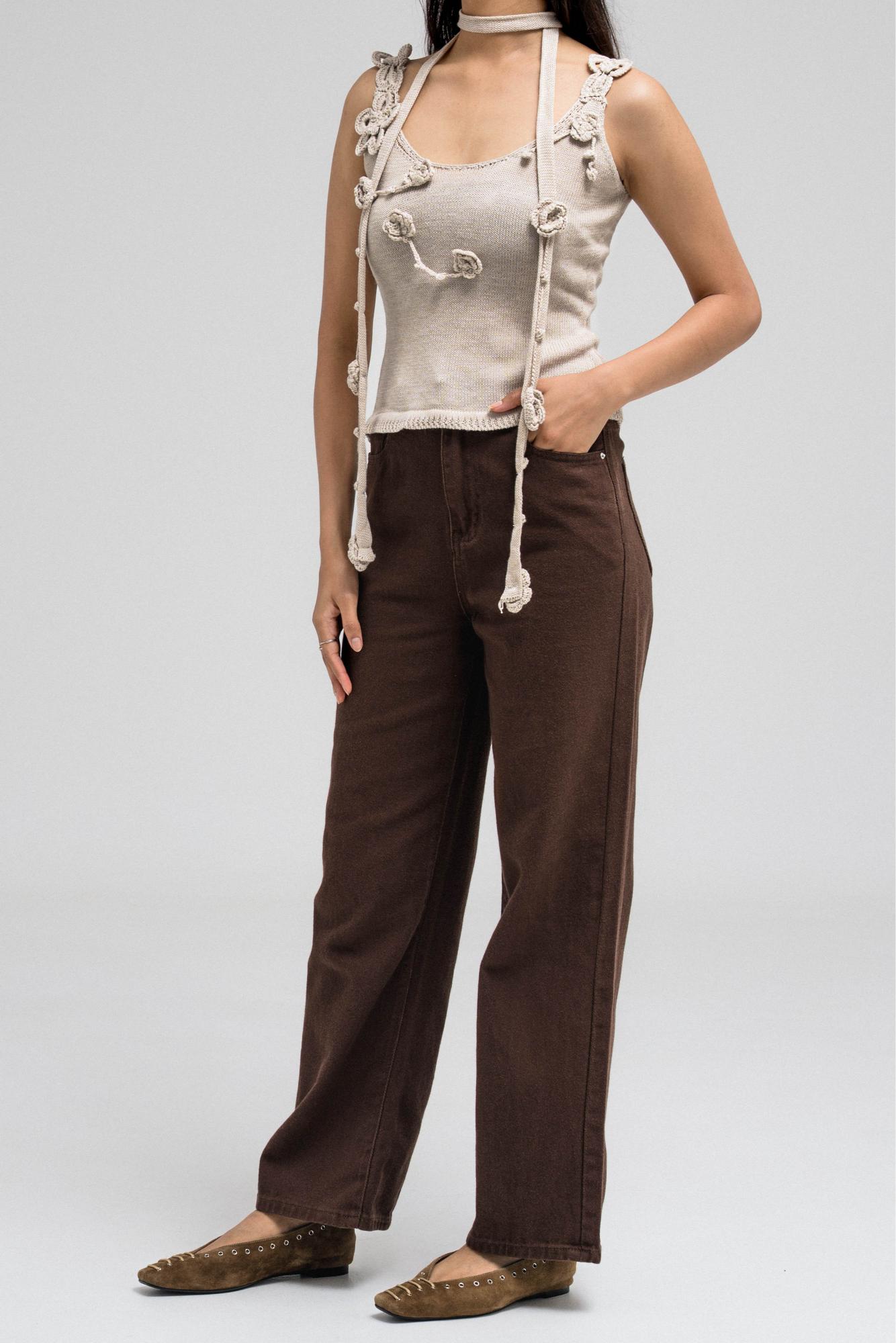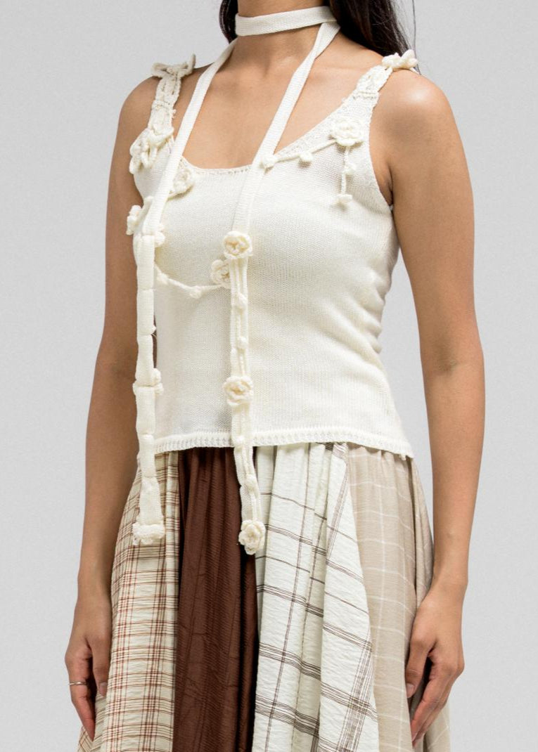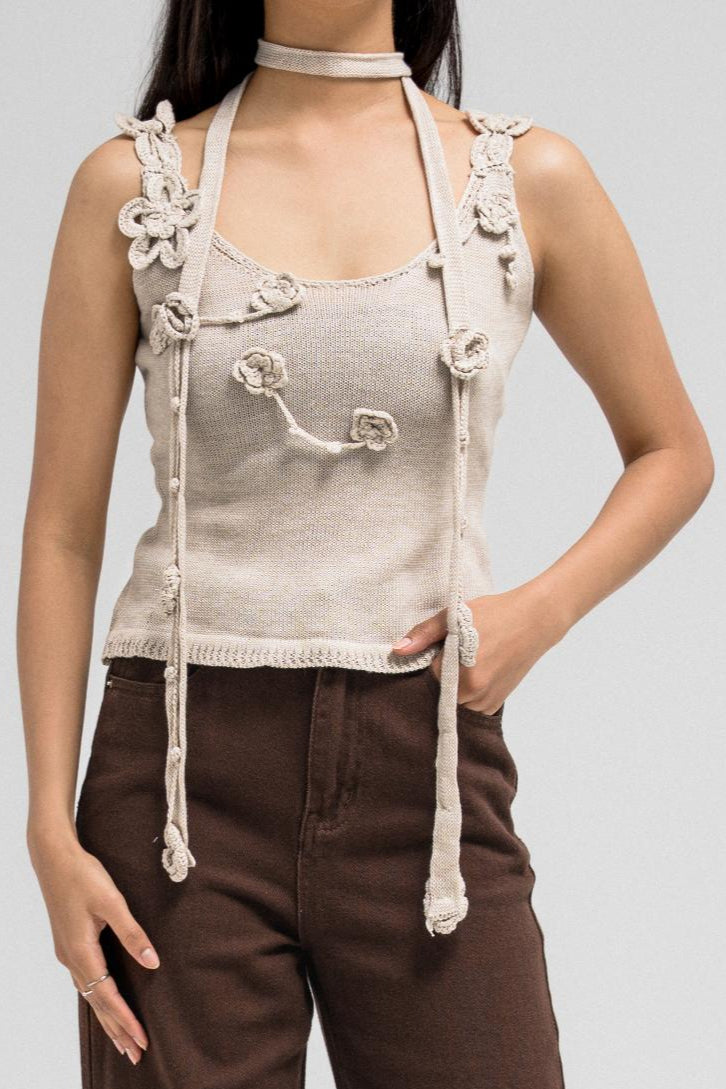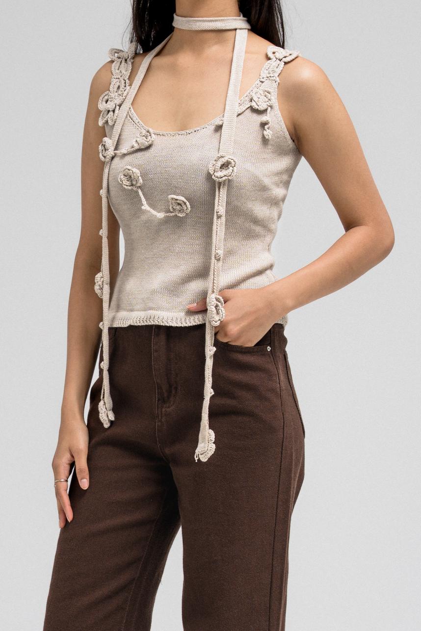 Sleeveless knit top features delicate 3D flower details across the straps and neckline, adding a soft, feminine touch. It comes with a matching knit flower belt that can be styled around the waist or tied at the neck for a versatile look.