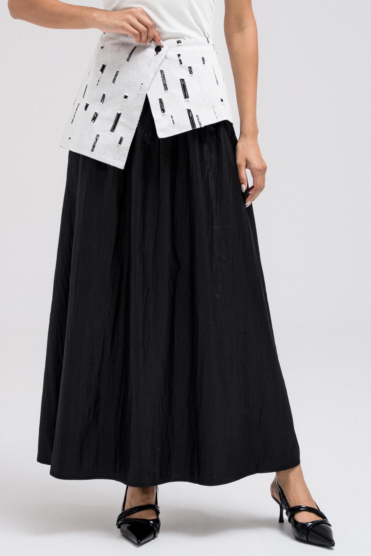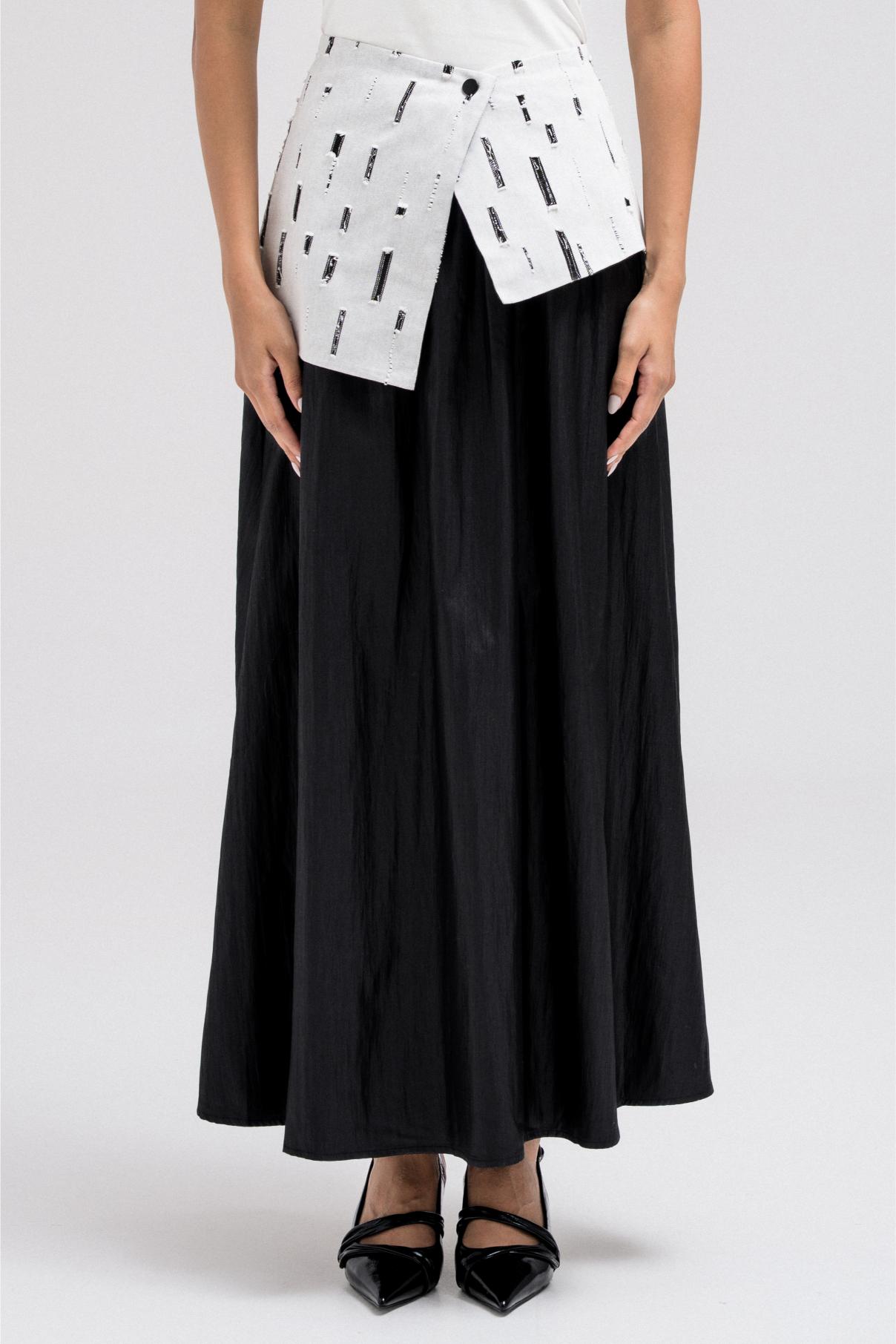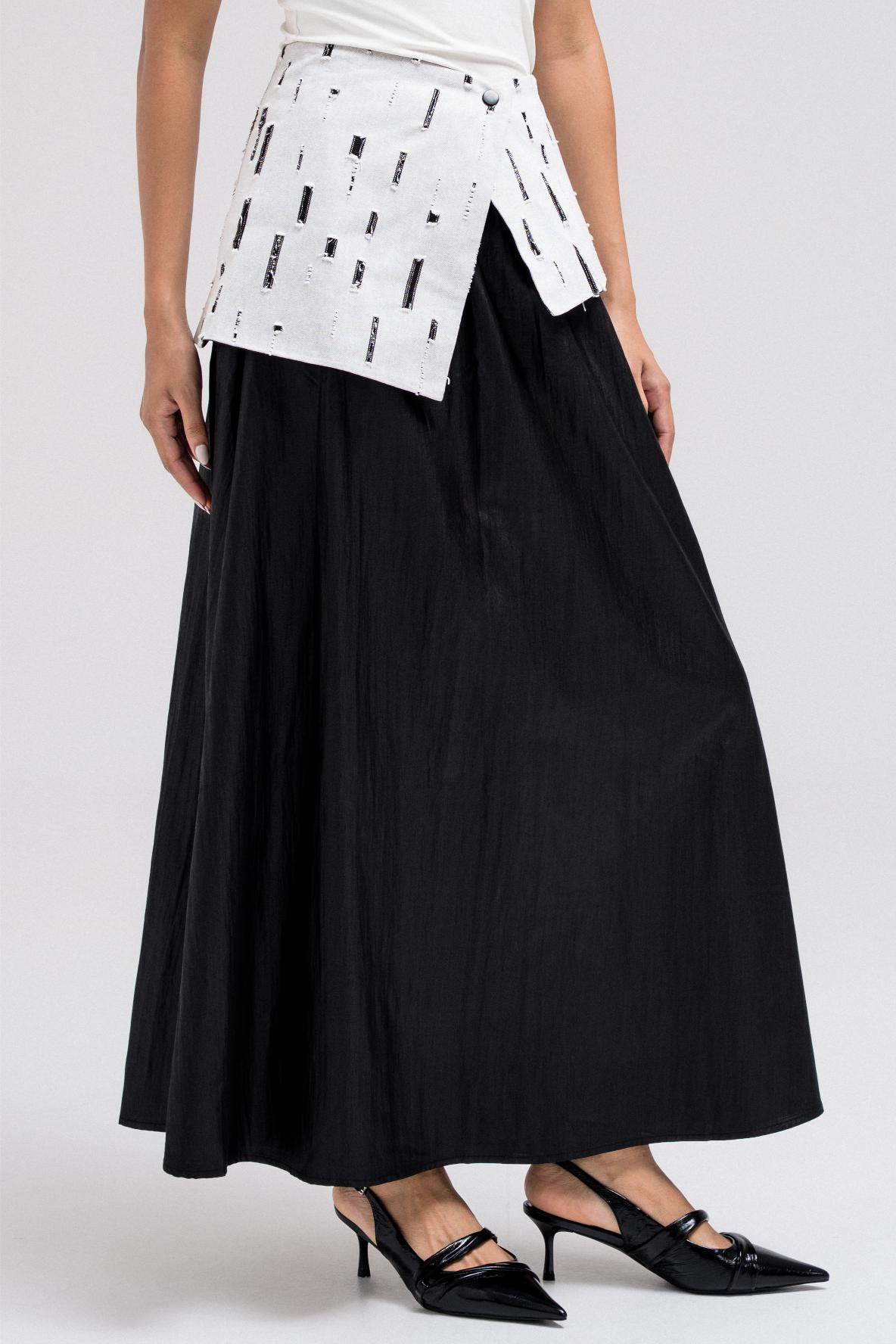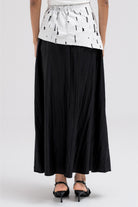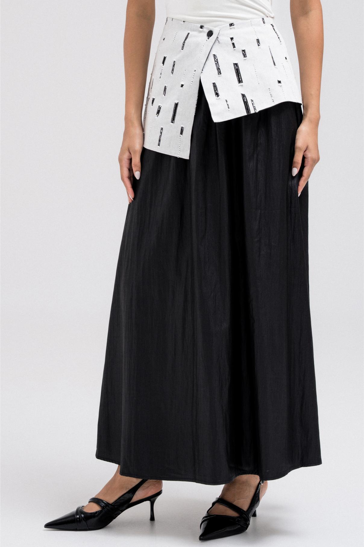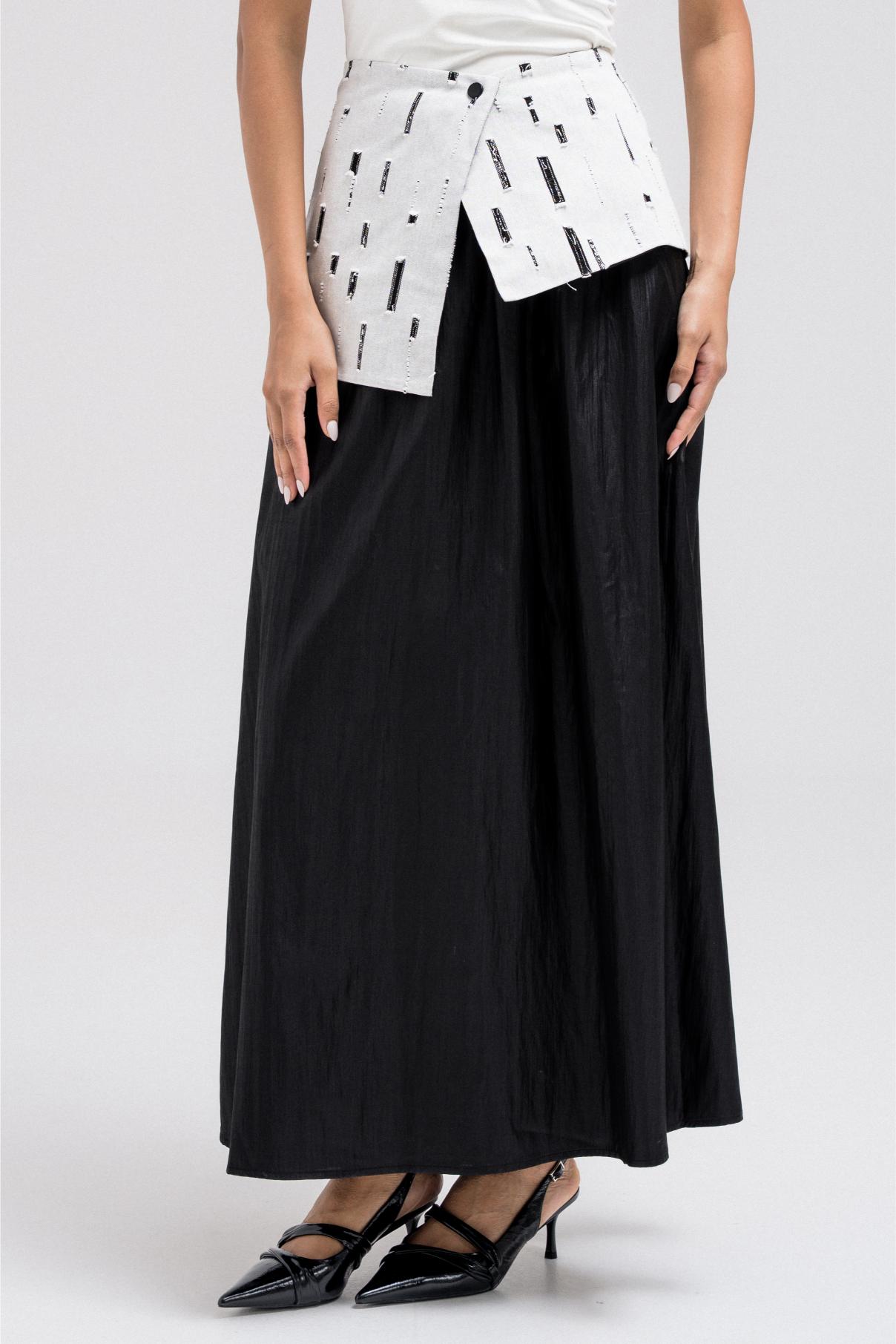 This light and flowy skirt features a contrasting patterned waistband fabric that adds a subtle design detail. It comes with a matching wrap-style accent for added dimension and styling versatility. Easy to pair with cropped or tailored tops for a balanced silhouette.