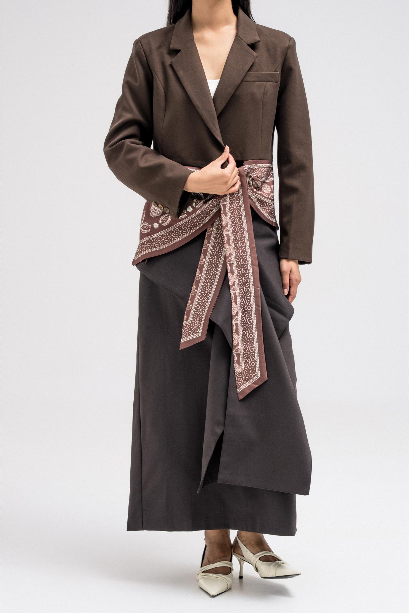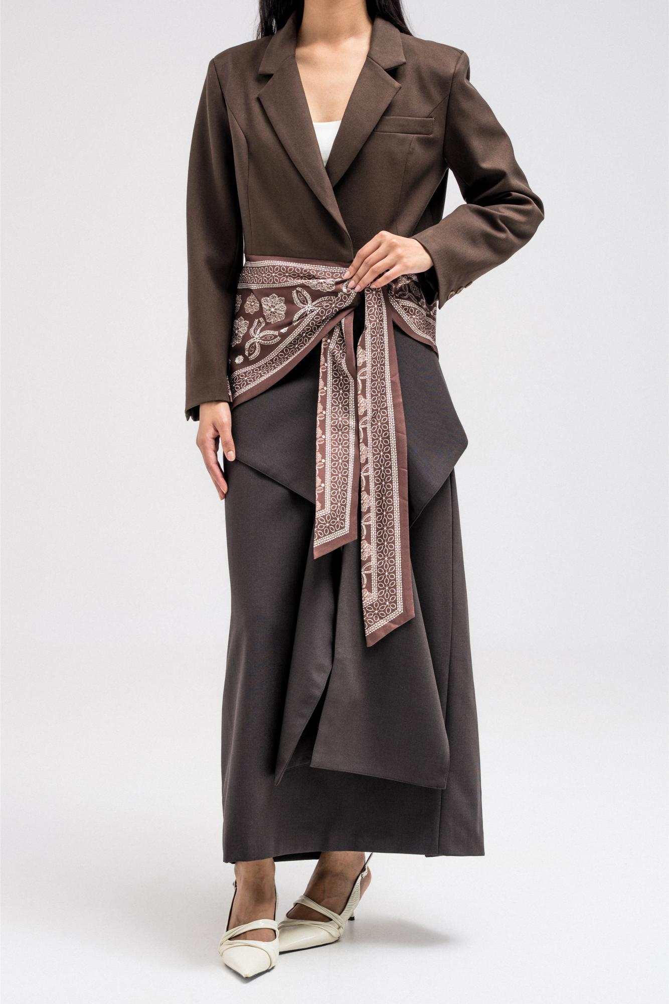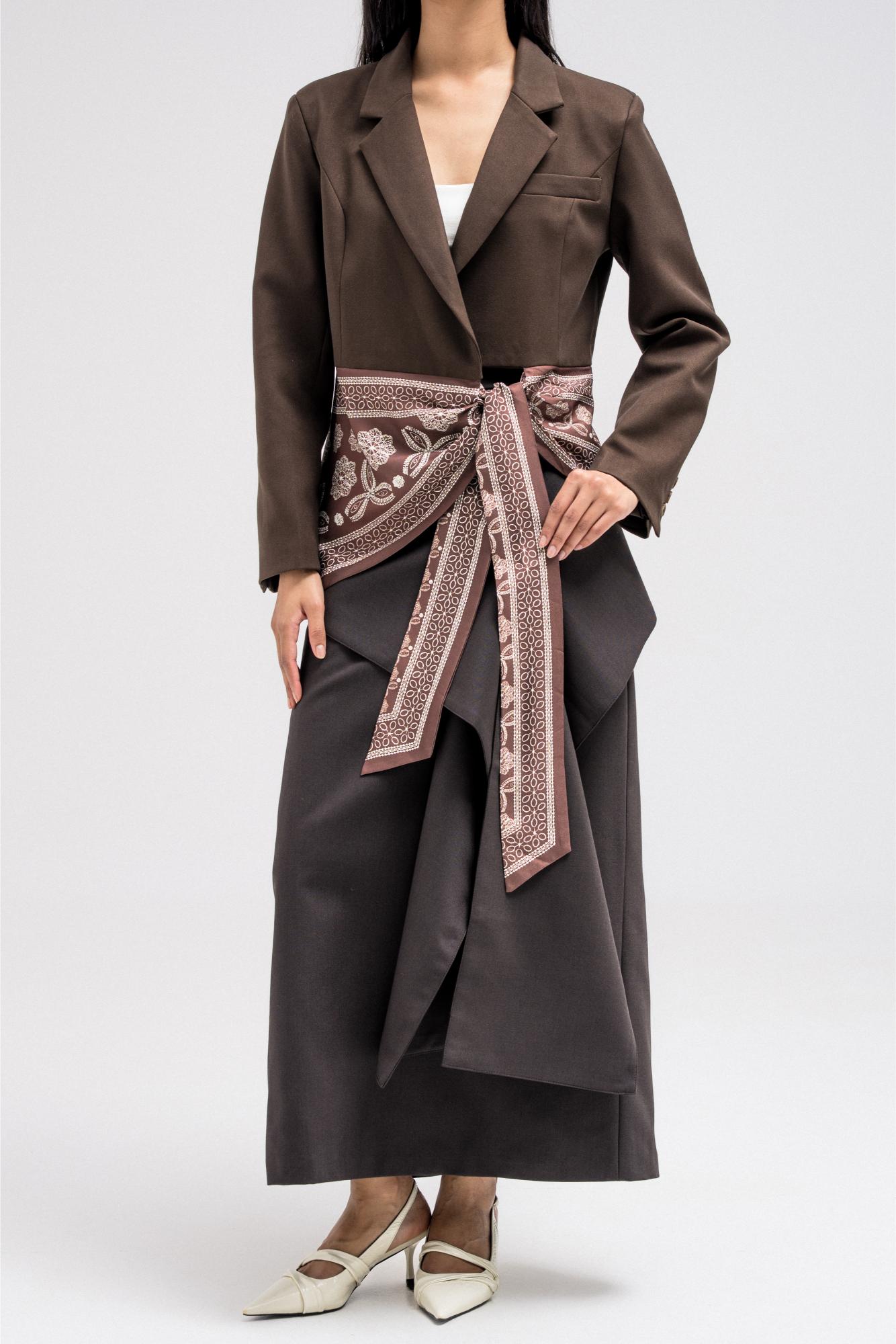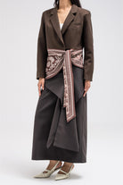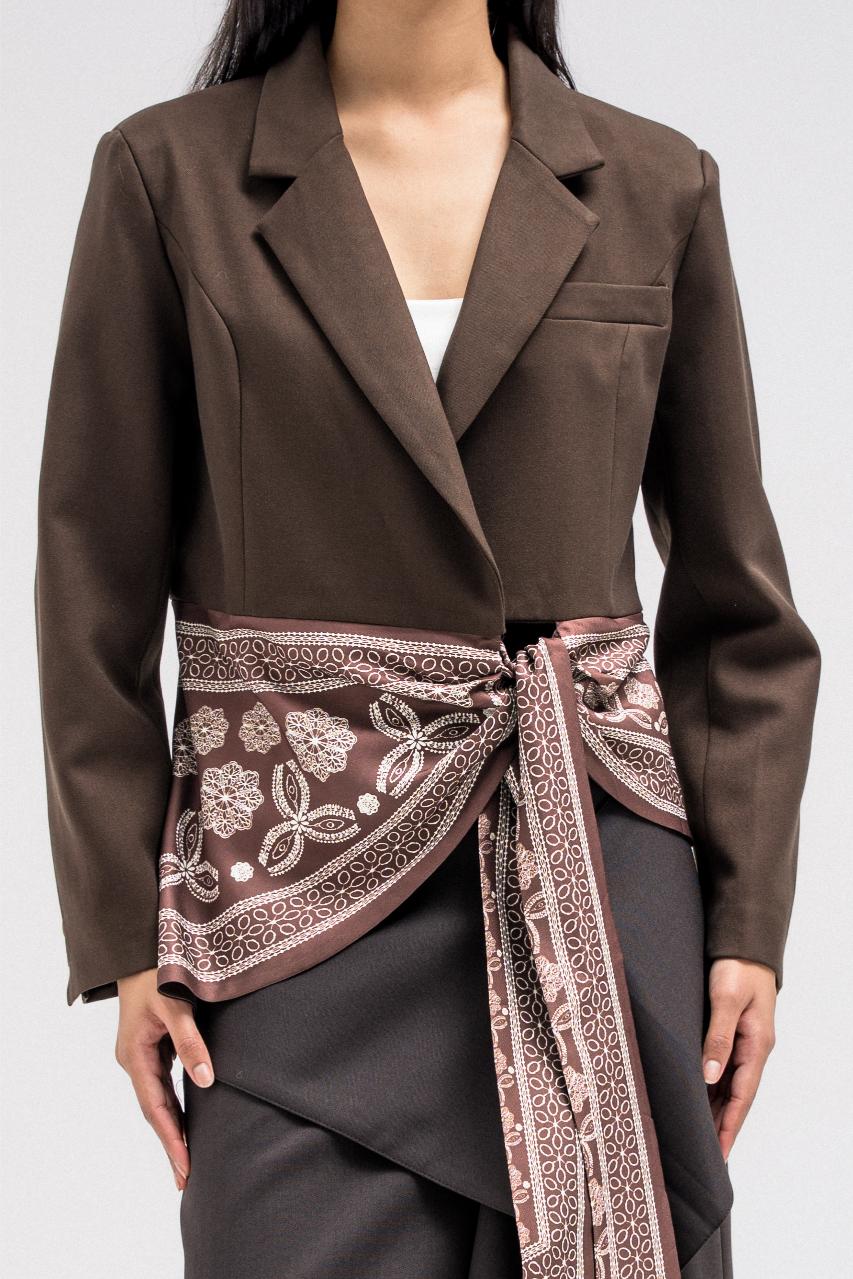 Tailored jacket designed with a unique half-and-half bandana-inspired hem detail. The lower portion features a contrasting patterned fabric that wraps around the waist and can be tied into a bow for a statement finish. It combines structured tailoring on top with soft draped detailing at the bottom, creating a bold yet elegant layered effect.