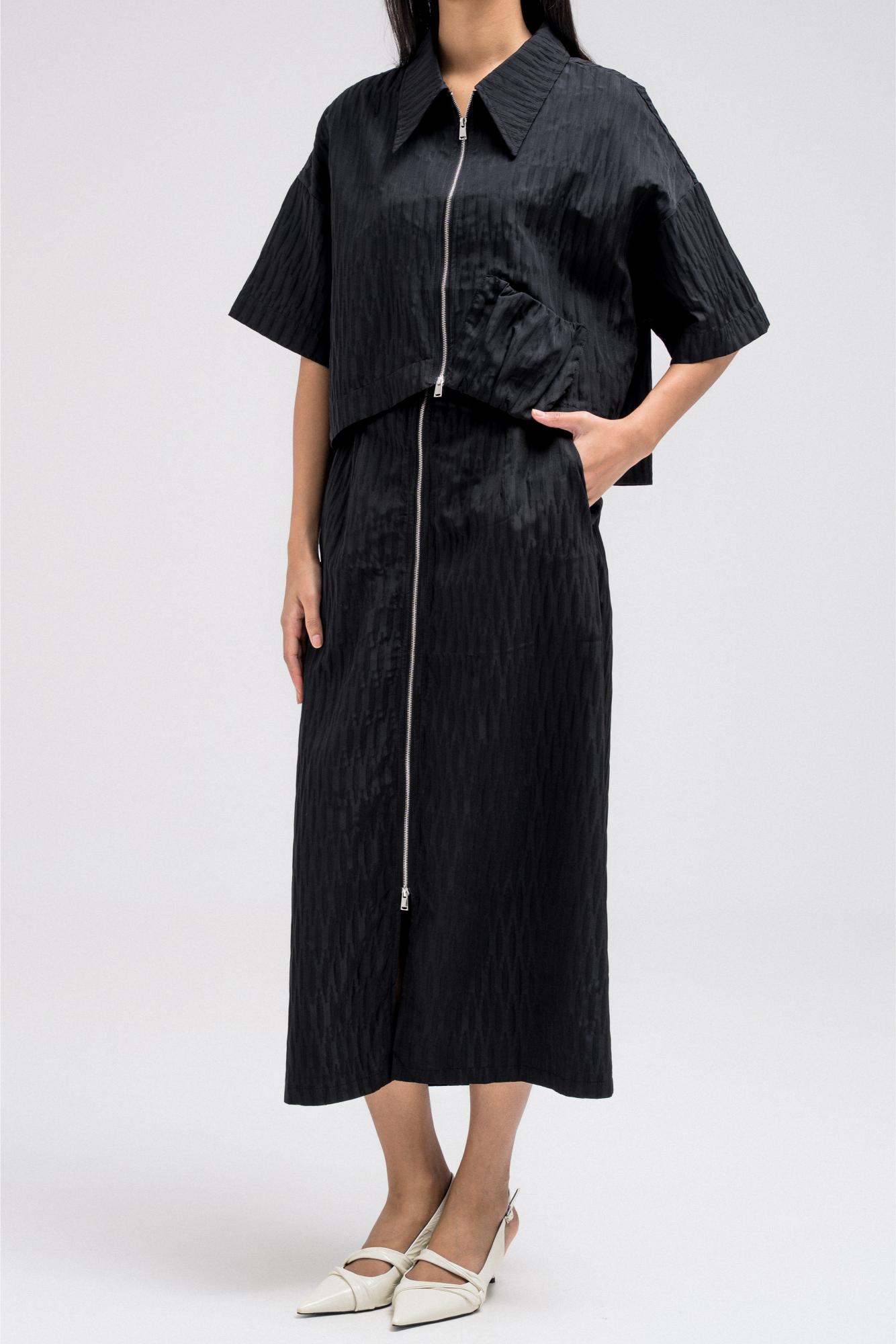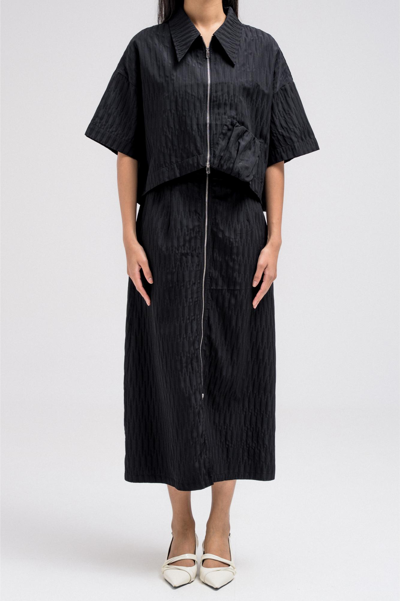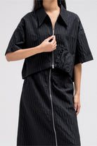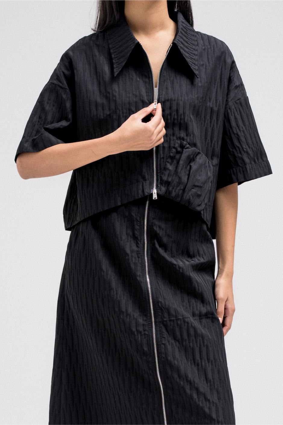Cropped short sleeve top with a structured collar and front zip closure. Features a unique gathered pocket detail on one side. The fabric has a subtle textured pattern that adds depth to the look.
