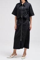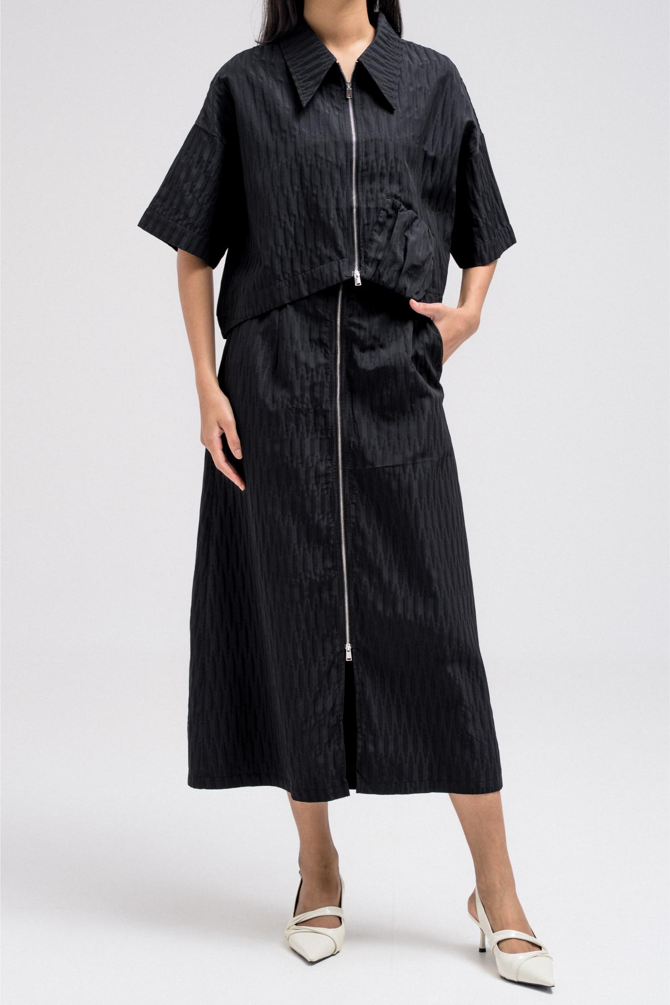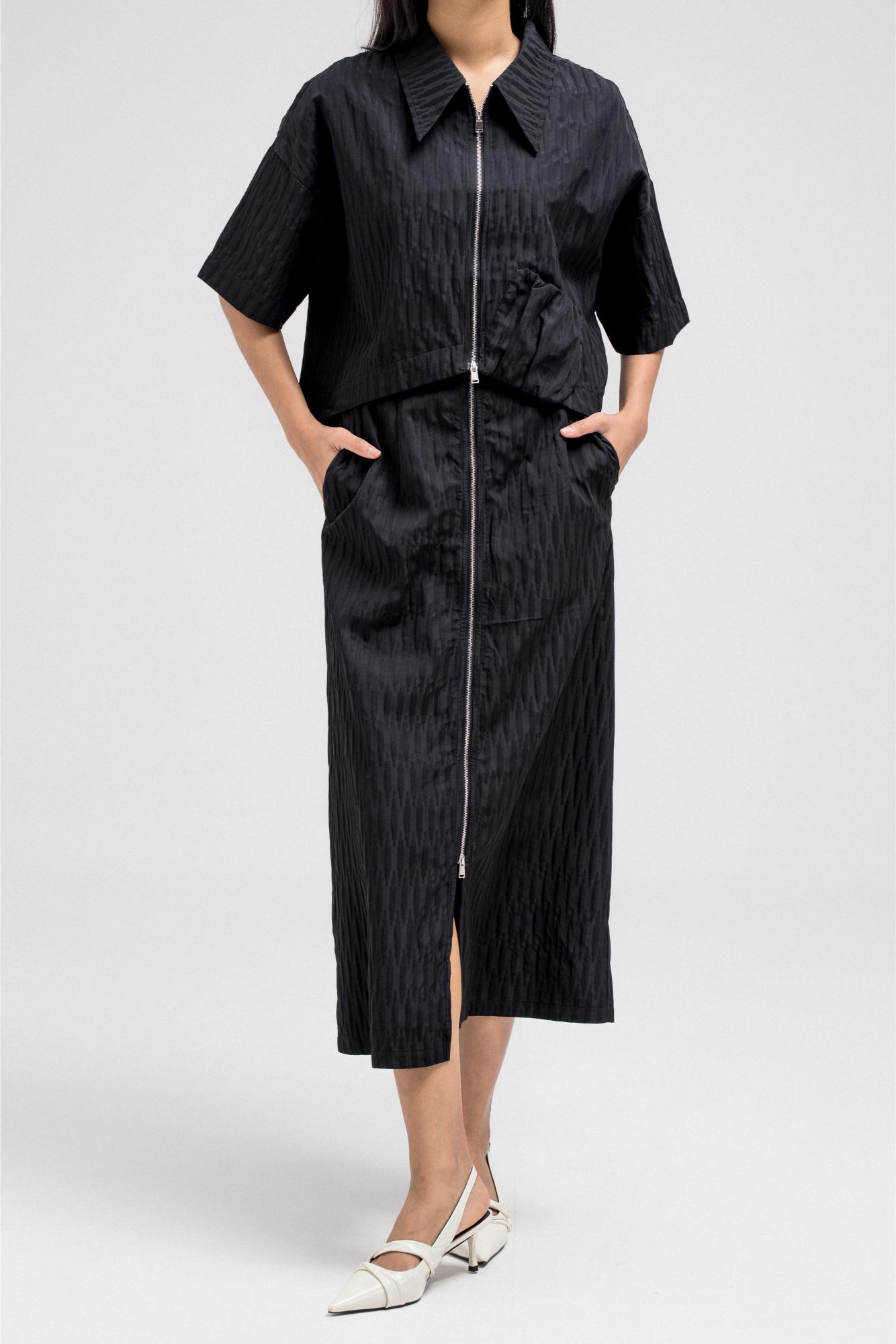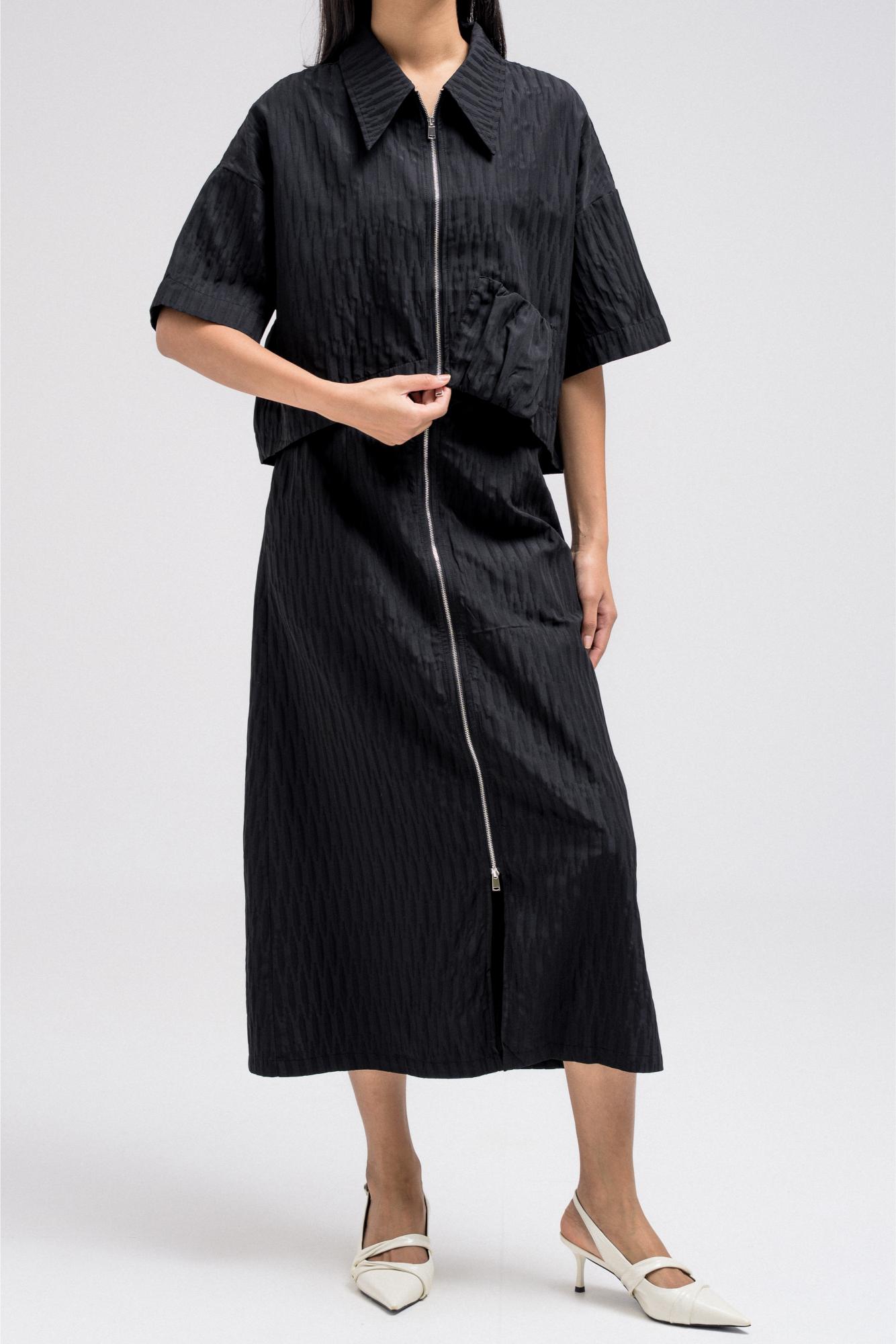 Cropped short sleeve top with a structured collar and front zip closure. Features a unique gathered pocket detail on one side. The fabric has a subtle textured pattern that adds depth to the look.