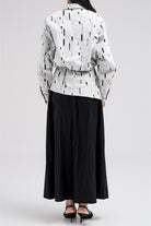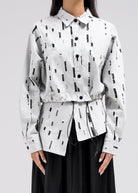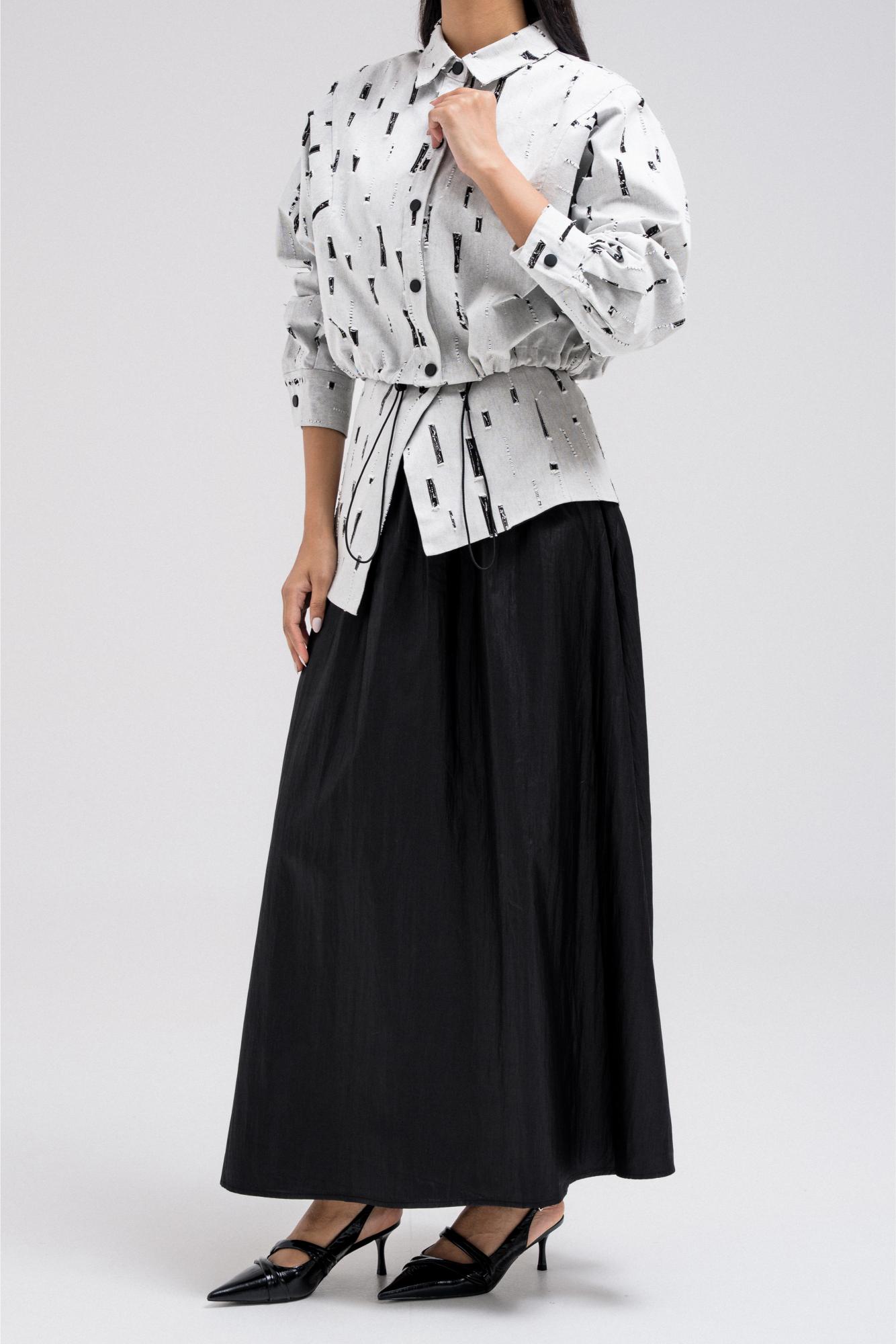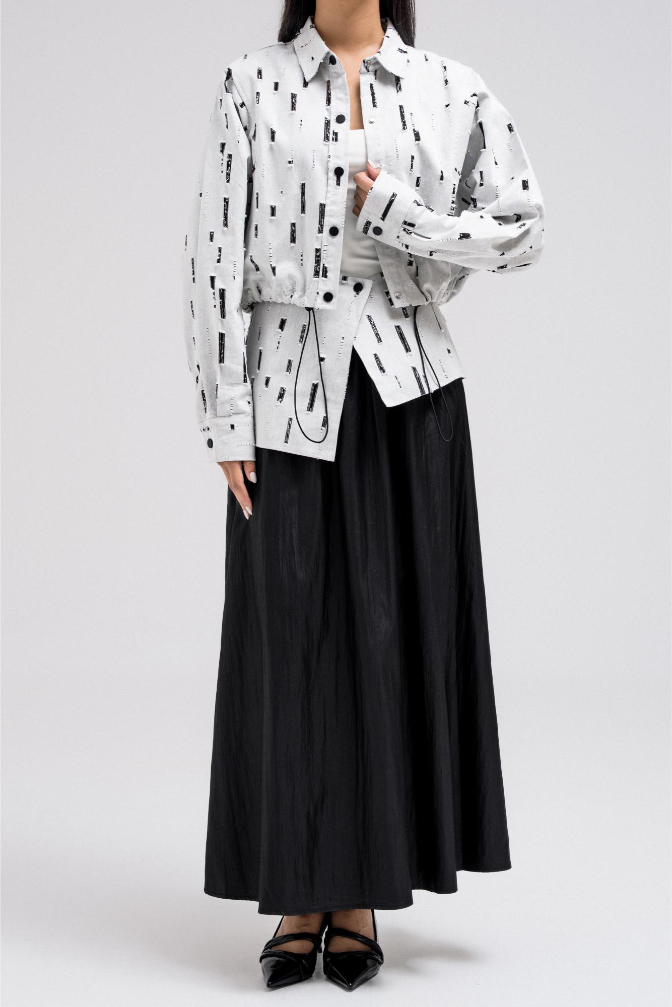 A modern cropped jacket featuring an elastic pull-hem detail that creates a slightly gathered silhouette. Finished with metal front closure hardware for a sleek touch, this piece adds structure while keeping the look contemporary and versatile.