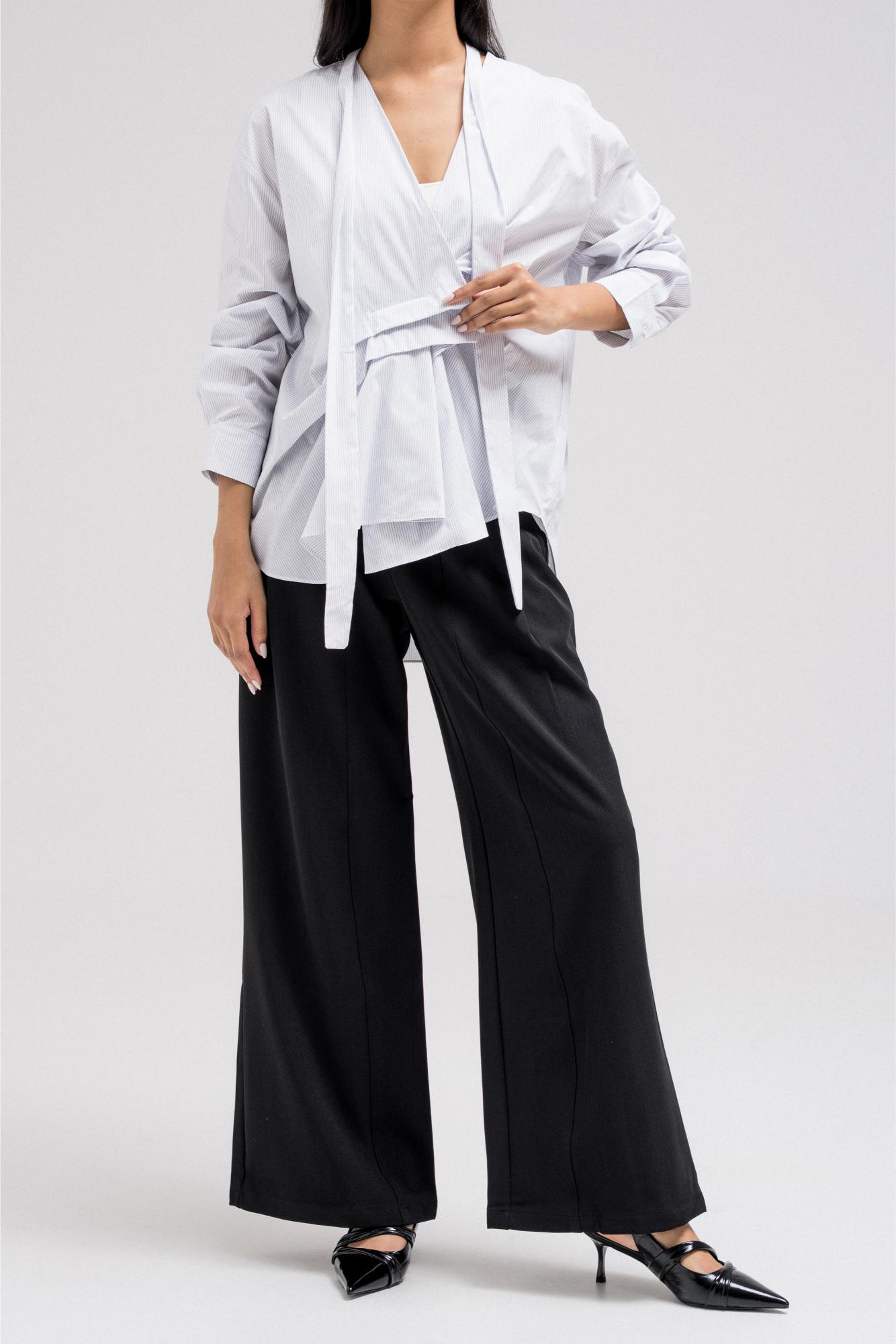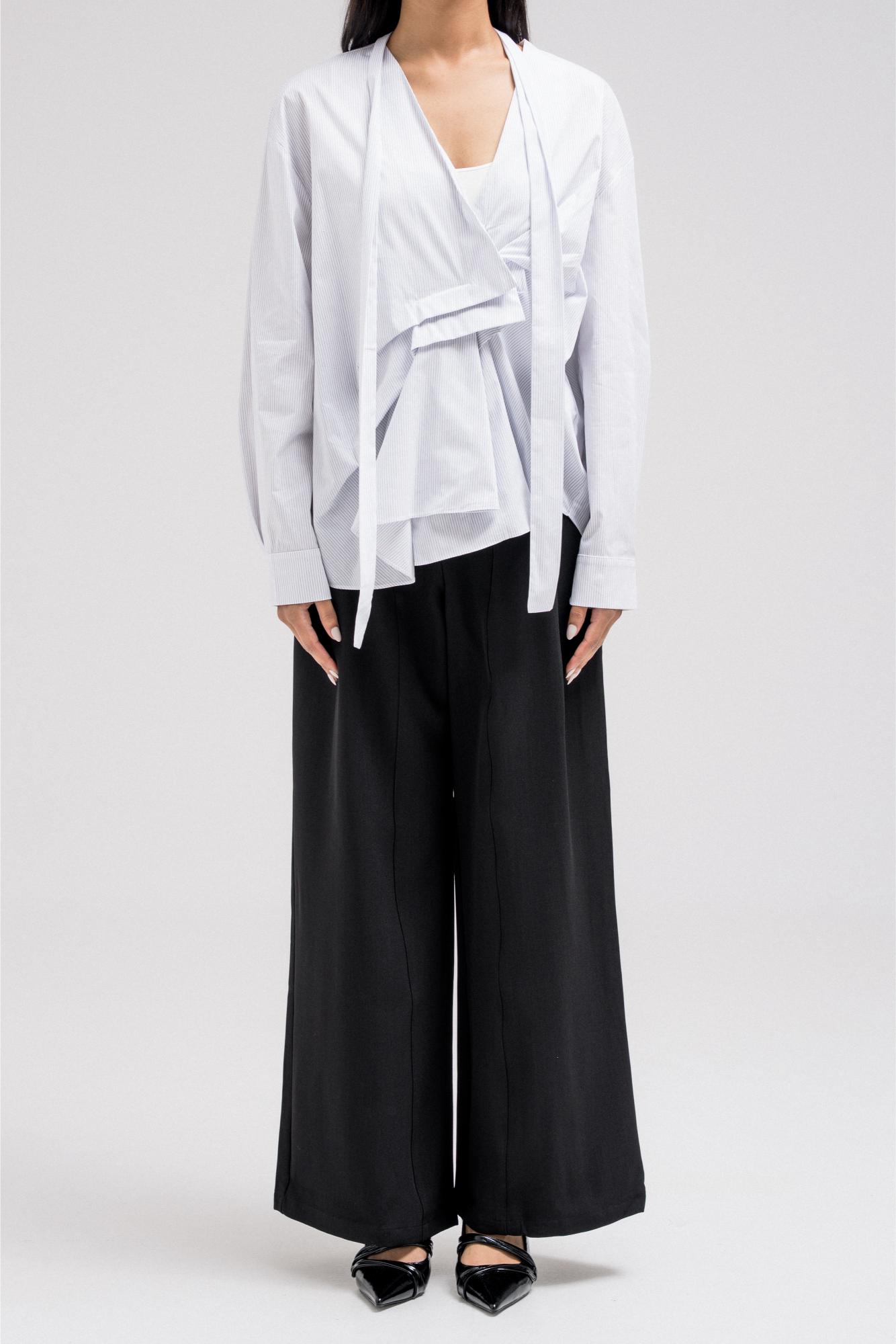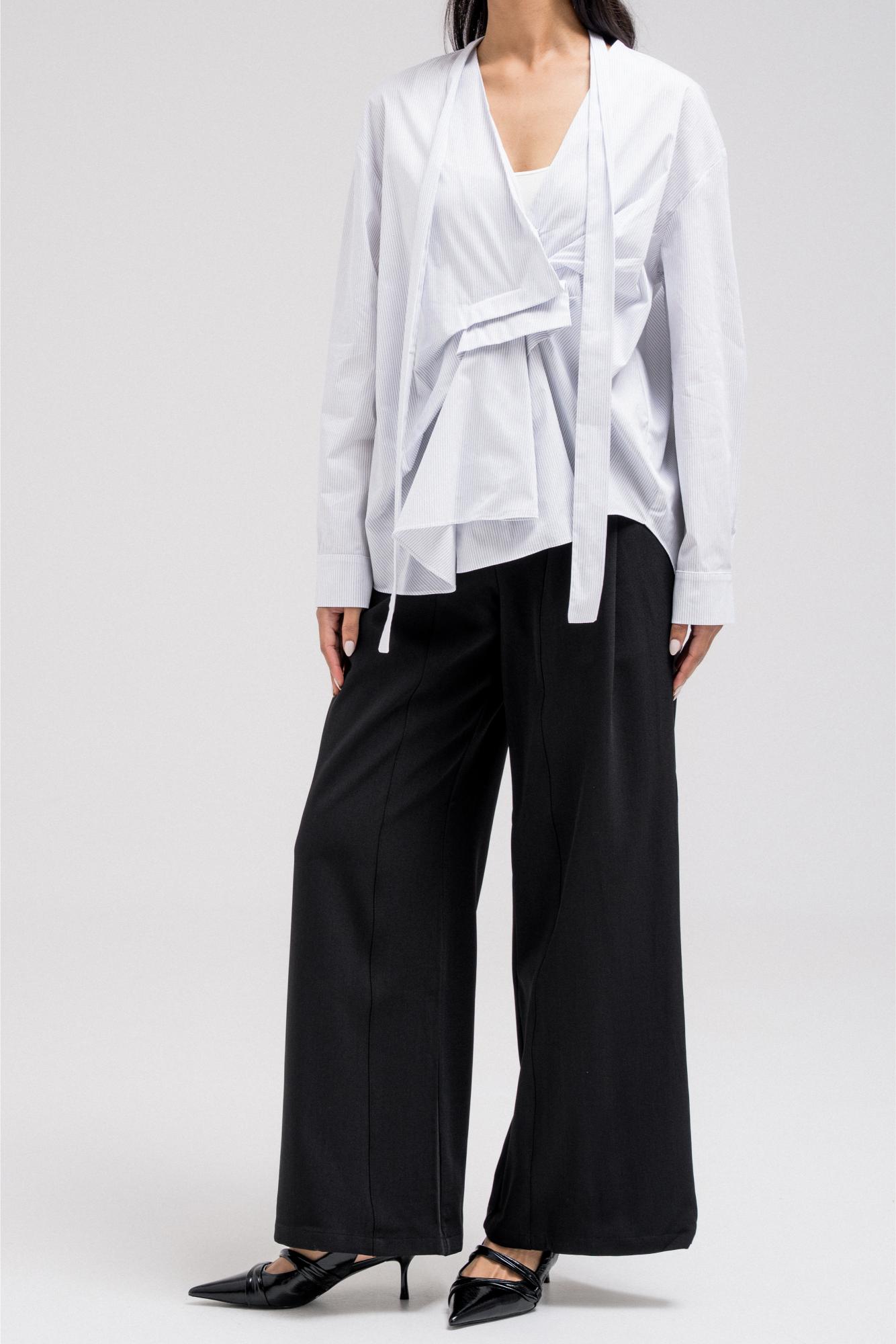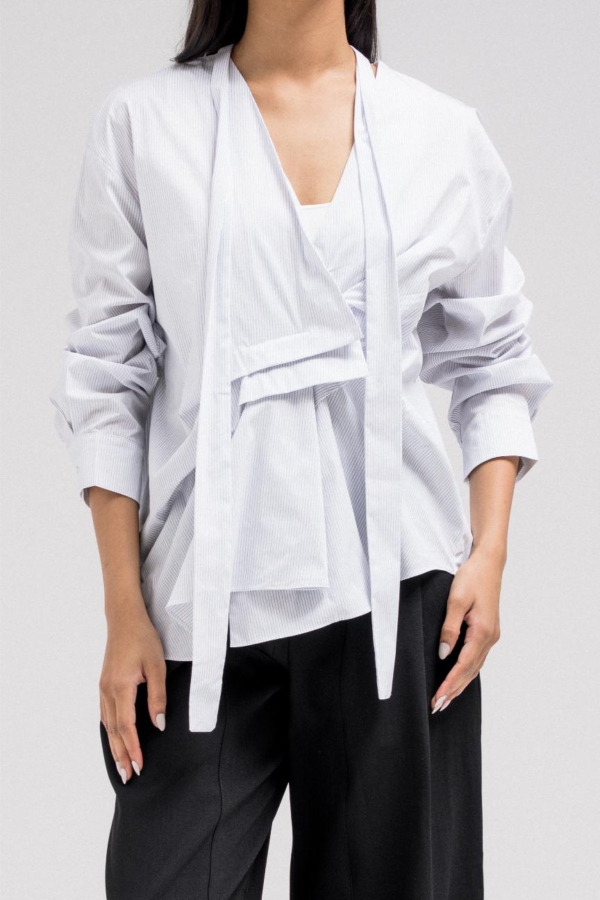 Lightweight striped shirt designed in a wrap-style silhouette, creating soft layered folds at the front. It comes with a matching fabric belt to cinch the waist and enhance the shape. Features a classic collar, long sleeves with structured cuffs, and an extended front panel detail that adds movement and dimension.