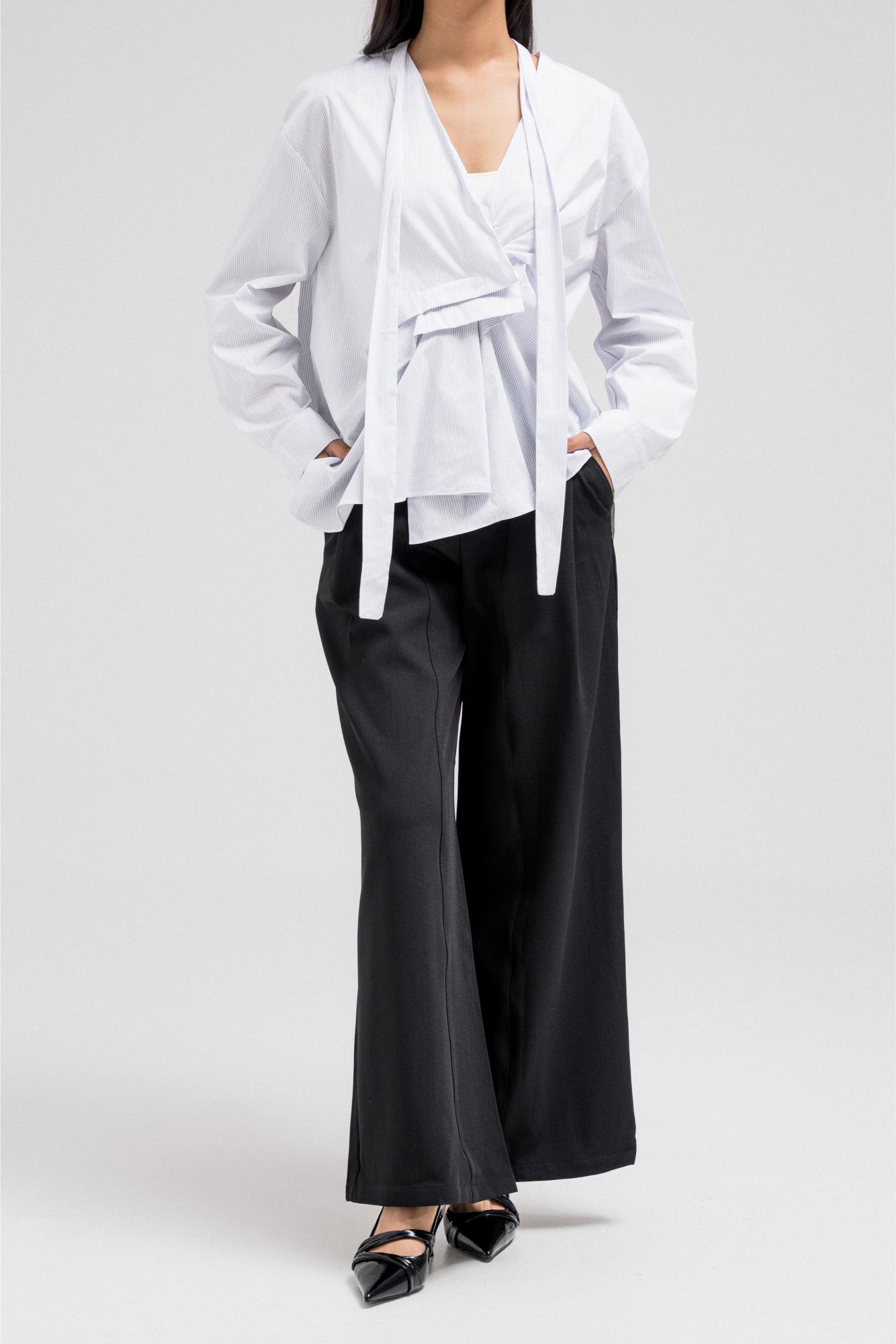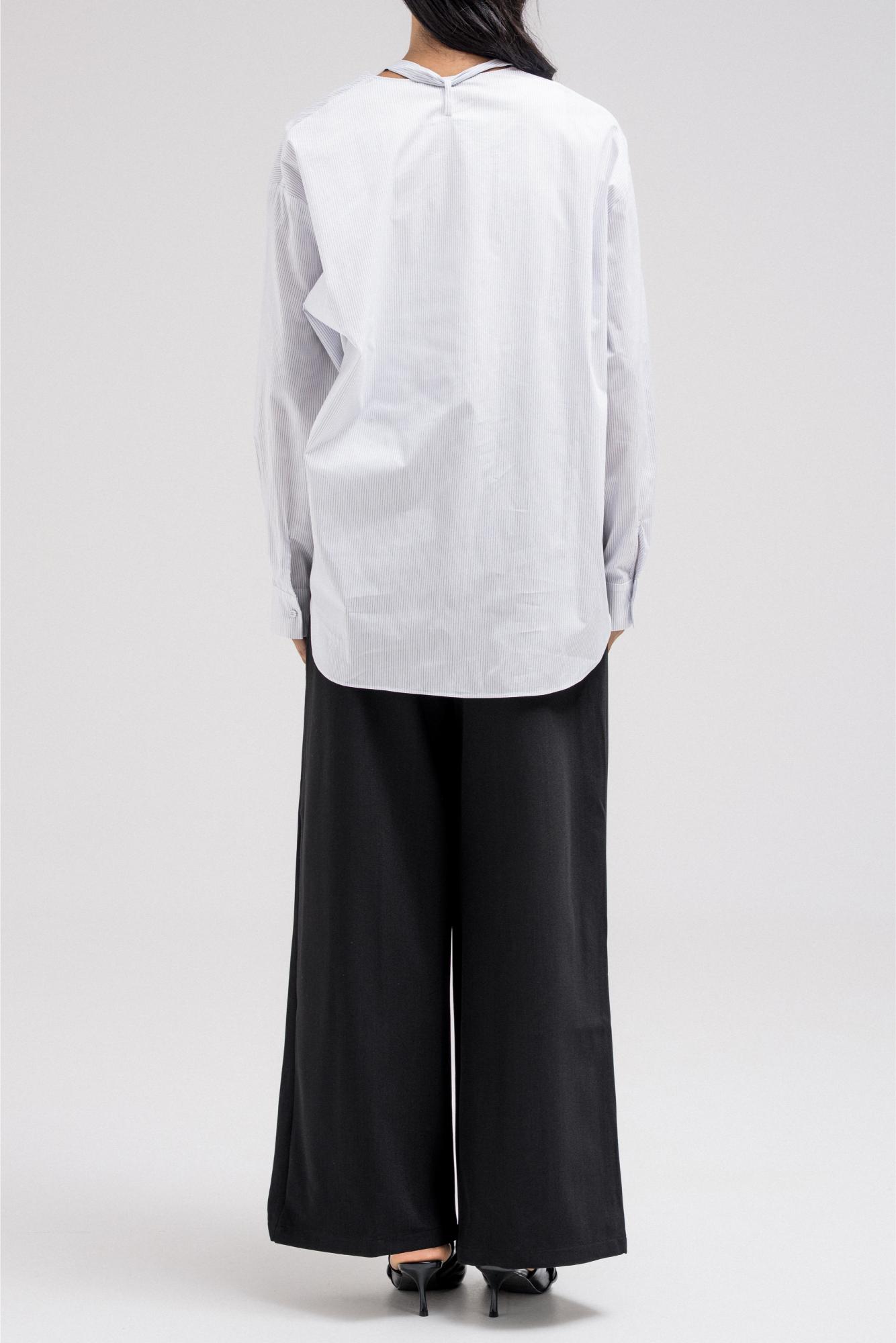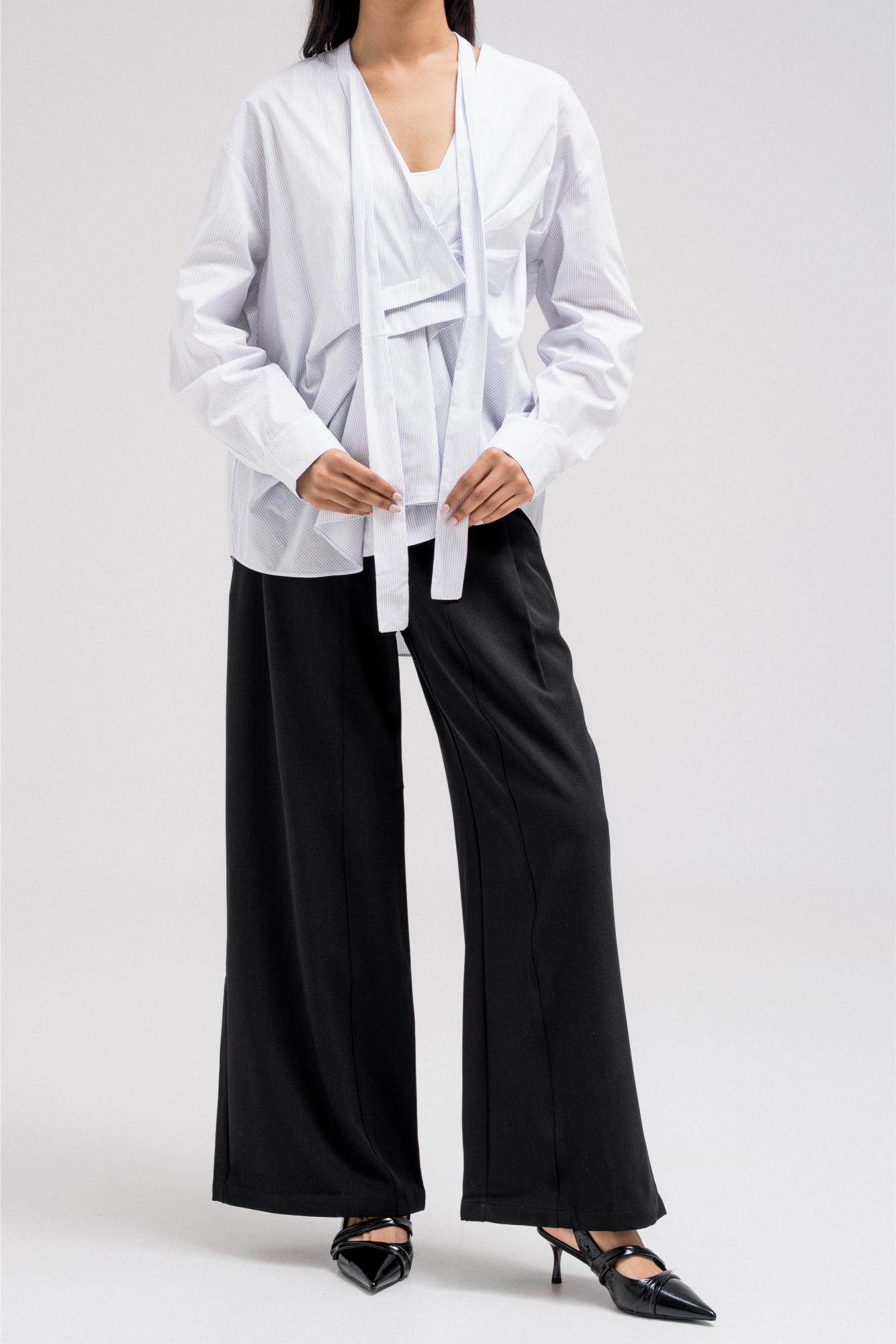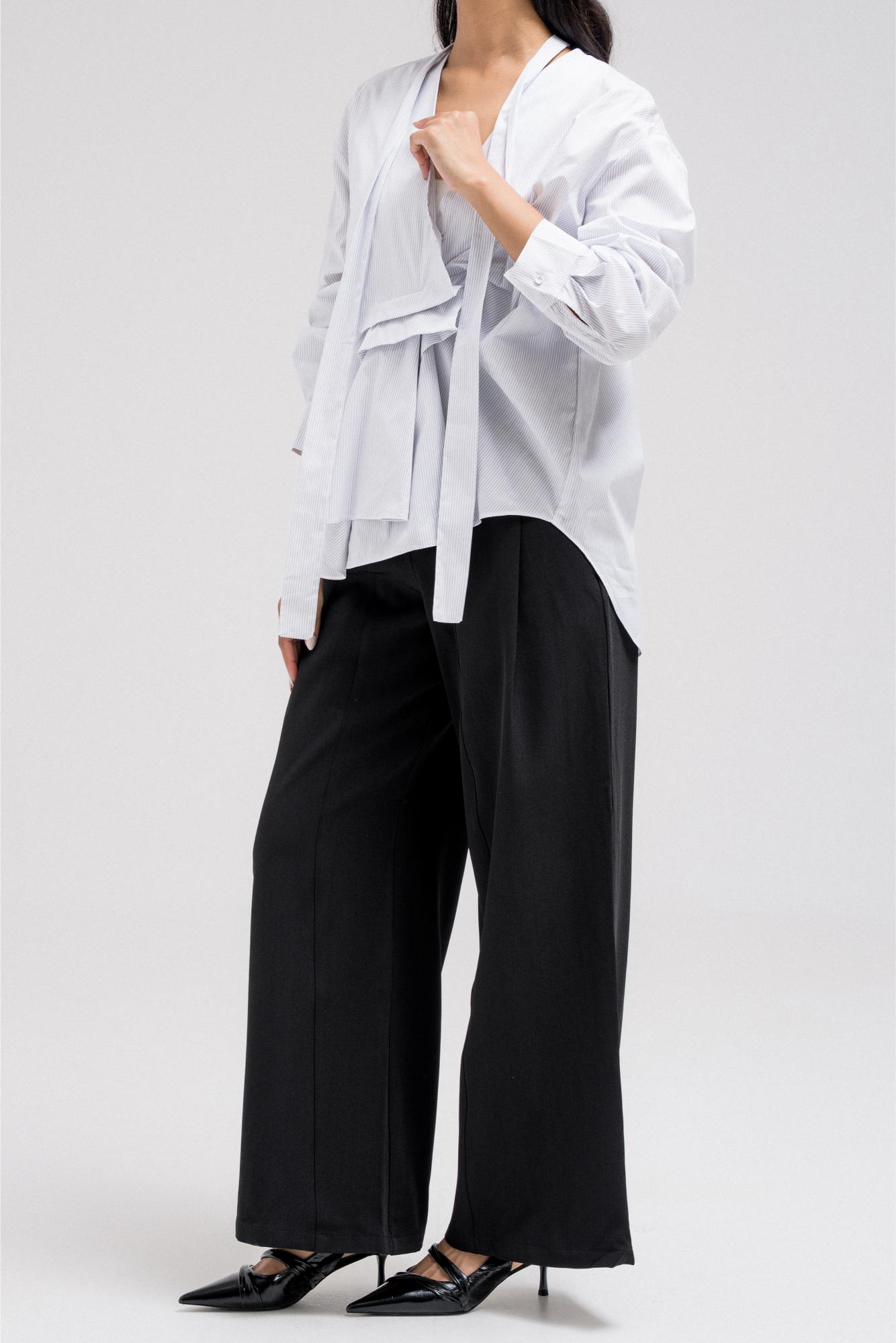Lightweight striped shirt designed in a wrap-style silhouette, creating soft layered folds at the front. It comes with a matching fabric belt to cinch the waist and enhance the shape. Features a classic collar, long sleeves with structured cuffs, and an extended front panel detail that adds movement and dimension.
