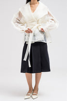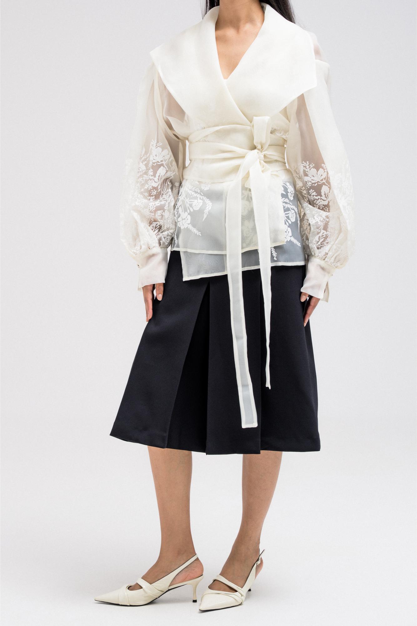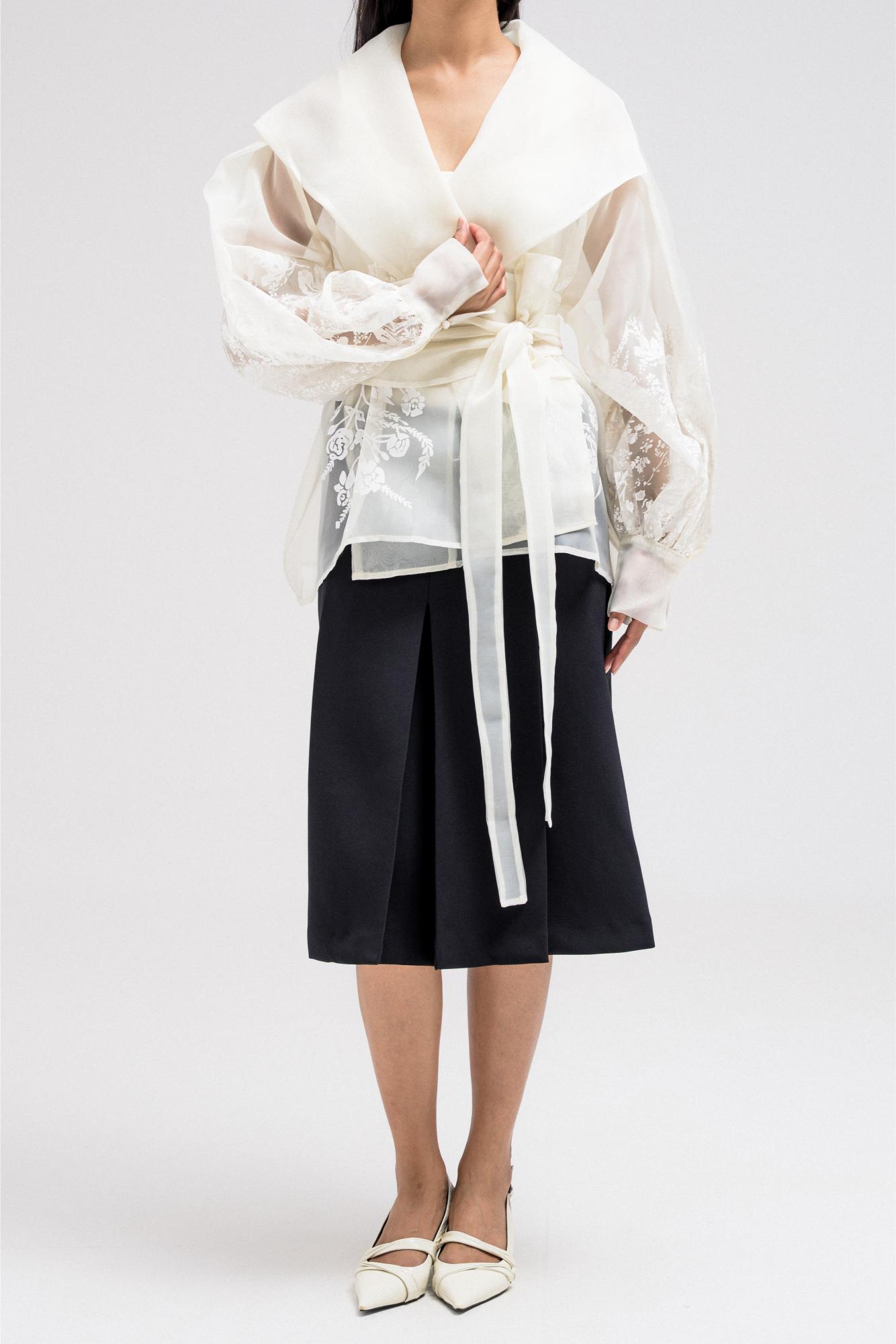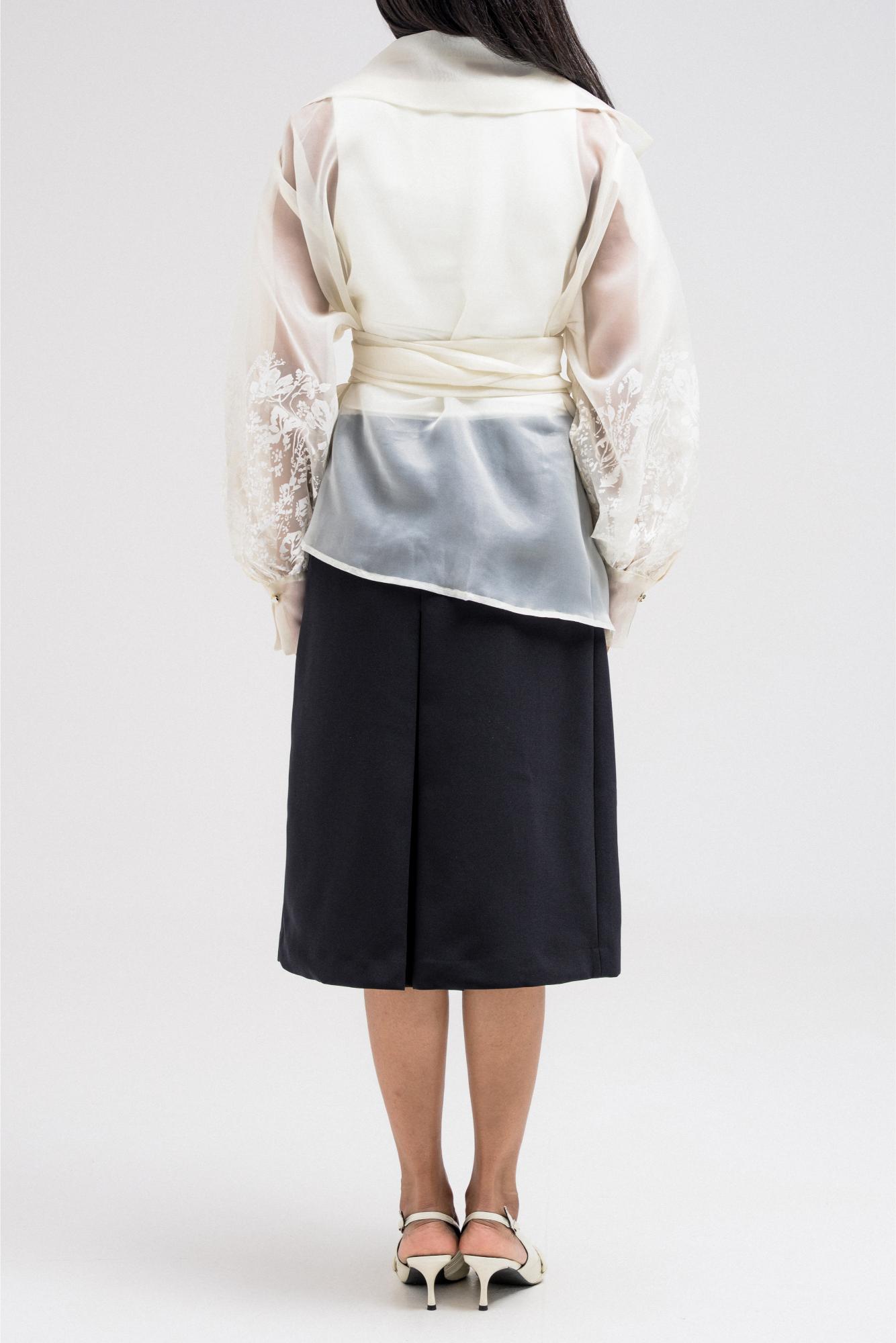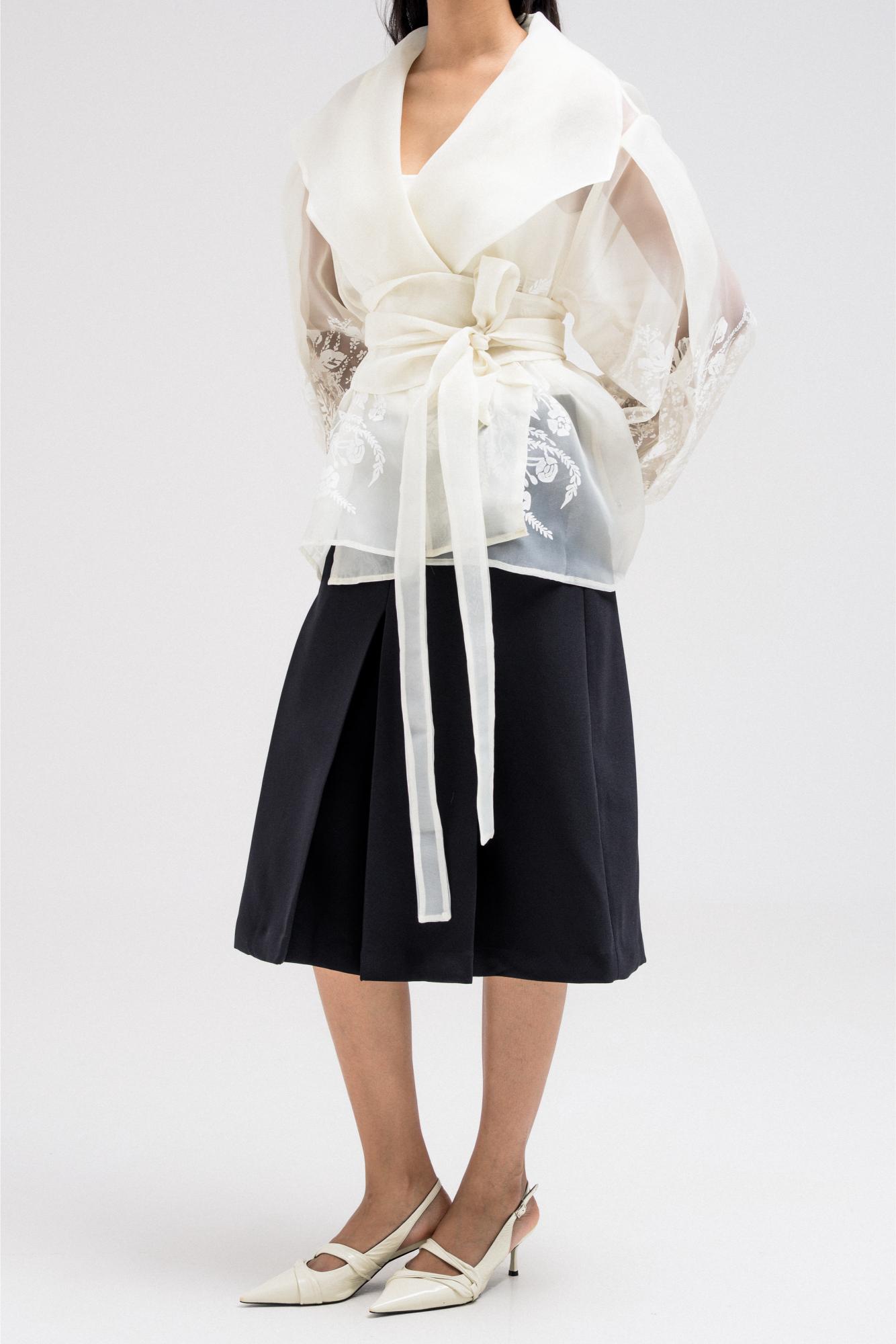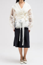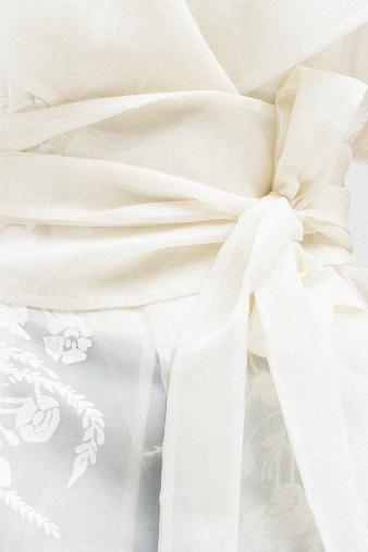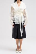 thin sheer wrap-style top designed with delicate floral-like embroidery across the lower sleeves and body. It features a shawl-style collar that drapes elegantly around the neckline, adding a sophisticated touch. The waist is defined with a matching fabric belt that ties at the front, enhancing the feminine silhouette while keeping the look refined and graceful.