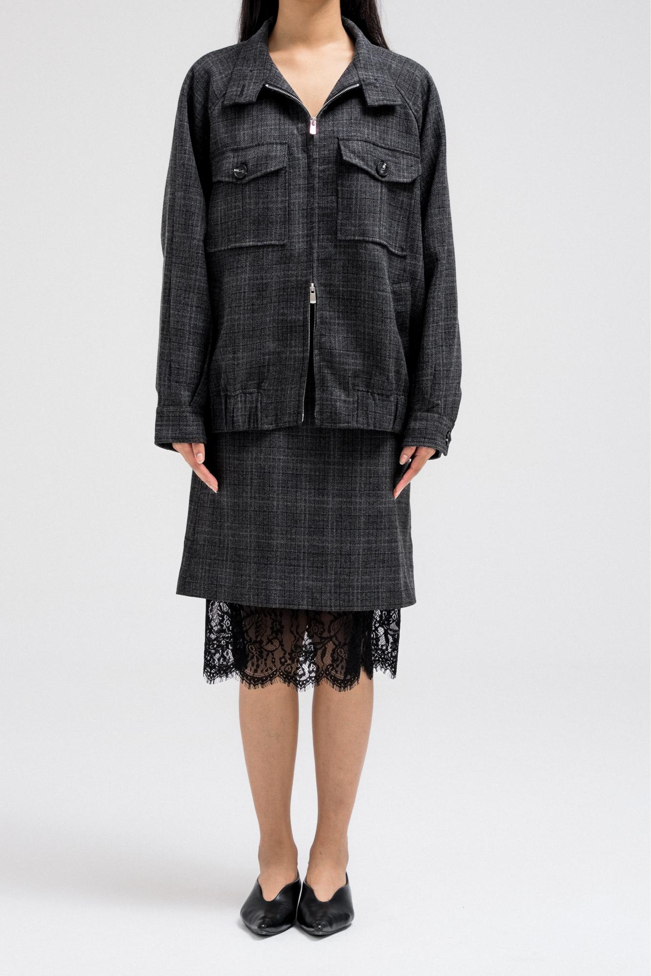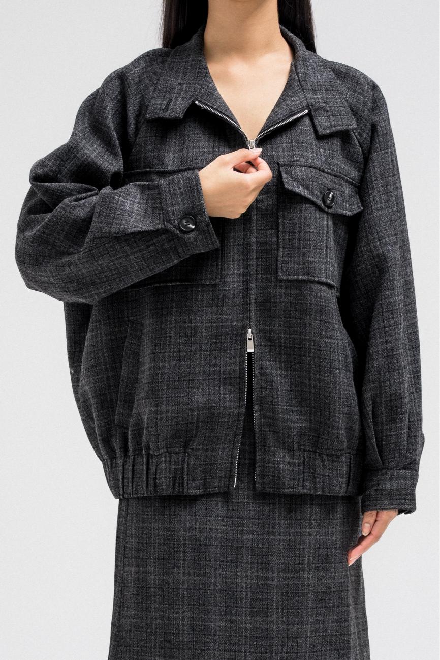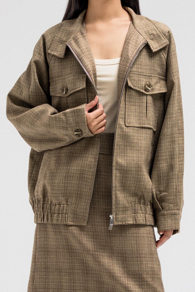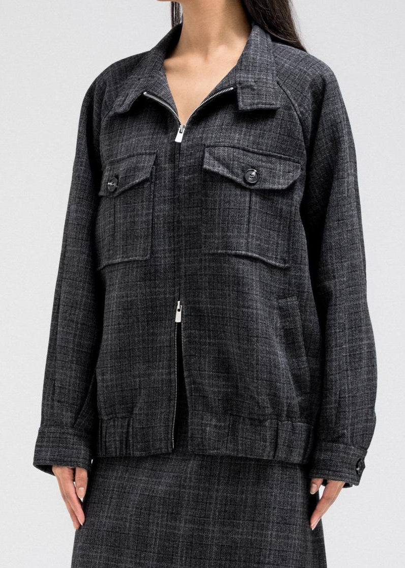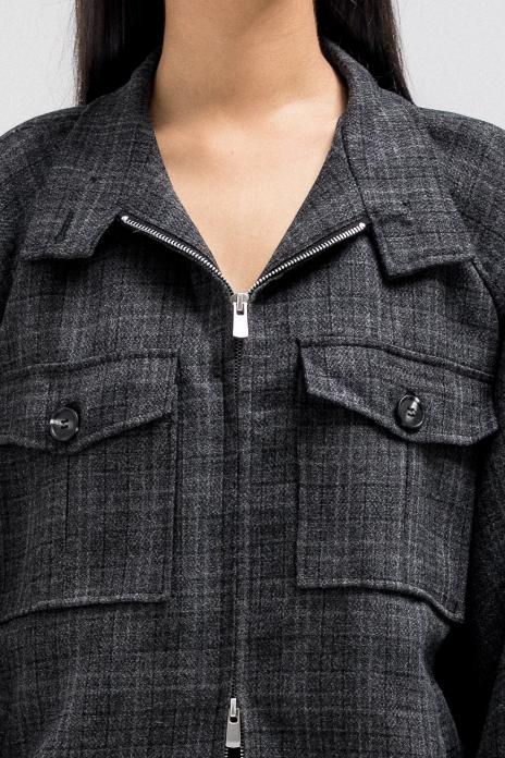 Structured jacket featuring a subtle check design that adds depth and a refined classic touch to the look. It comes with a front zipper closure, functional side pockets, and flap chest pockets for a clean, tailored finish. Designed to pair perfectly with its matching skirt for a coordinated set.
