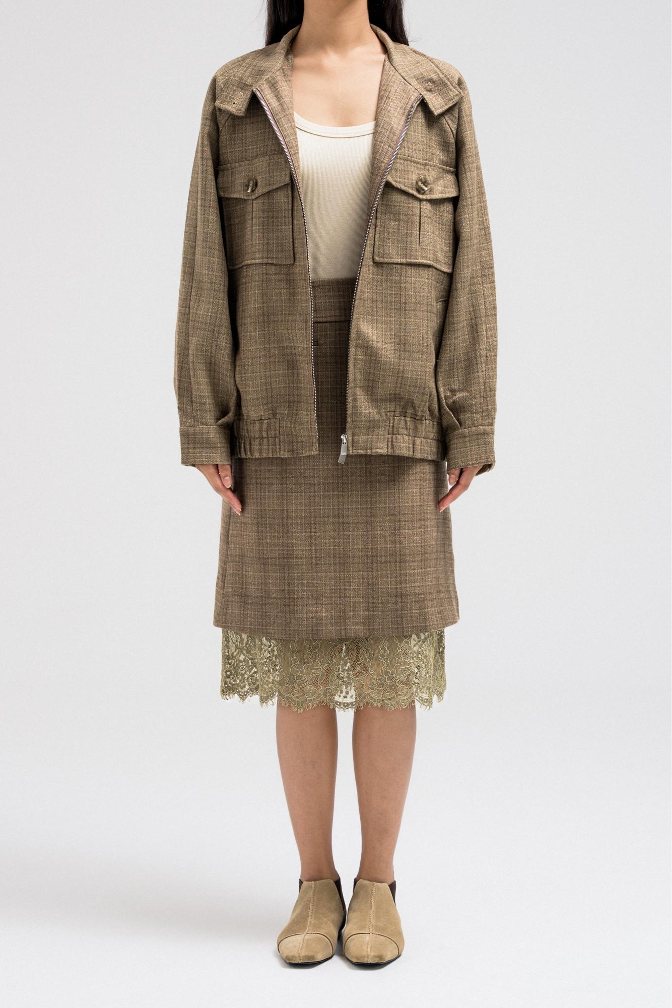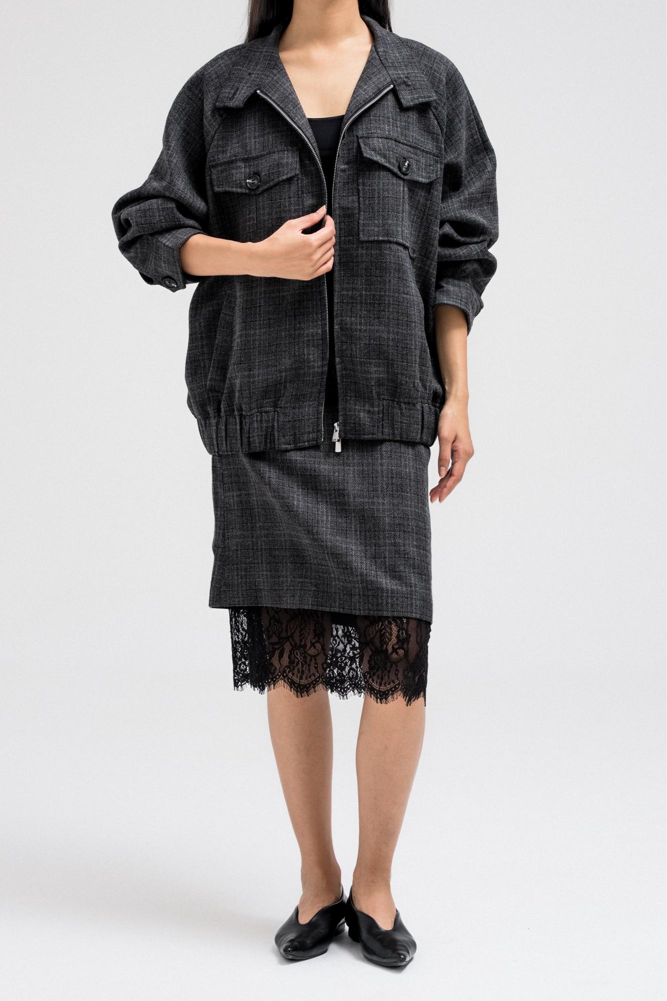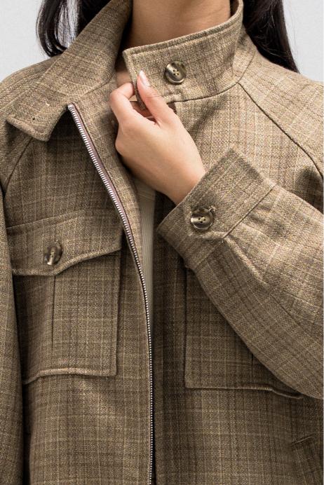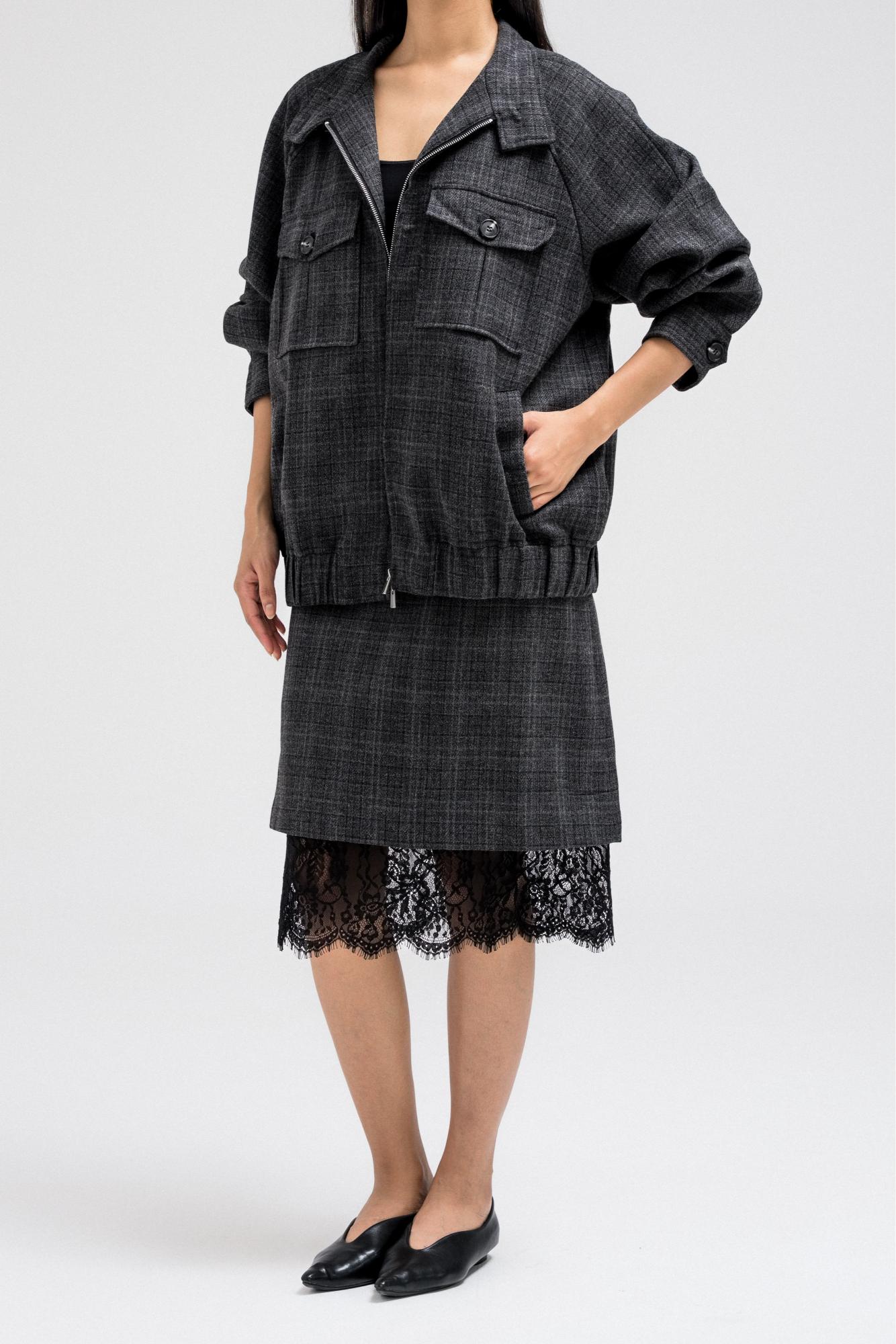 Structured jacket featuring a subtle check design that adds depth and a refined classic touch to the look. It comes with a front zipper closure, functional side pockets, and flap chest pockets for a clean, tailored finish. Designed to pair perfectly with its matching skirt for a coordinated set.