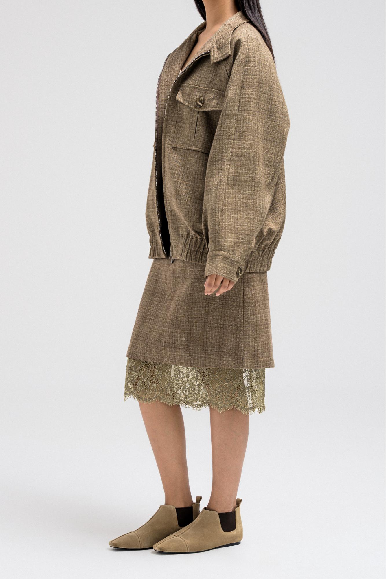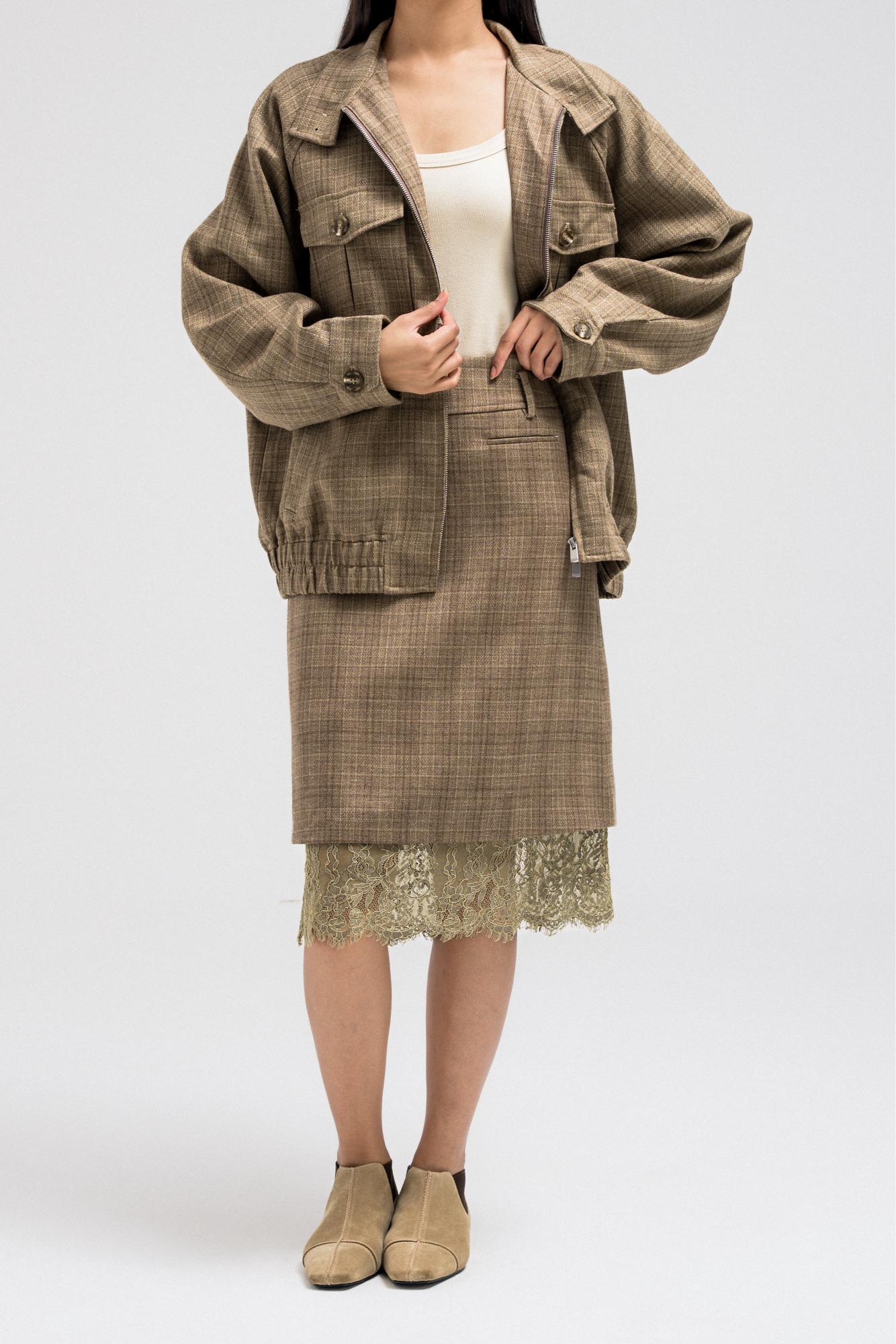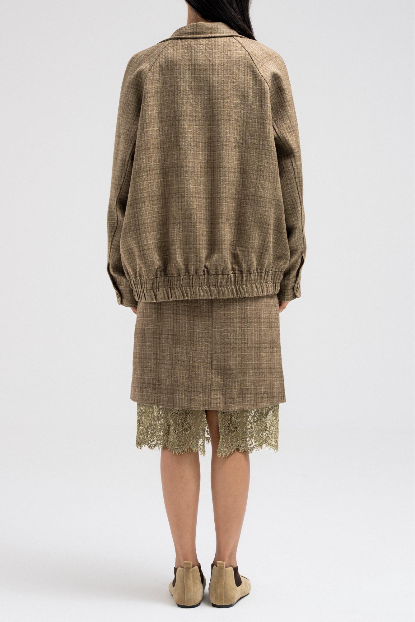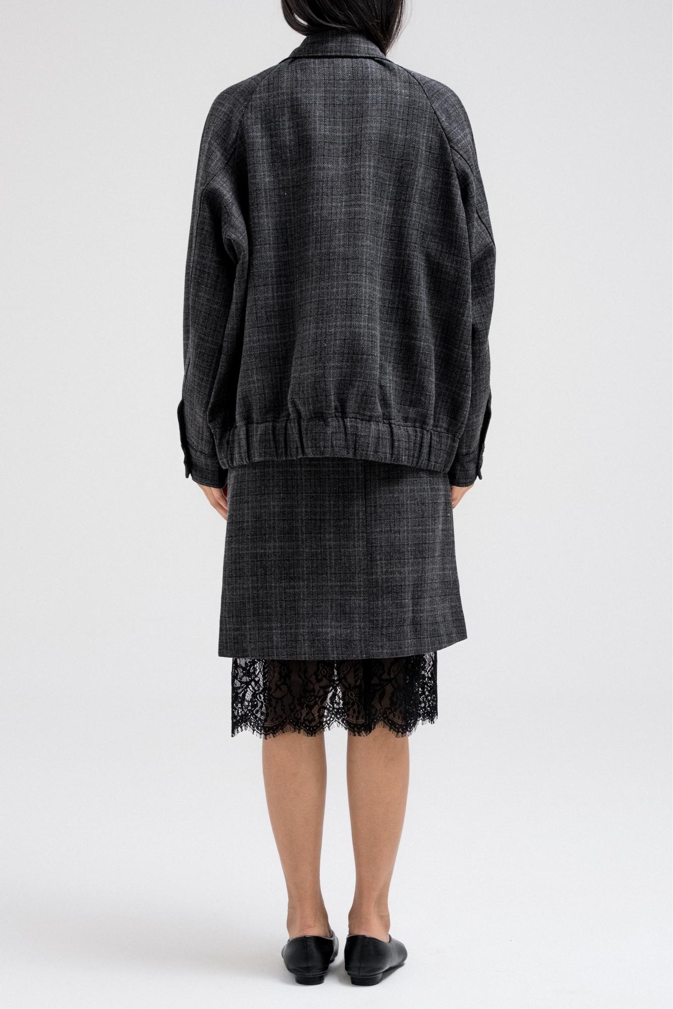 Structured jacket featuring a subtle check design that adds depth and a refined classic touch to the look. It comes with a front zipper closure, functional side pockets, and flap chest pockets for a clean, tailored finish. Designed to pair perfectly with its matching skirt for a coordinated set.