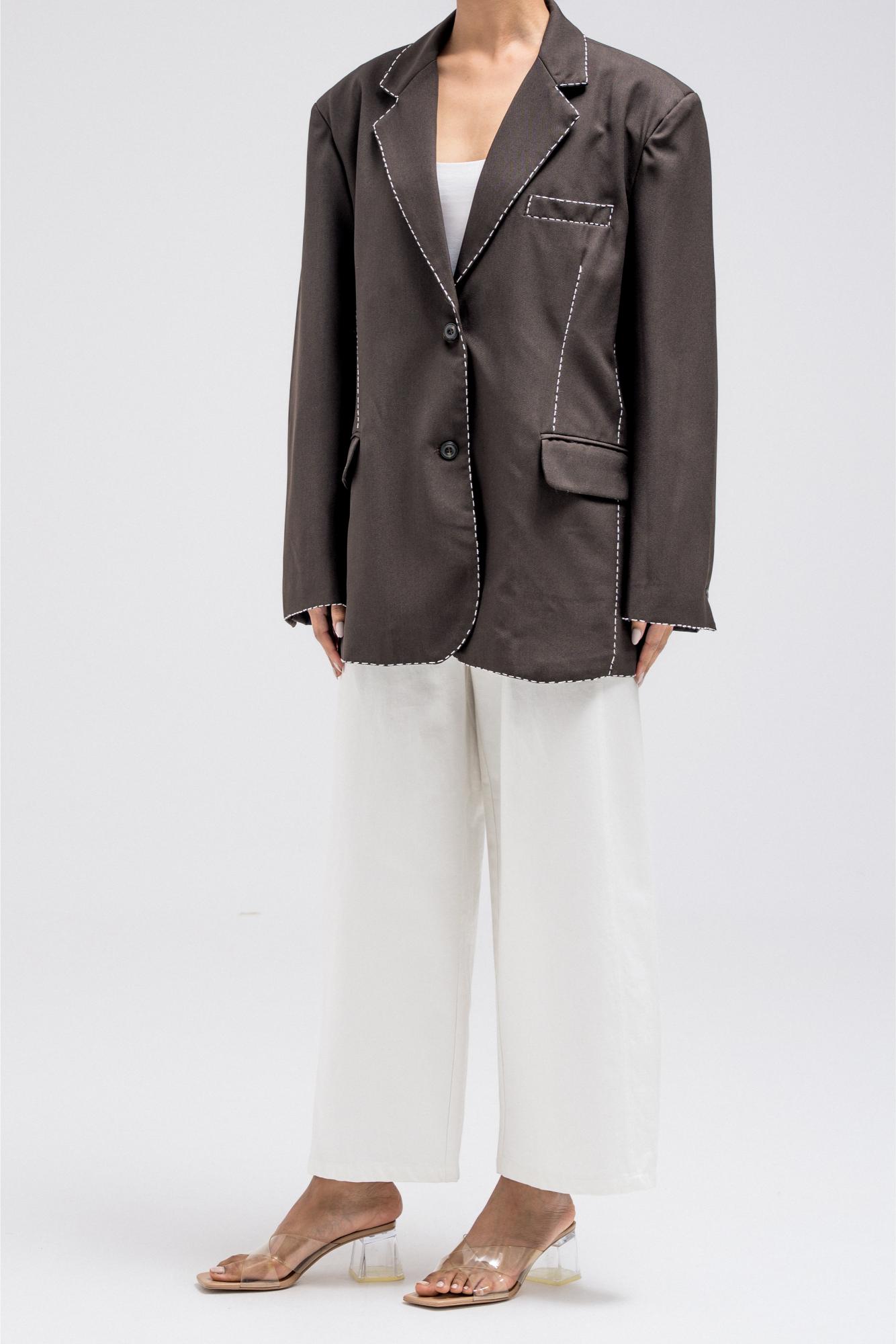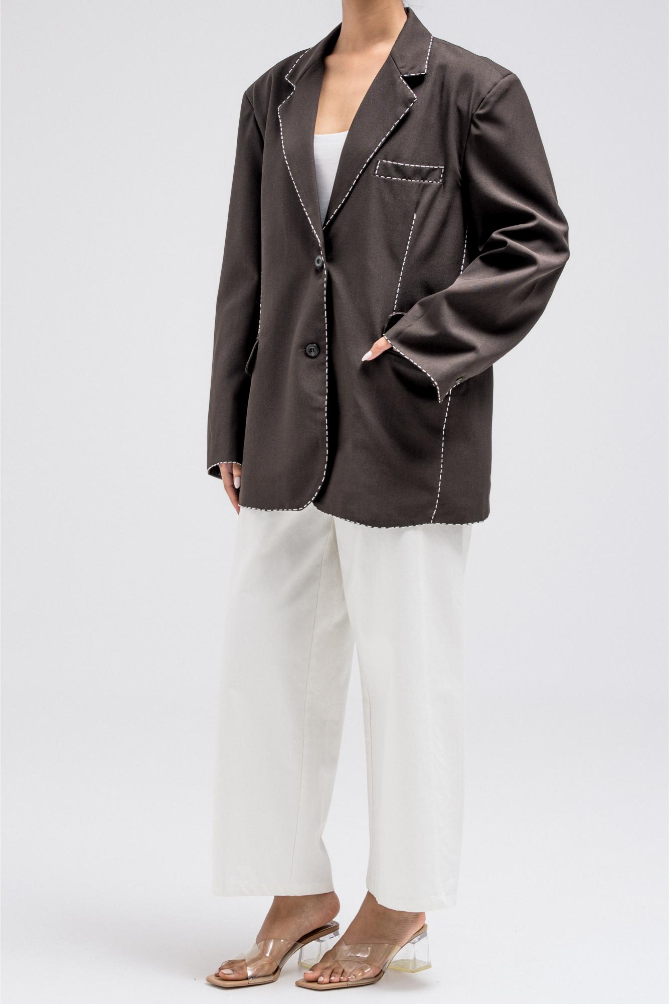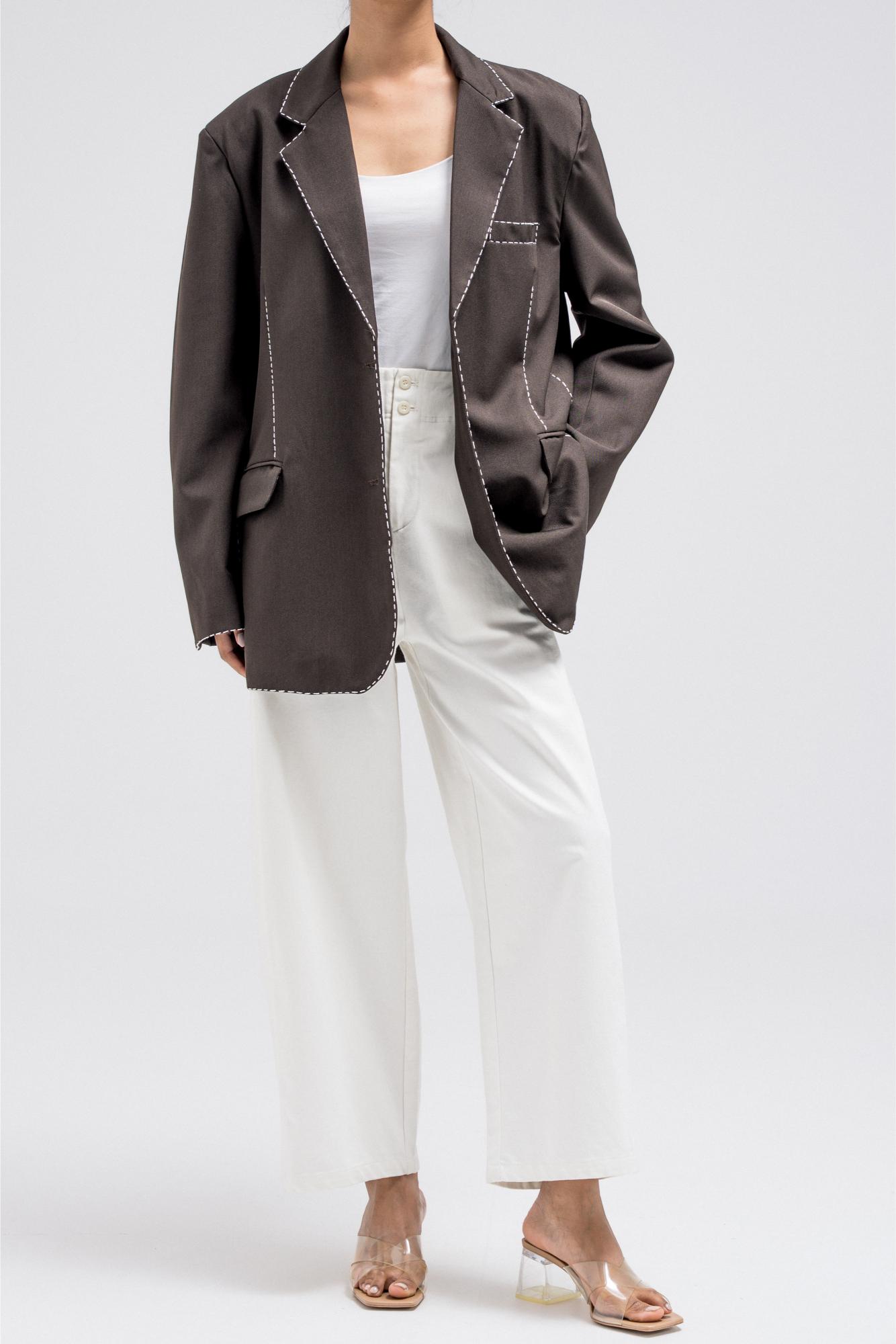 This modern blazer features a unique two-piece design, complete with a cropped spaghetti-strap top that can be worn layered over the blazer to add depth and dimension to the look. The structured outer layer balances the delicate inner piece, creating a fashion-forward style.