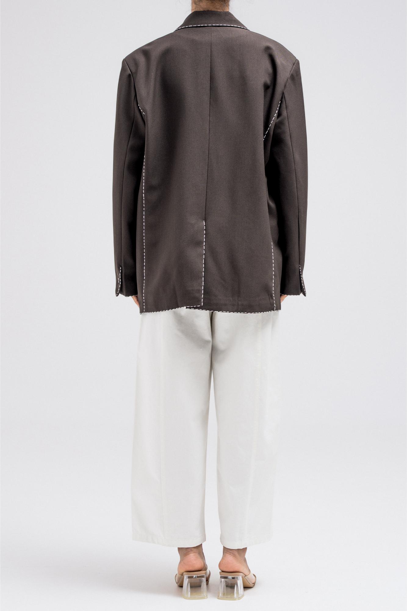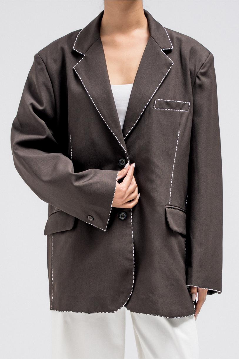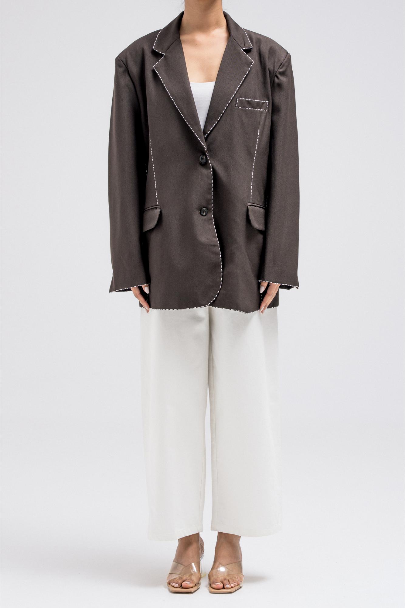 This modern blazer features a unique two-piece design, complete with a cropped spaghetti-strap top that can be worn layered over the blazer to add depth and dimension to the look. The structured outer layer balances the delicate inner piece, creating a fashion-forward style.