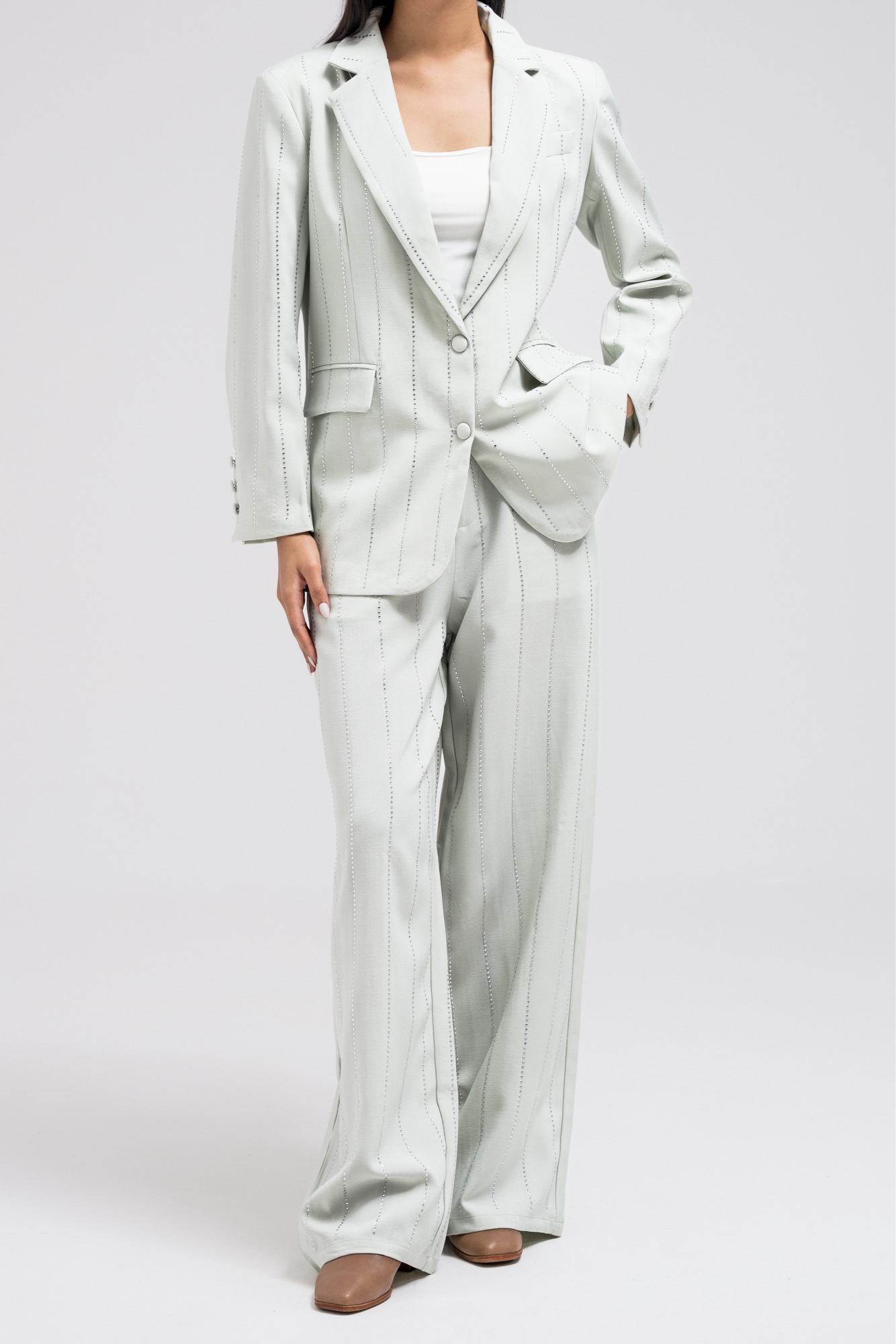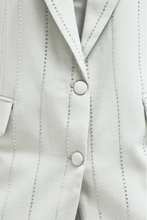 This tailored blazer is elevated with delicate stripe rhinestone detailing that adds a subtle shimmer to its structured silhouette. Designed with a clean front button closure, it balances elegance and modern edge, making it perfect for both day and evening looks. Style it with the matching pants for a refined, coordinated outfit with a touch of sparkle.