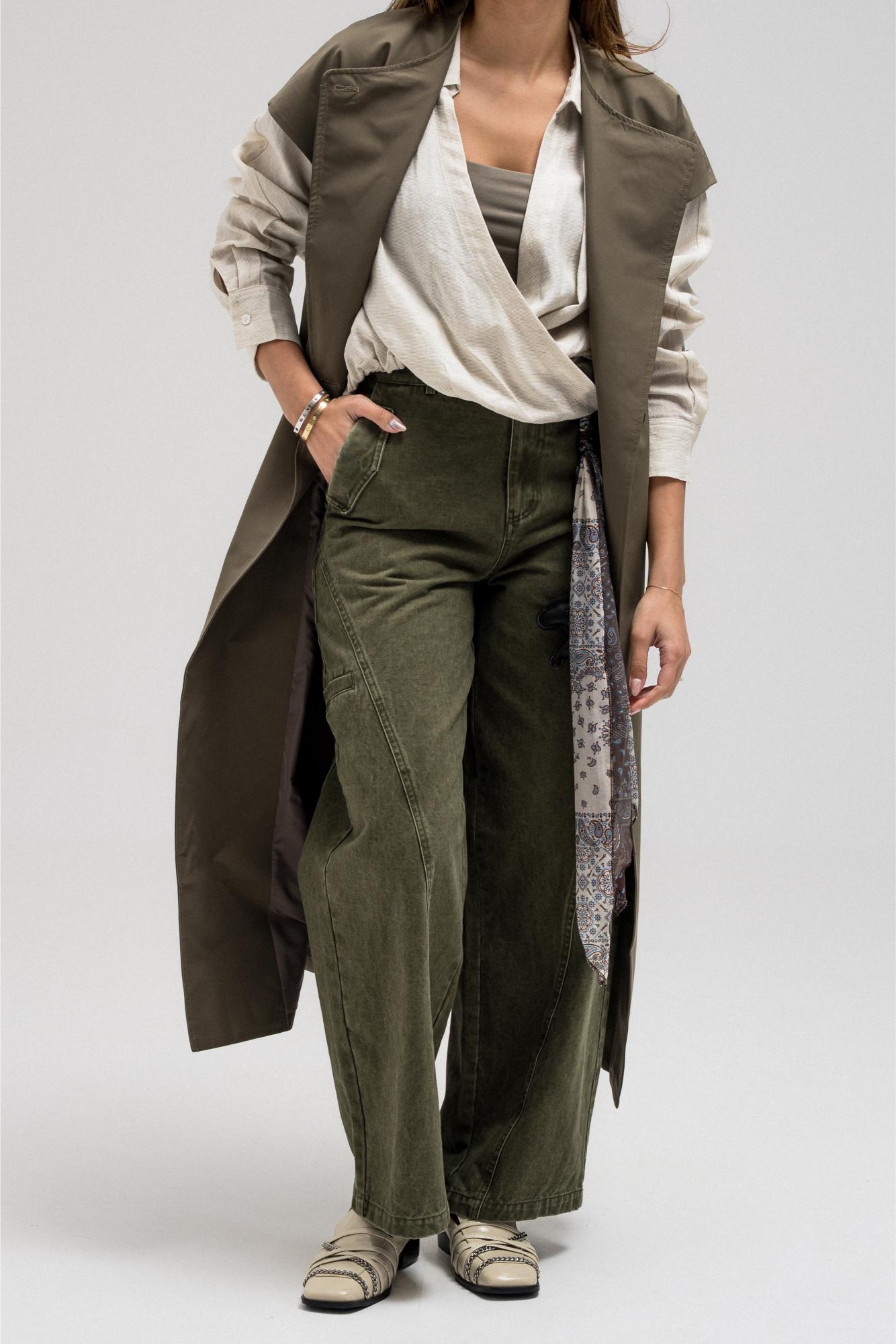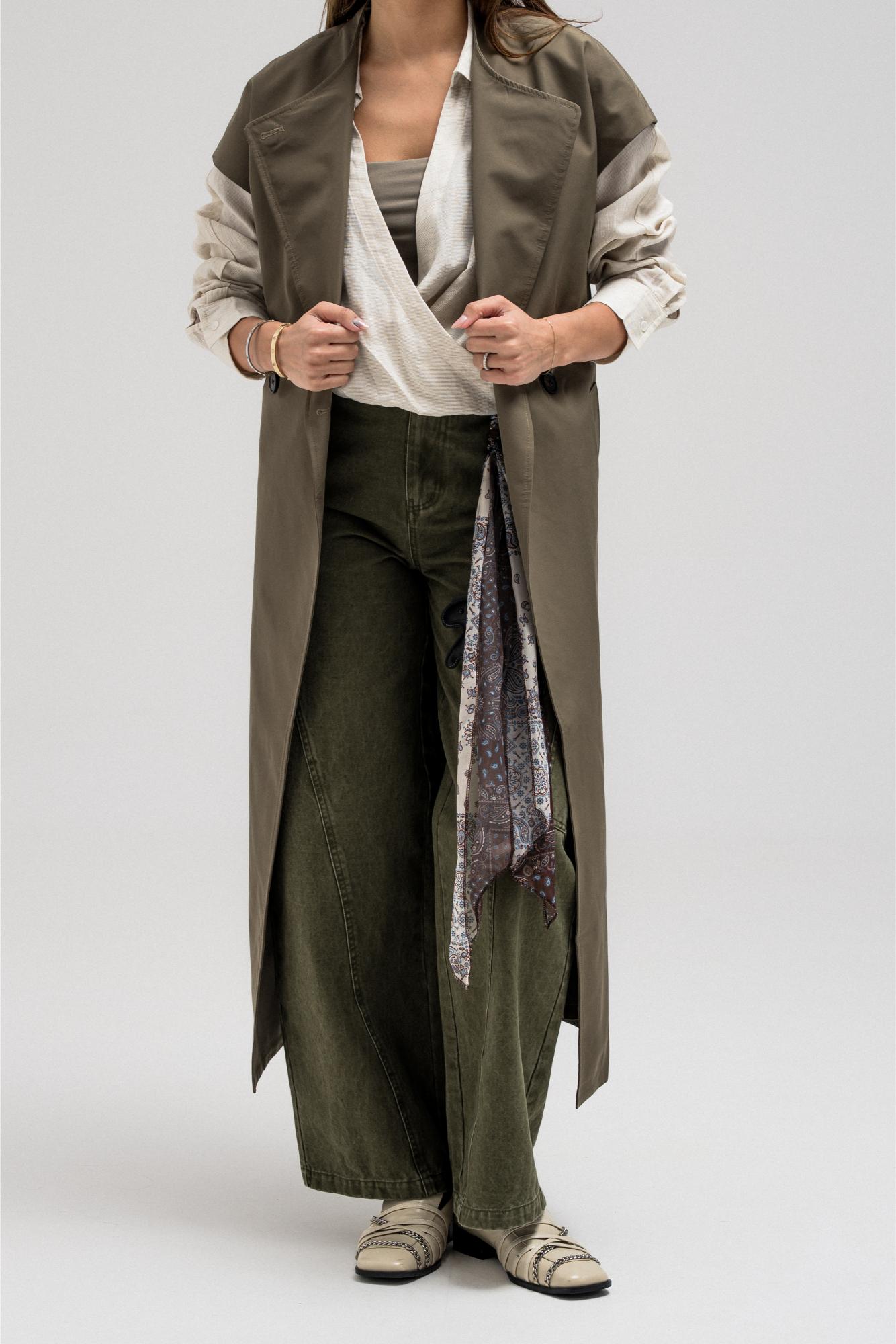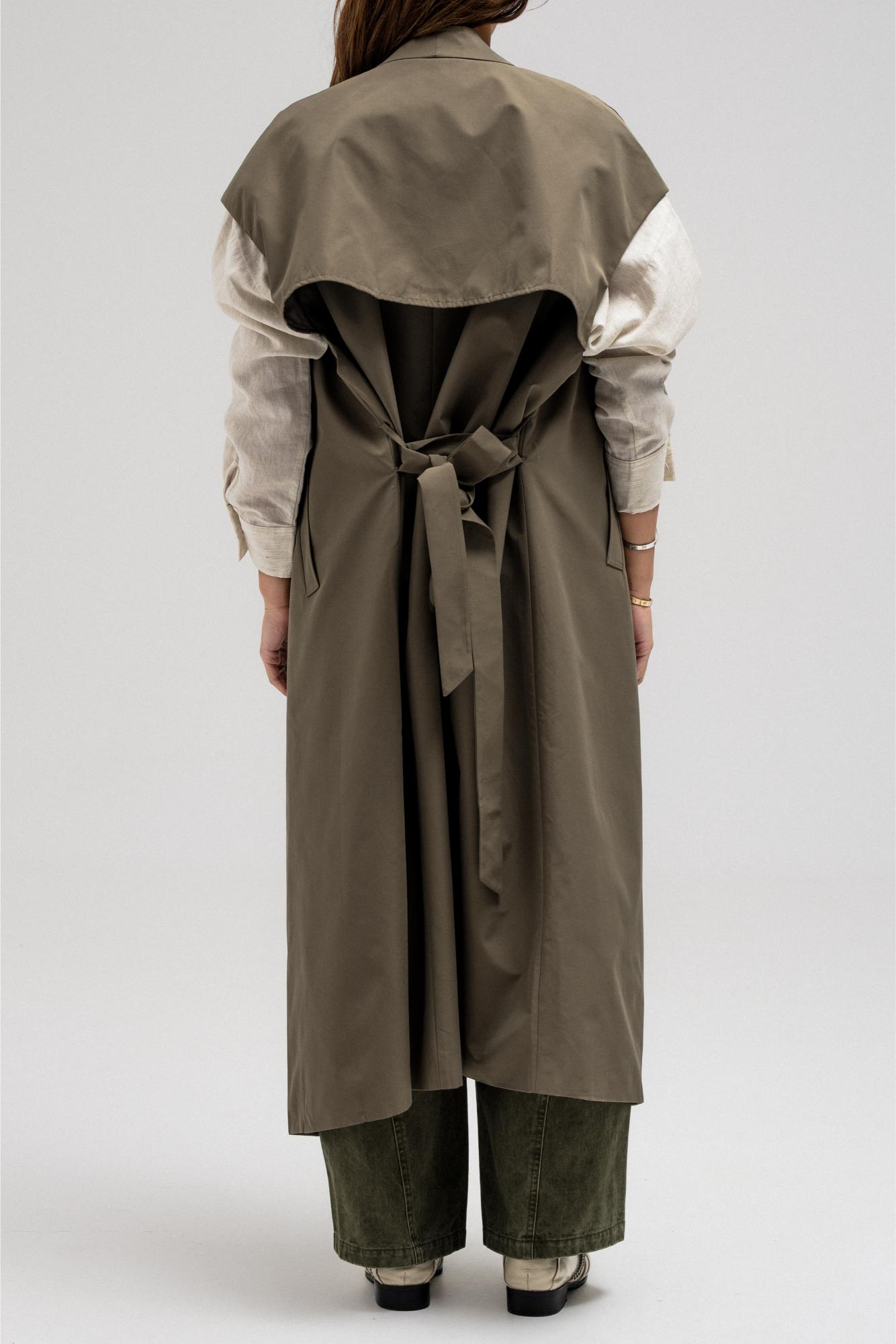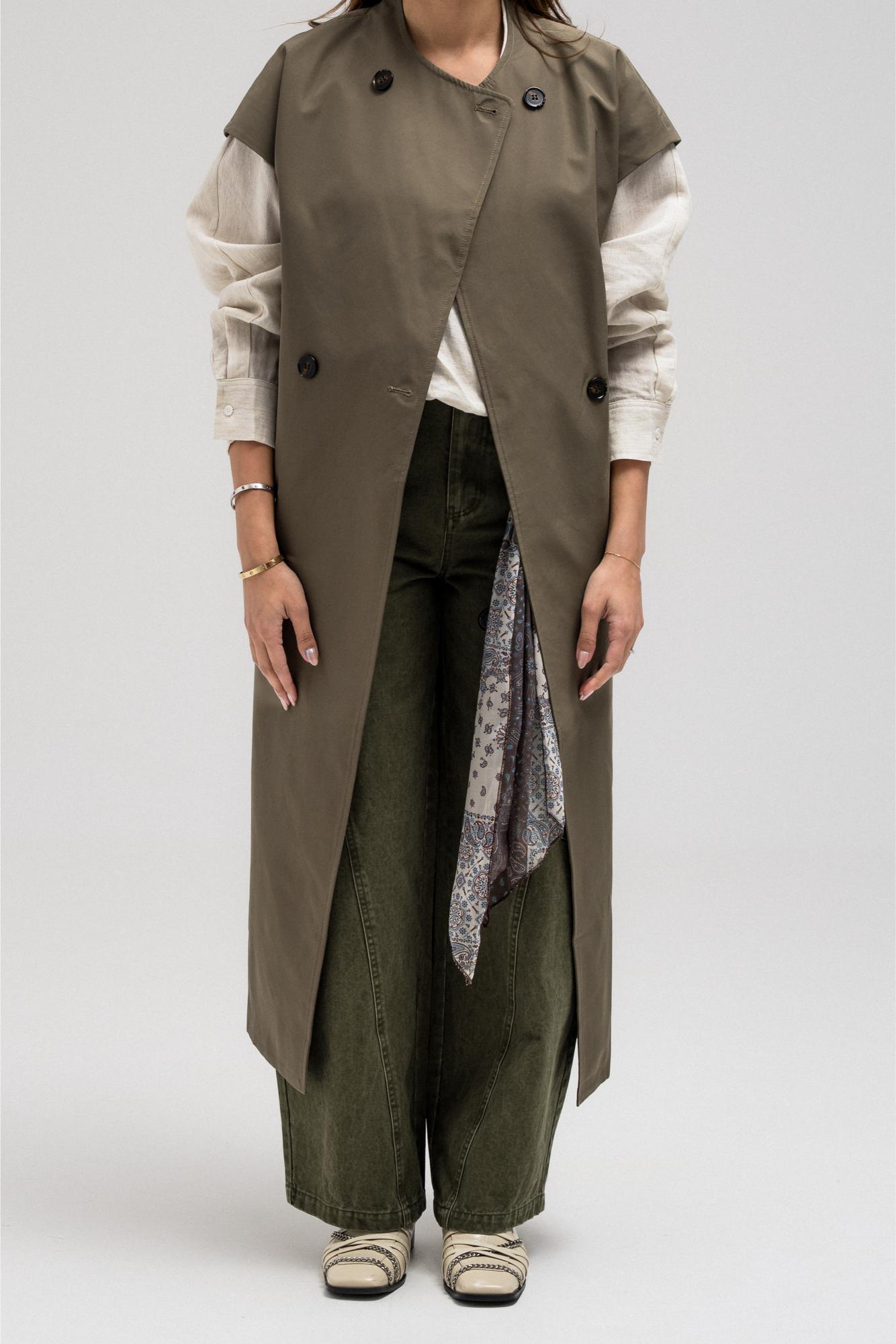 Sleeveless longline vest features a layered overlay detail at the back. Designed with four front buttons, side pockets, and a matching belt.