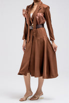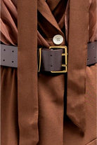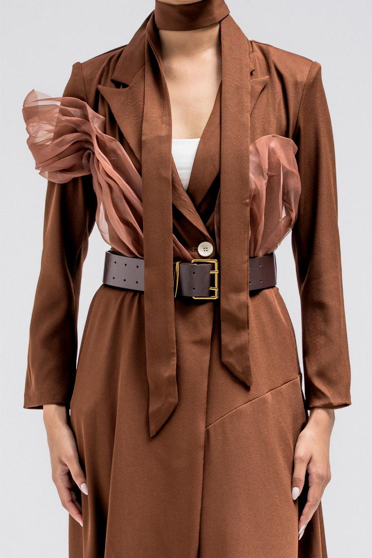 This long, flowy piece is designed to be worn as a dress or styled open like a statement blazer jacket. It features a full front button closure, tailored lapel collar, and structured patch pockets that add a refined, jacket-inspired feel. The silhouette flows effortlessly while keeping a polished shape, and the matching belt allows you to cinch the waist for a more defined look or wear it loose for an easy, layered style. Versatile and elegant, perfect for dressing up or layering over everyday looks.