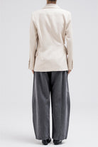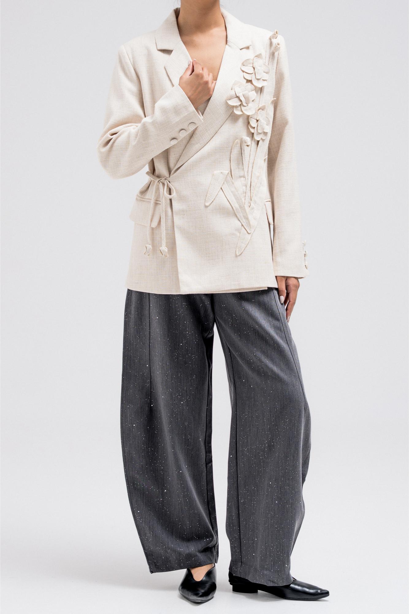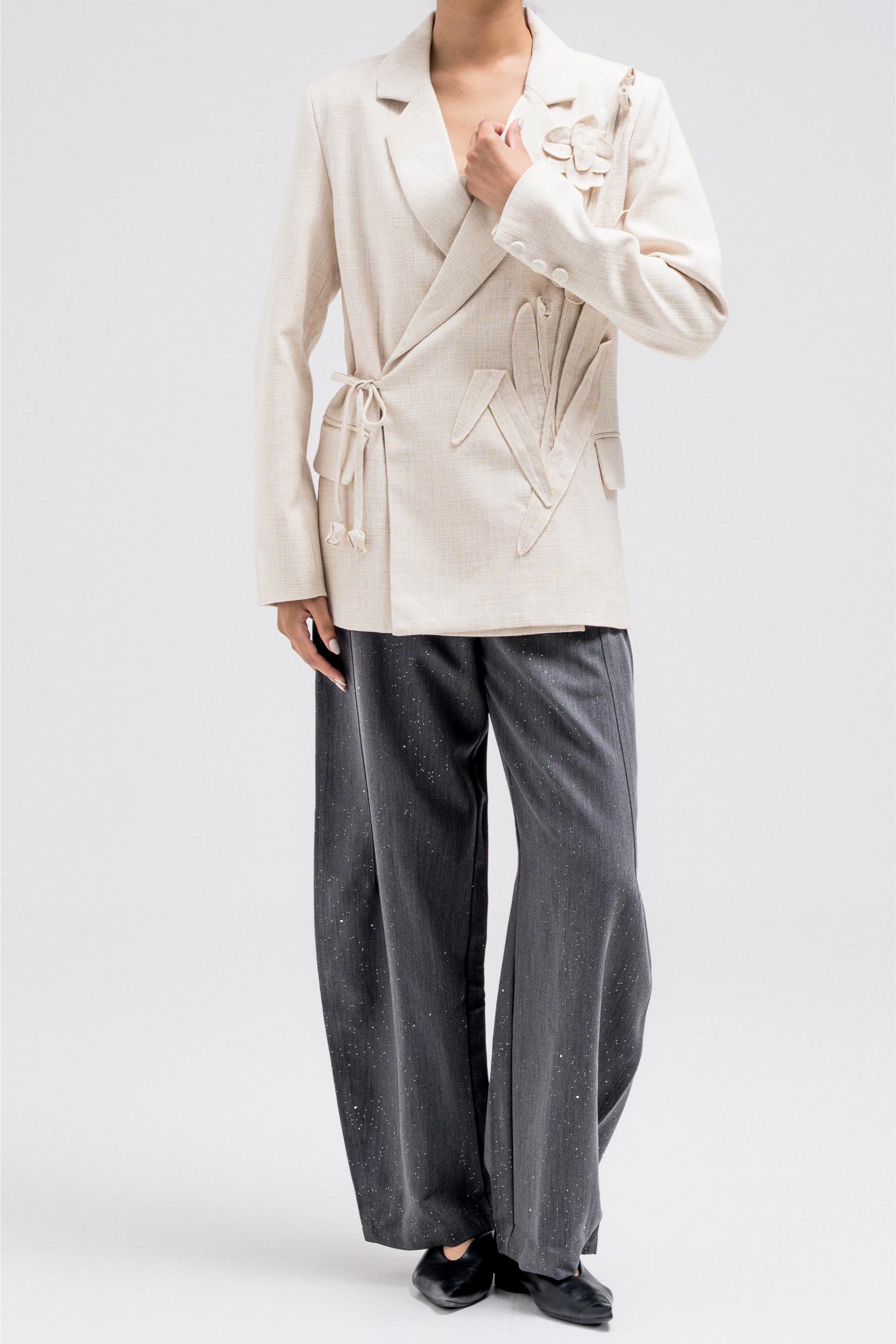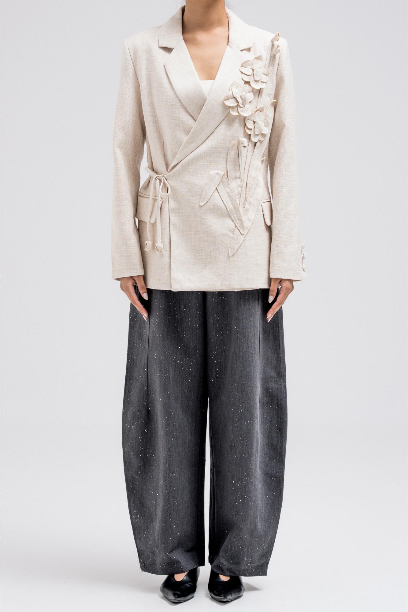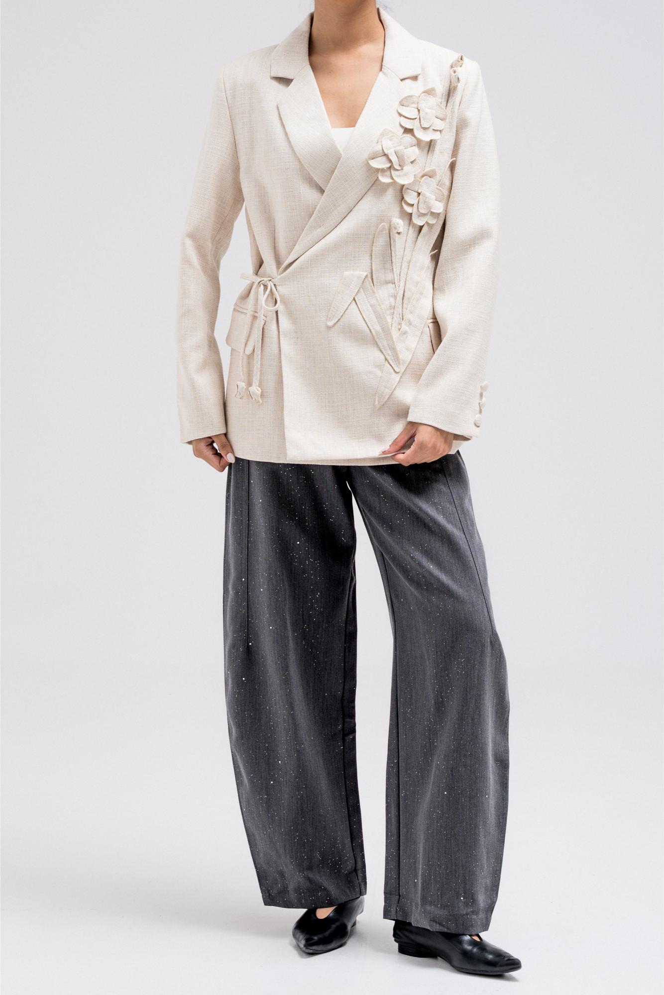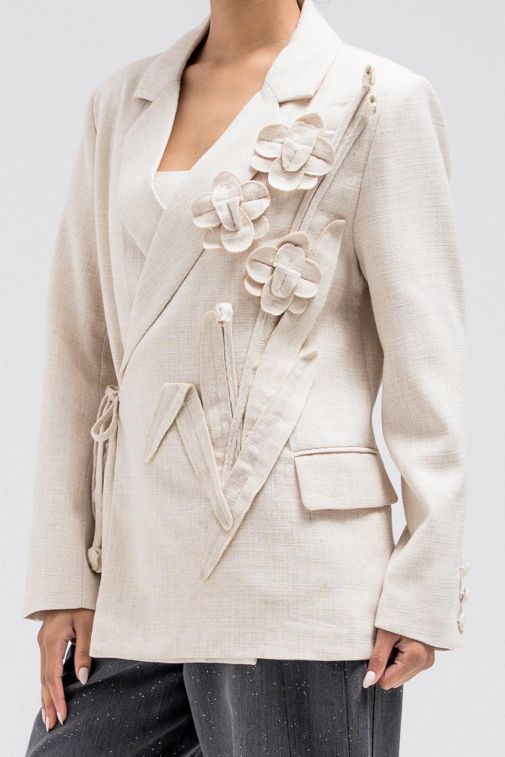 This elegant jacket features a refined tailored silhouette with a soft structured feel. Designed with a classic notched collar and a clean open-front style, it’s elevated by delicate floral embellishments along one side, adding a subtle statement and artisanal touch. The fabric has a smooth, slightly textured finish that gives it a polished look while remaining lightweight and comfortable. Finished with flap pockets for a tailored edge and clean seams that enhance the overall structure.