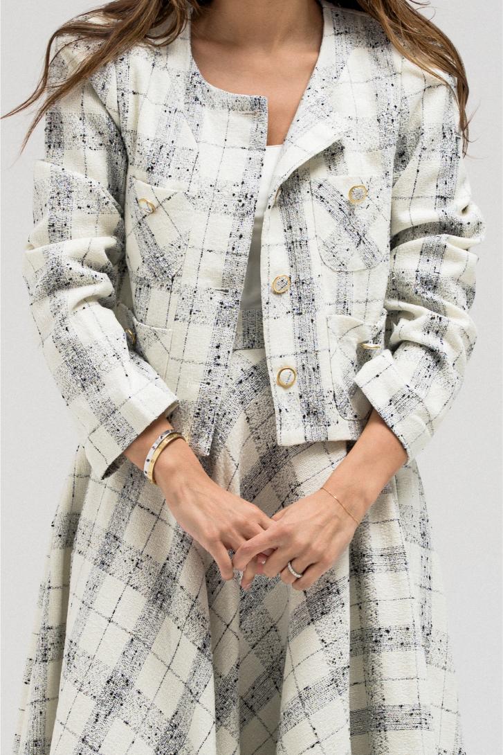 This elegant jacket features a soft checkered textured fabric with a structured yet flowy silhouette. Designed with a classic collar and a clean front button closure, it drapes beautifully for a refined look. The tailored cut makes it easy to style open or closed, adding a polished layer to both casual and elevated outfits. It pairs perfectly with the matching skirt for a coordinated set, or can be styled on its own with denim or tailored pants.