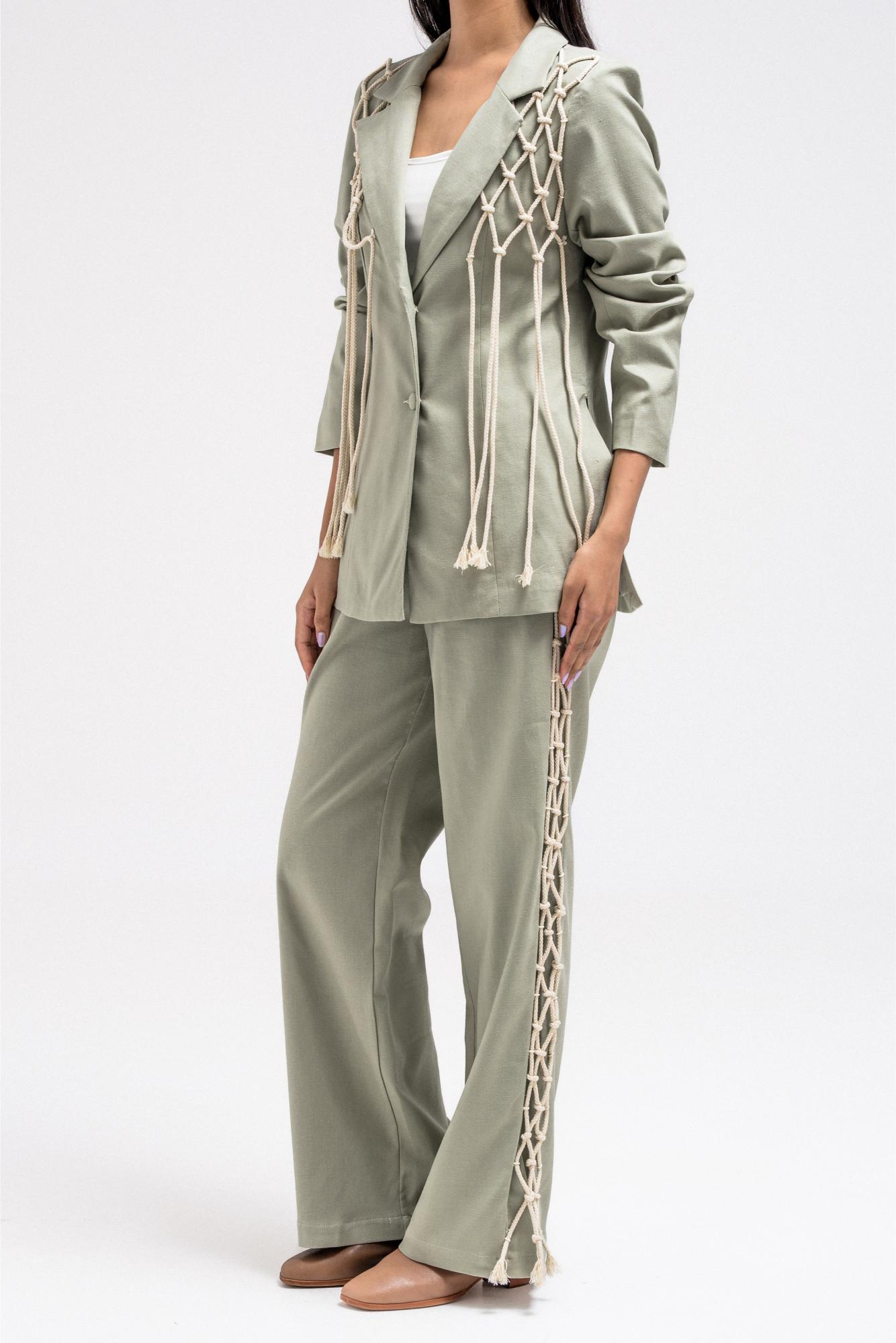 This blazer-style jacket features a structured yet relaxed silhouette, elevated by a unique front rope-tie detail that replaces the classic closure. The design adds a soft, modern edge while allowing you to adjust and style it your way. Clean lines and a tailored feel make it an easy statement piece, perfect for wearing on its own or paired with the matching pants for a polished full look.