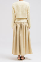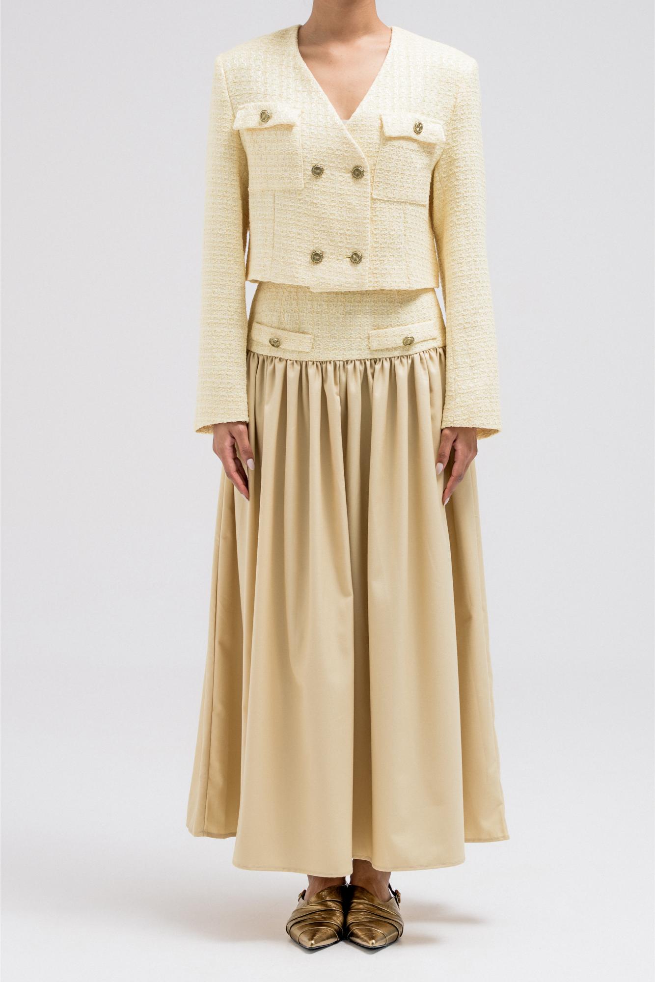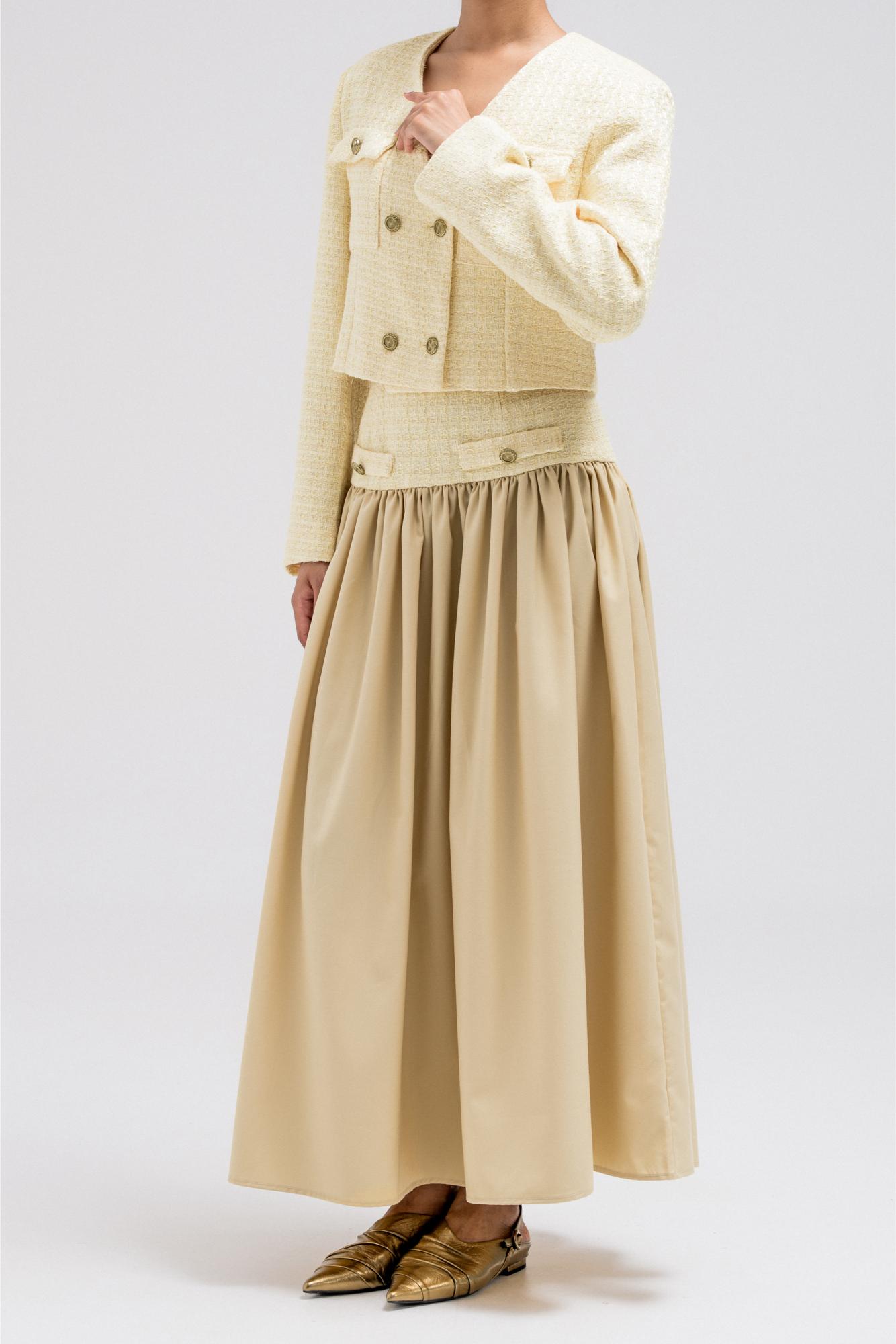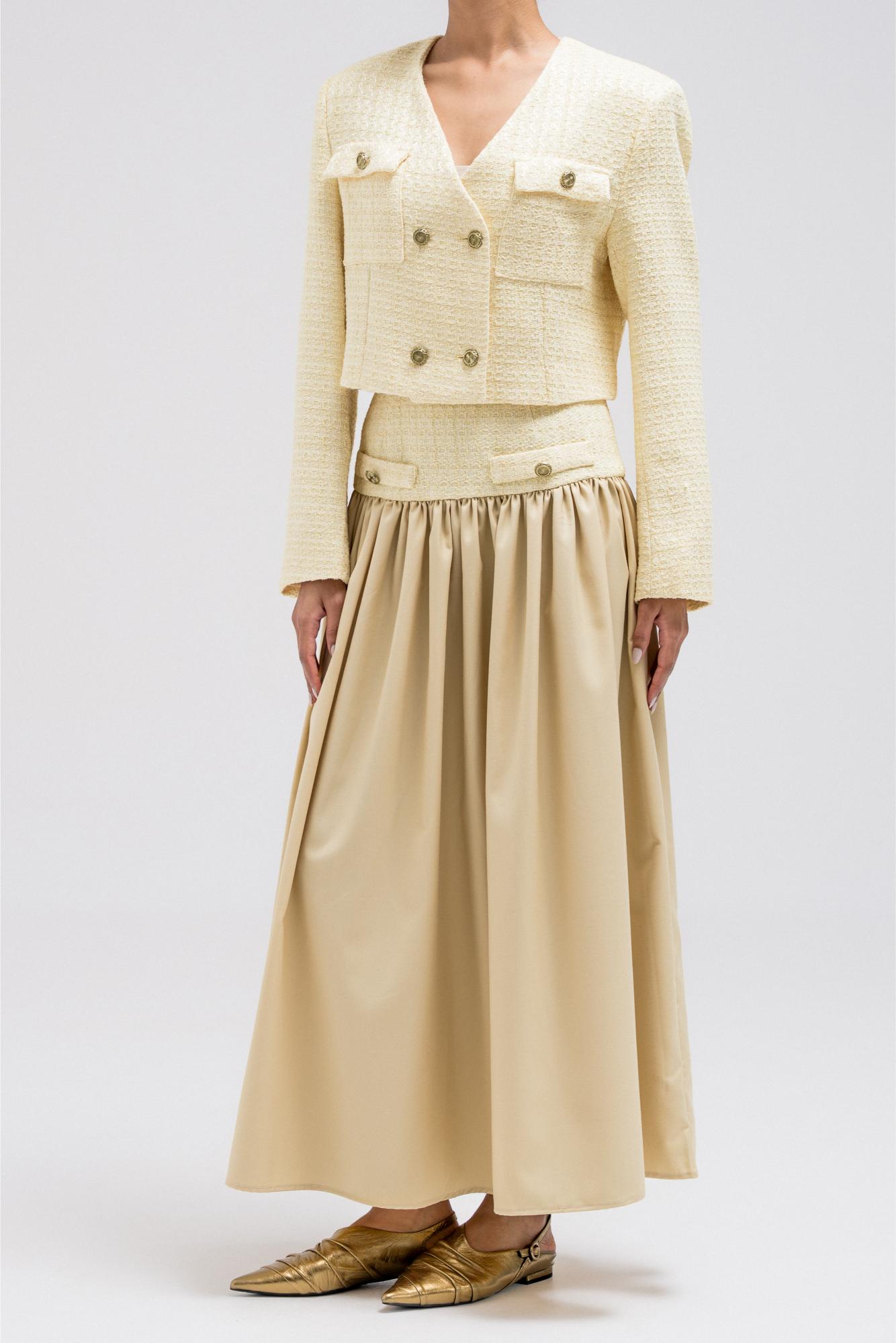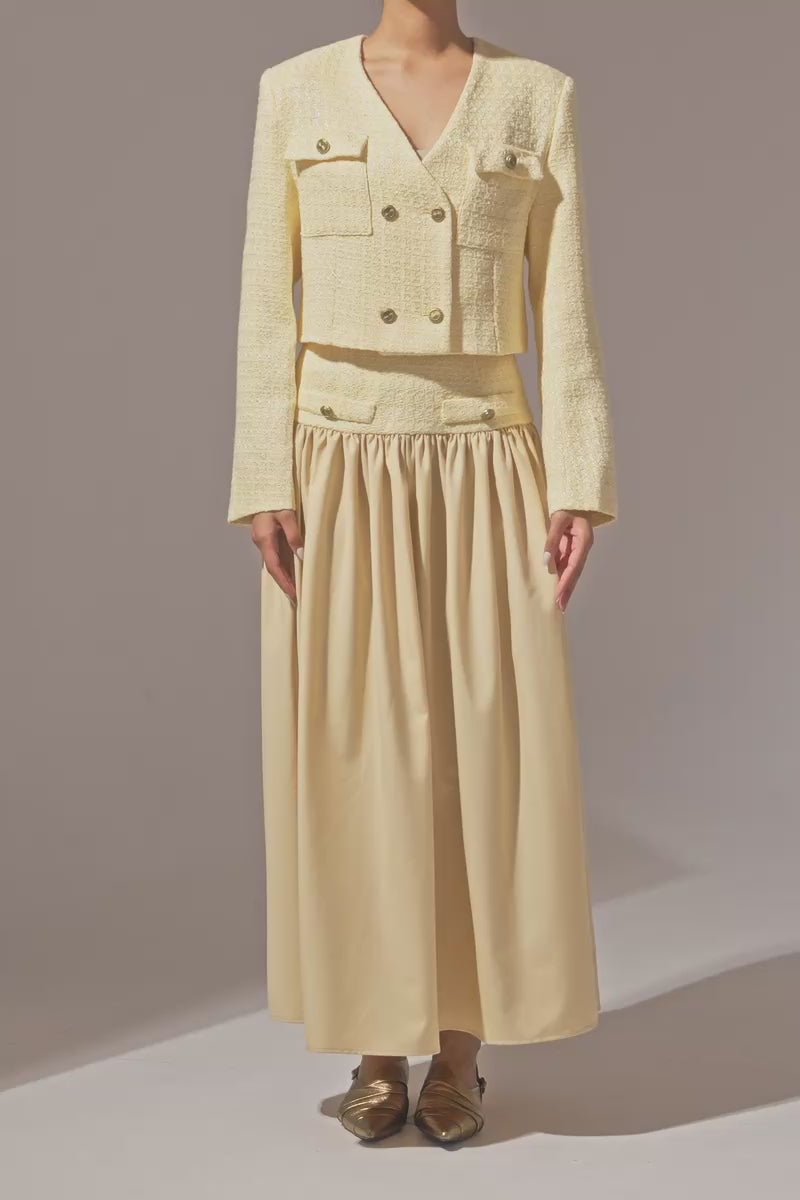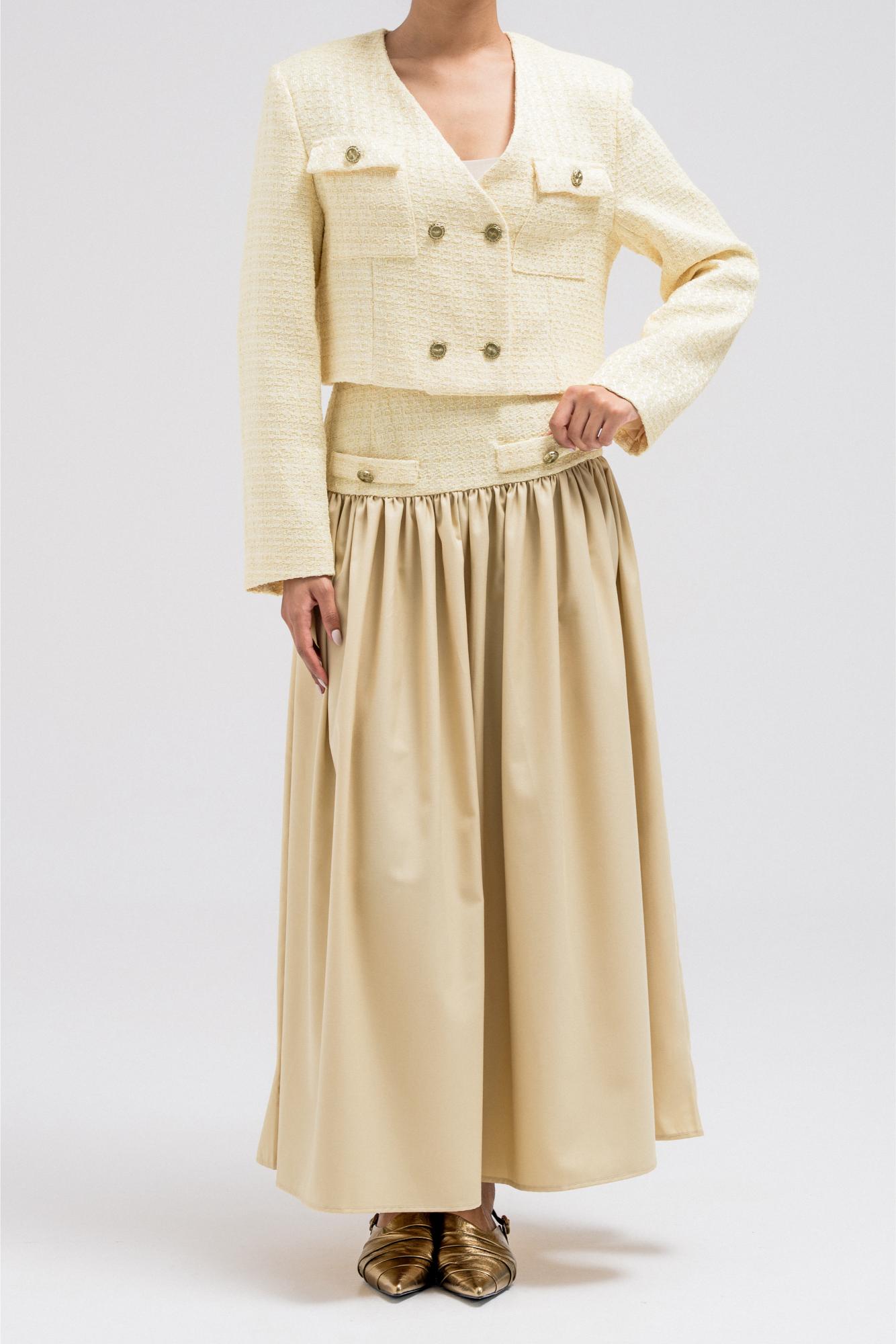 A chic cropped jacket designed to add structure and polish to any look. It features a clean silhouette with subtle texture, making it easy to layer over tops or dresses. The cropped length highlights the waist beautifully, making it especially flattering when styled with high-waisted skirts or pants. Perfect to wear on its own or paired with the matching skirt for a coordinated, elevated look.