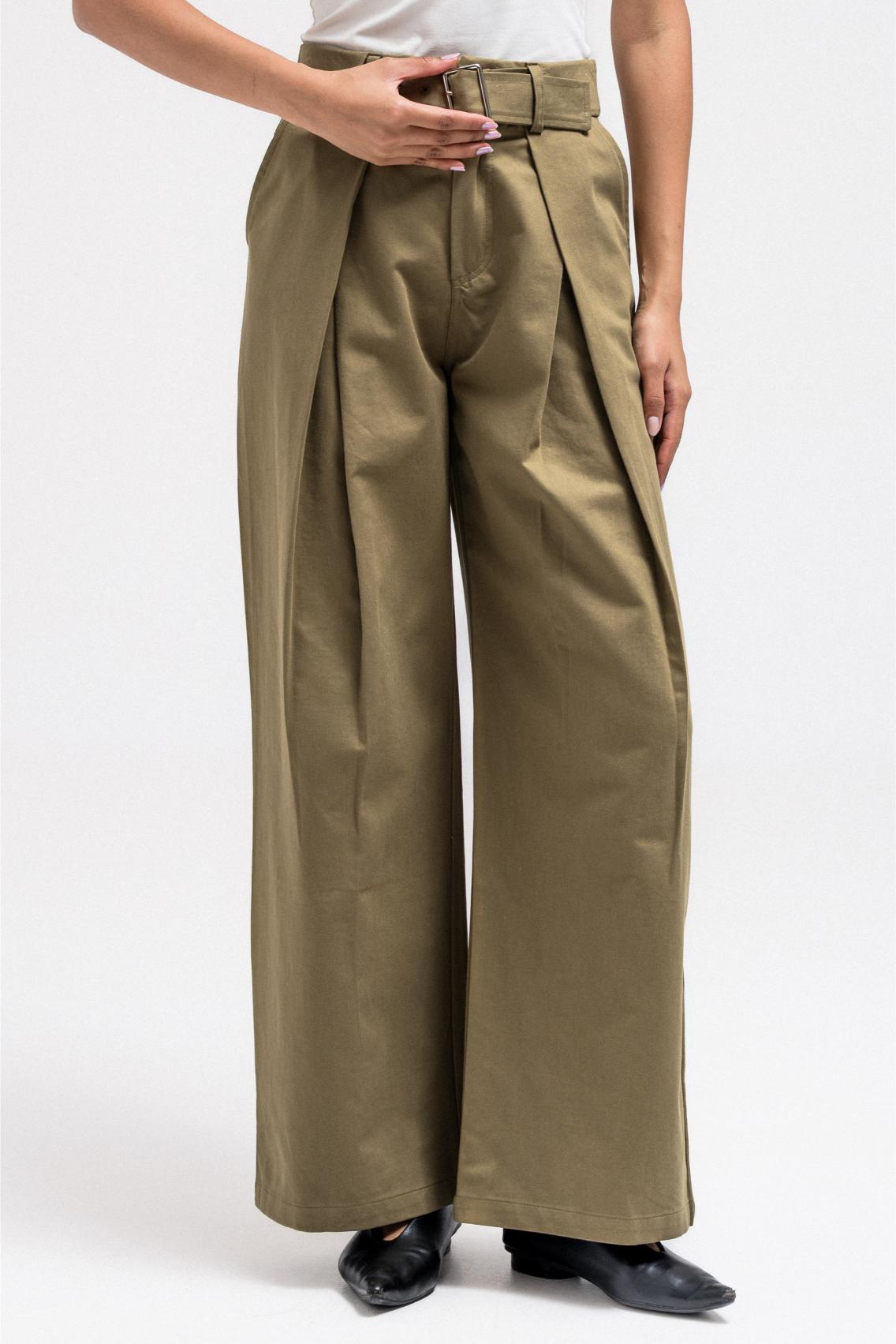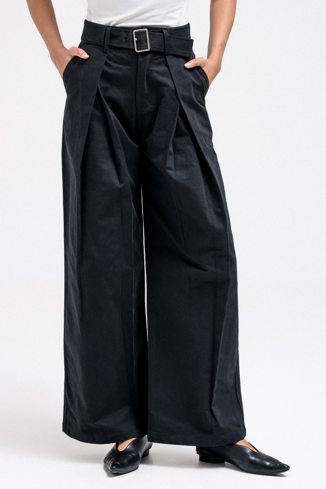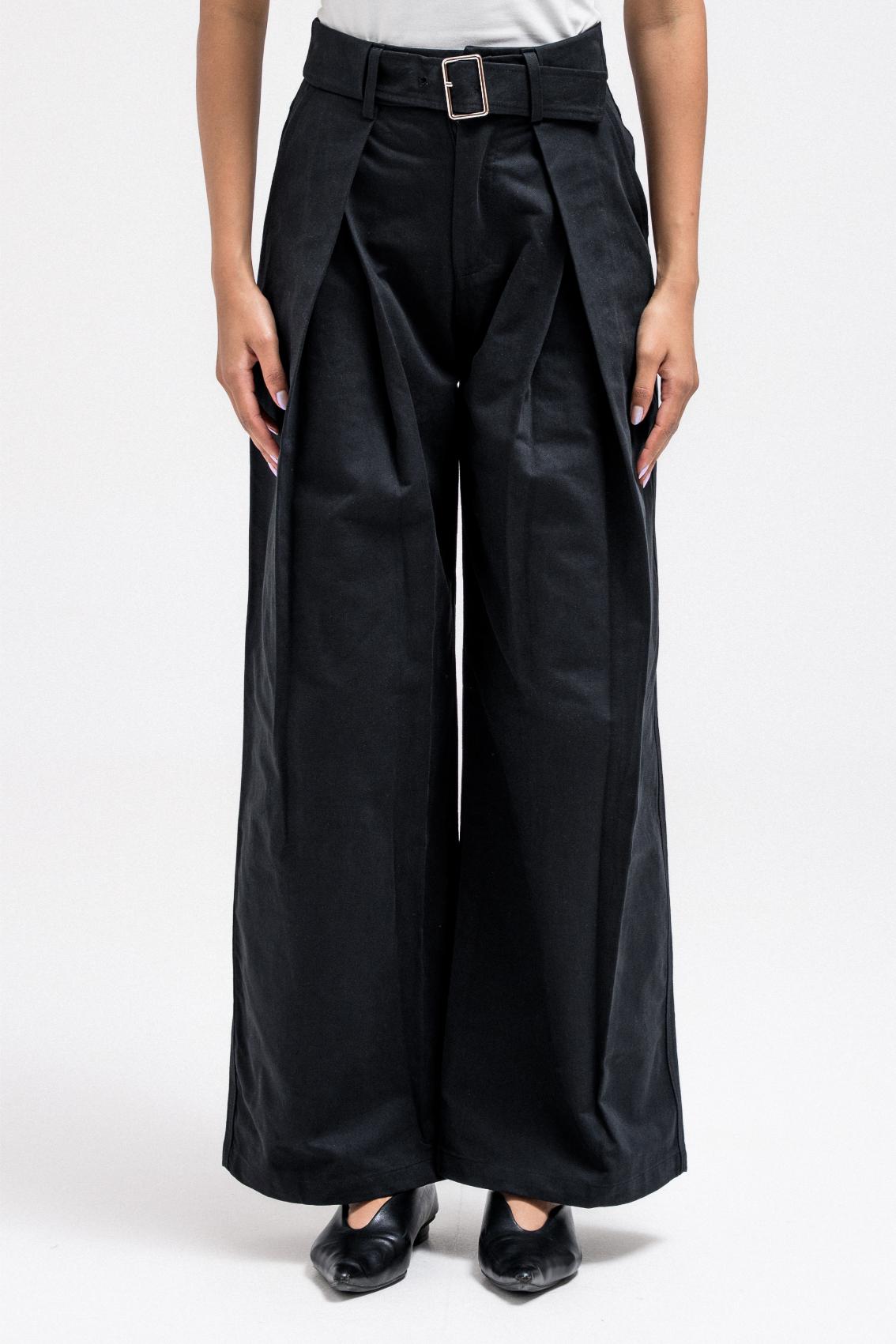 These tailored pants feature a structured wide-leg silhouette with an attached buckle belt that adds a refined, statement detail at the waist. Designed with a front zipper closure for a clean finish, they offer a flattering high-waist fit that elongates the leg