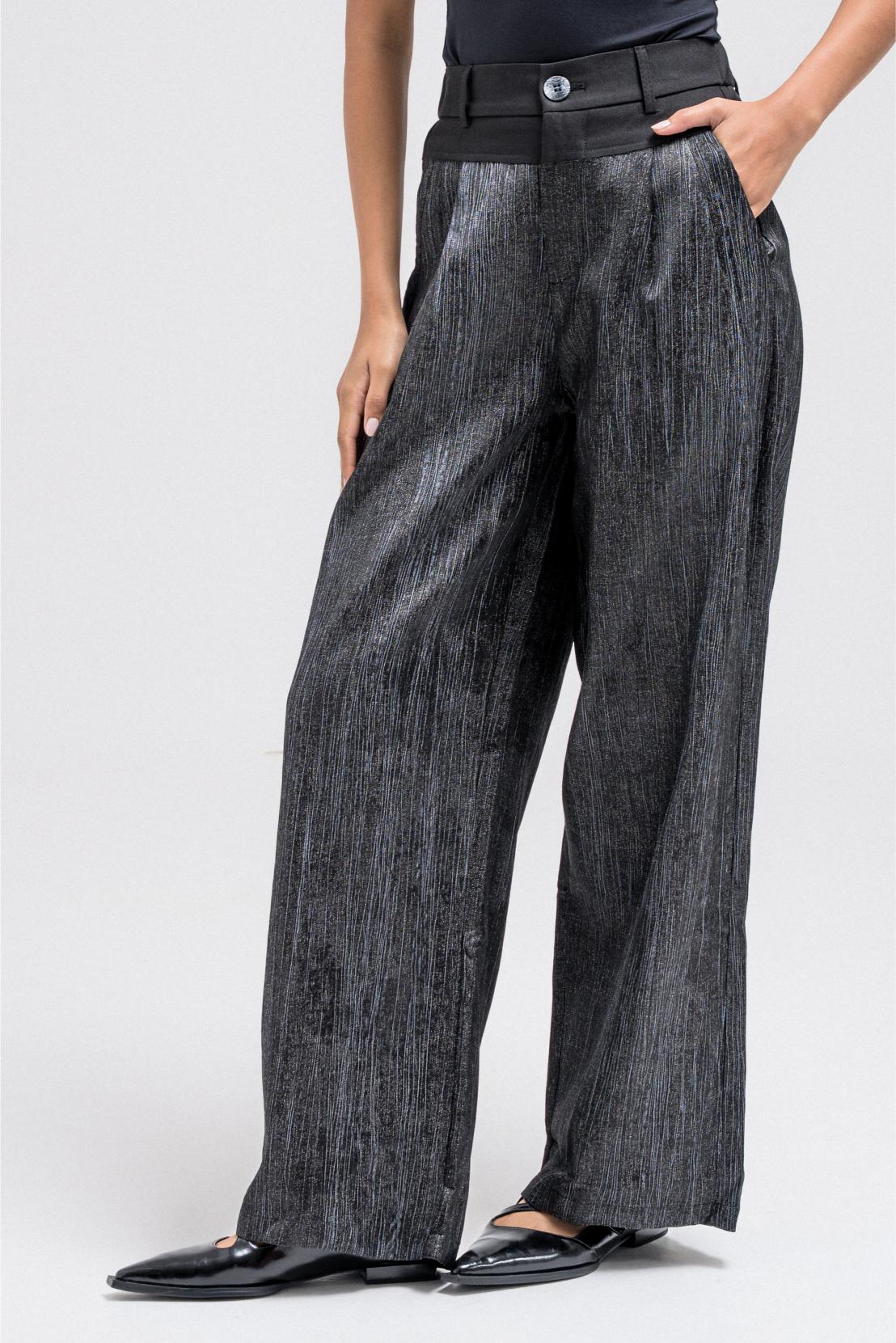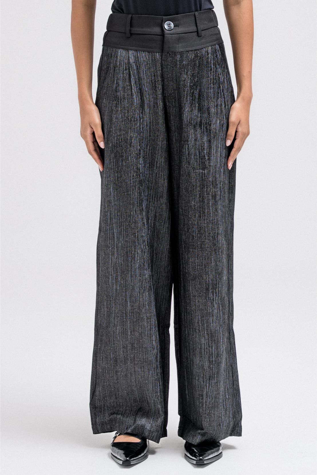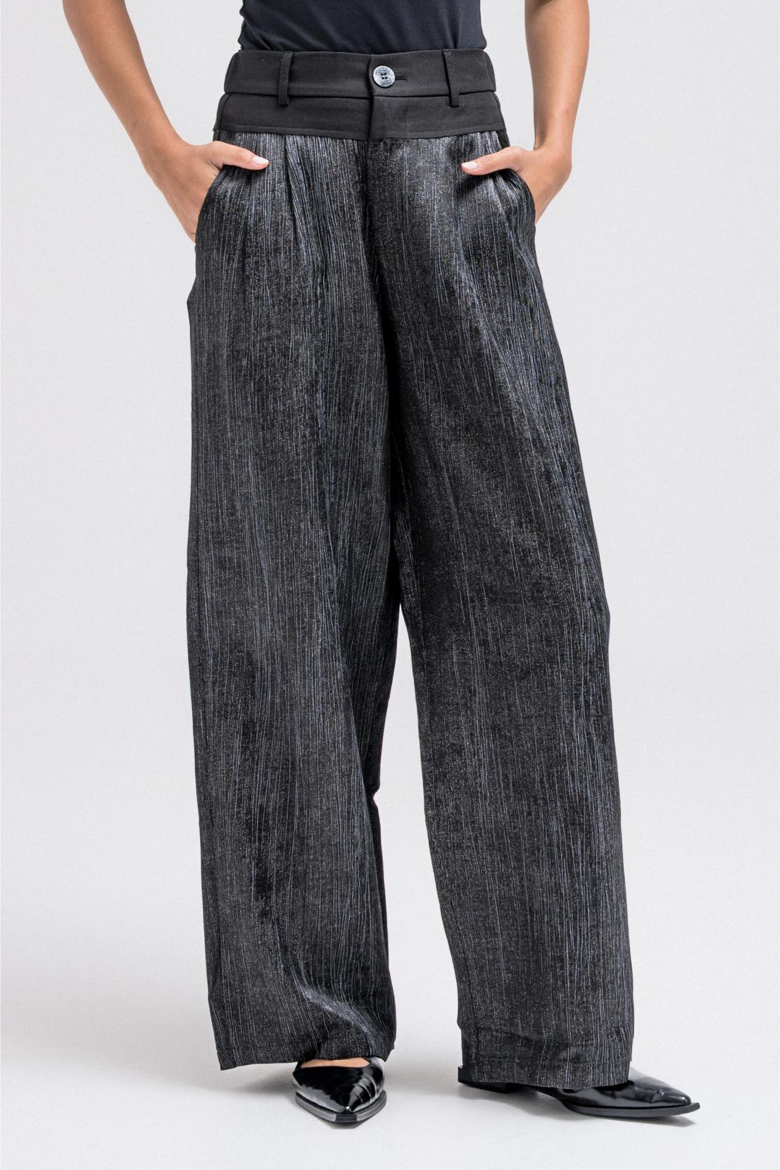These wide-leg pants are crafted from the same textured, lightly shimmering fabric for a cohesive finish. Designed with a clean waistband and a flowing silhouette, they offer comfort and elegance in one. The subtle slit detail enhances movement and adds a contemporary touch. Pair them with the matching blazer for a polished, coordinated outfit that transitions seamlessly from day to evening.