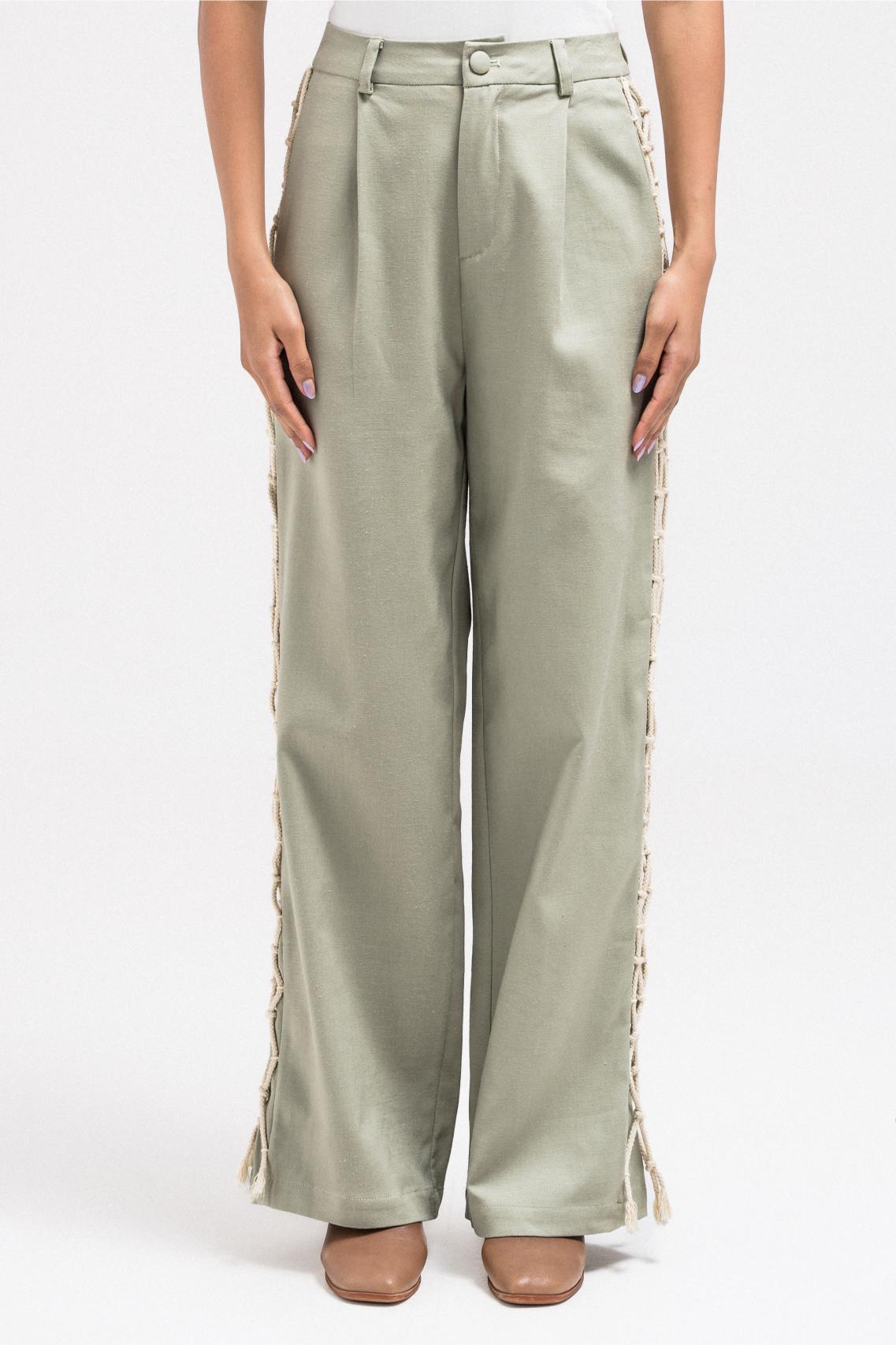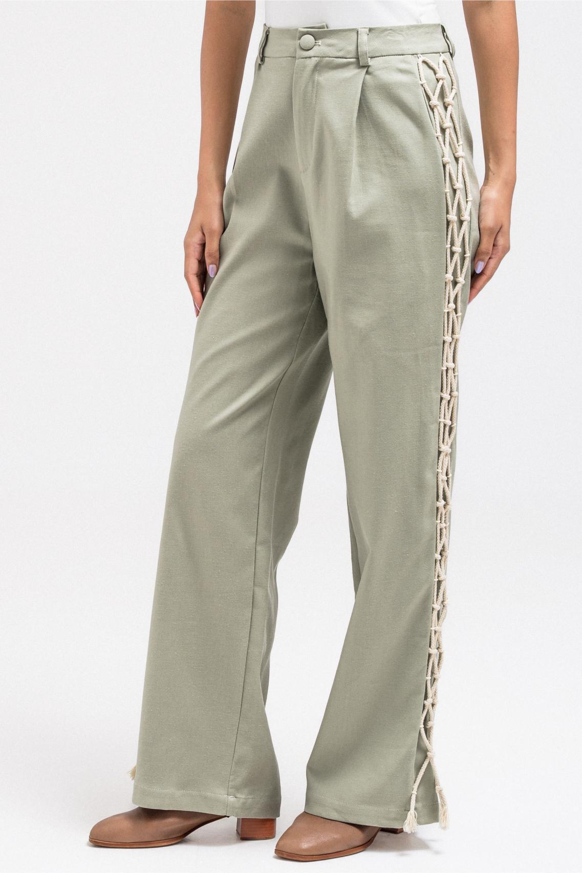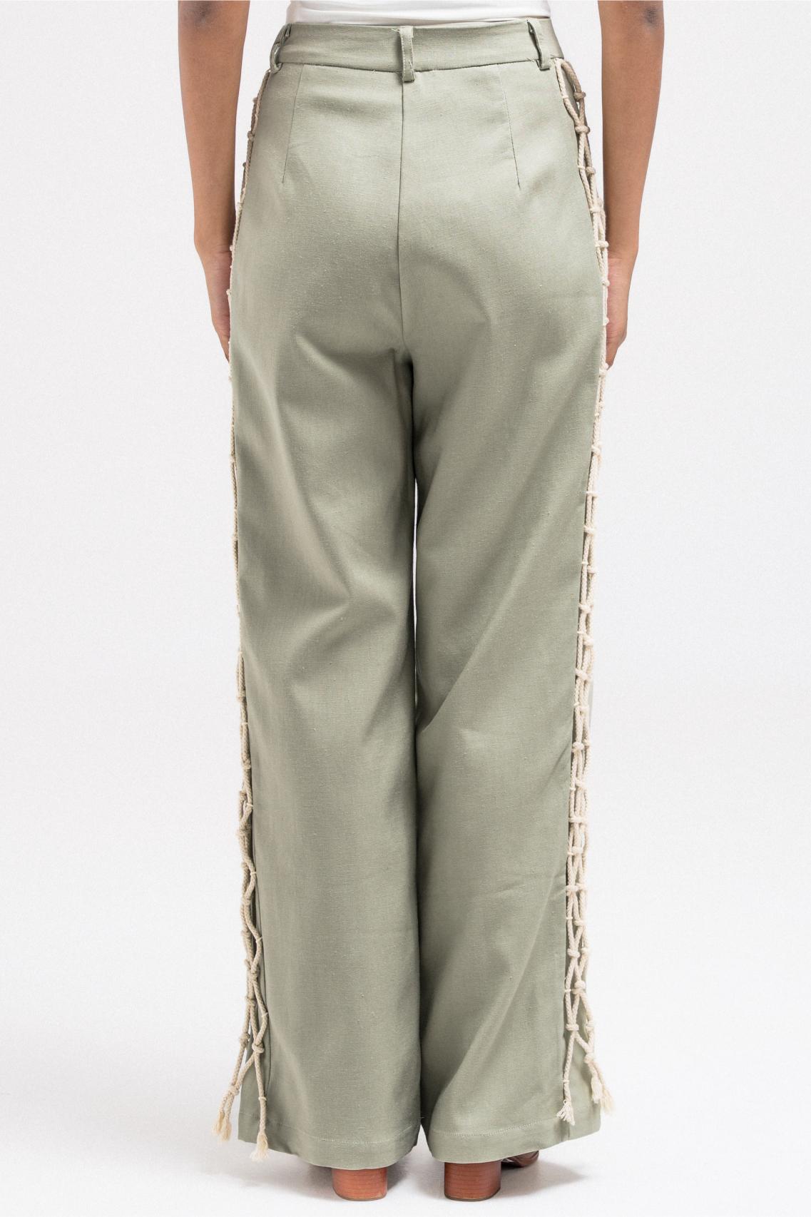Designed to complement the matching blazer, these tailored pants stand out with rope detailing along the side, adding a subtle yet distinctive design element. Finished with a button and zipper front closure, the silhouette is clean and refined while remaining comfortable to wear. Ideal for styling with the matching blazer to create a coordinated, elevated set.