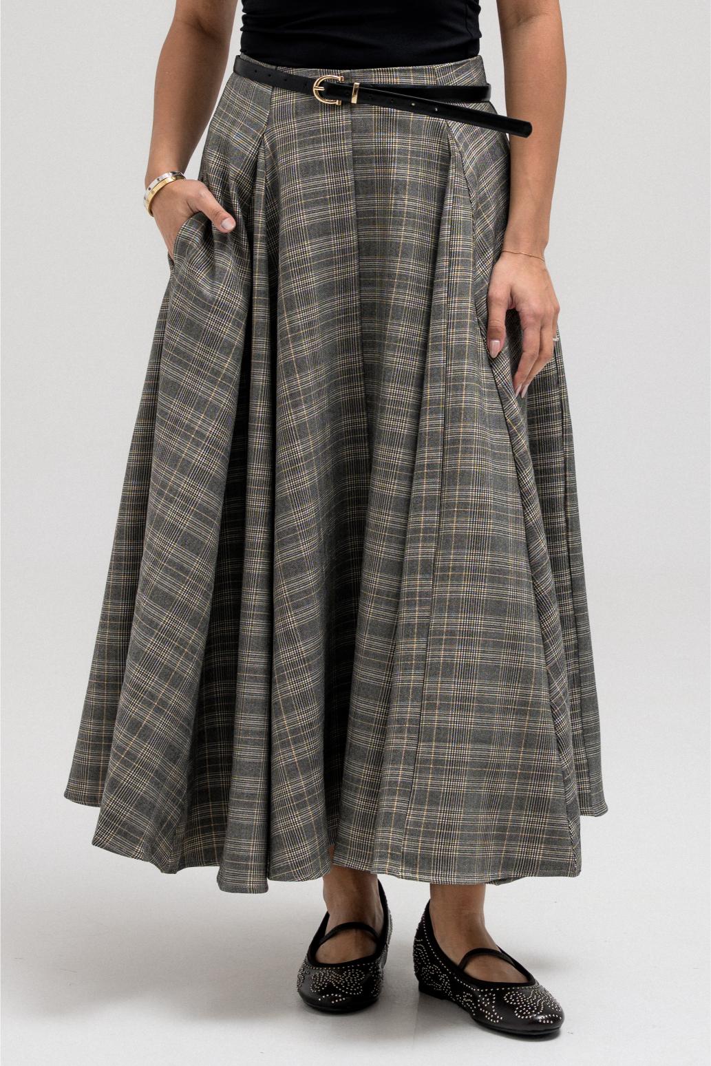 This flowy plaid skirt is designed with graceful movement and a flattering silhouette. It comes with a matching belt to cinch the waist and a back zipper closure for a clean finish. An easy piece to dress up or down while adding pattern and elegance to your outfit.