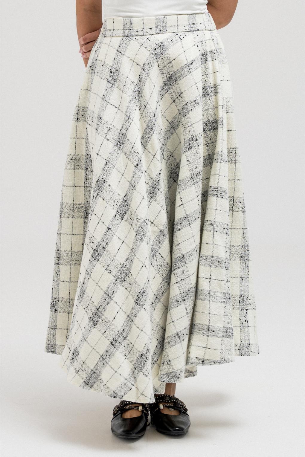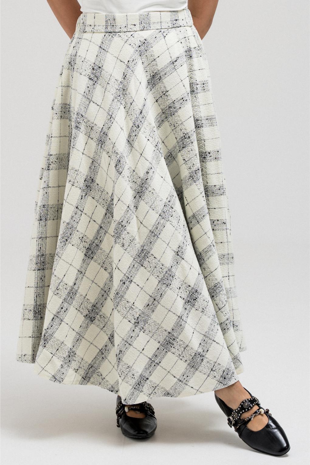 Crafted from the same checkered textured fabric, this skirt offers a graceful, flowy shape that moves effortlessly with every step. The long silhouette creates an elegant line, making it ideal for both day and evening wear. Wear it with the matching jacket for a complete look