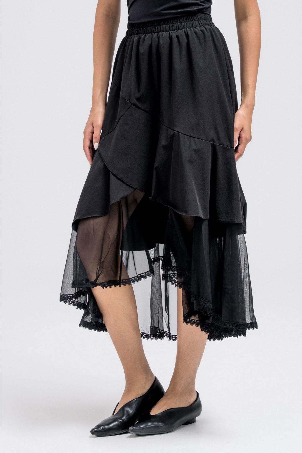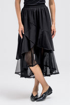 This skirt features a comfortable elastic waistband and a flowy, layered silhouette that moves beautifully with every step. The hem is finished with a sheer transparent panel, detailed with delicate lace accents for a soft, feminine touch. Designed to complement the matching vest perfectly, it creates an elegant and cohesive full look when worn together.