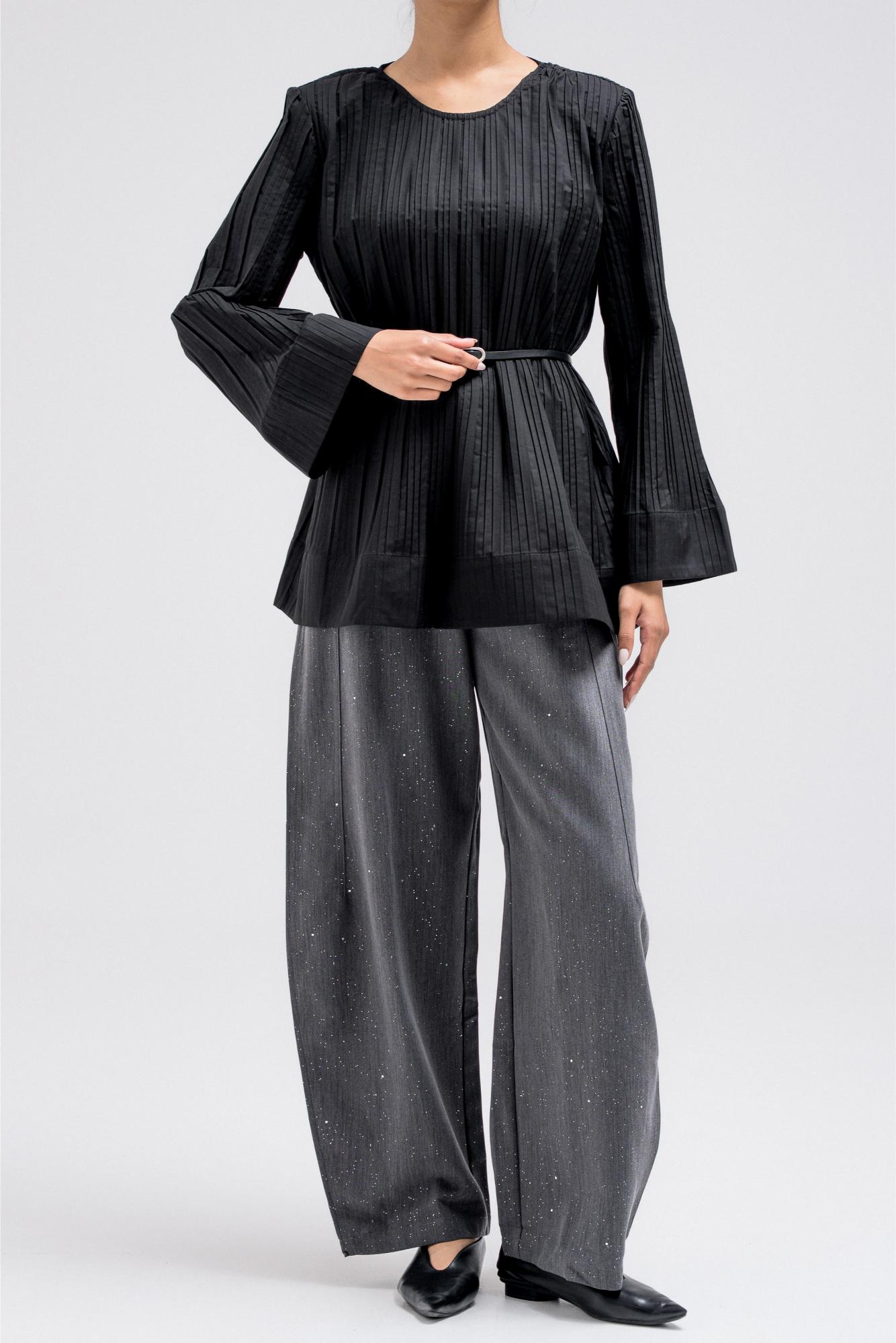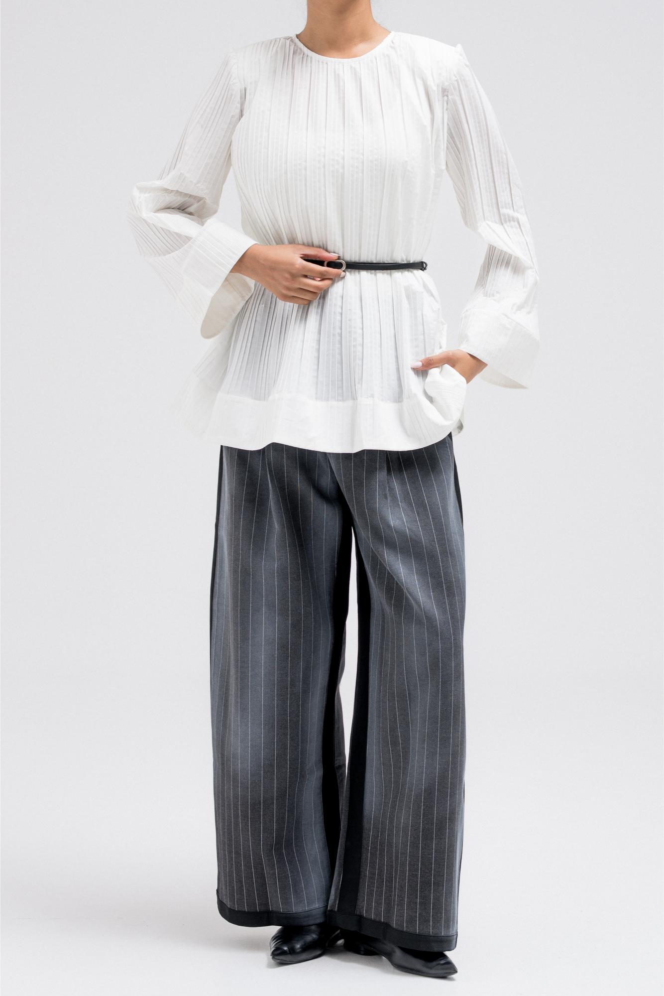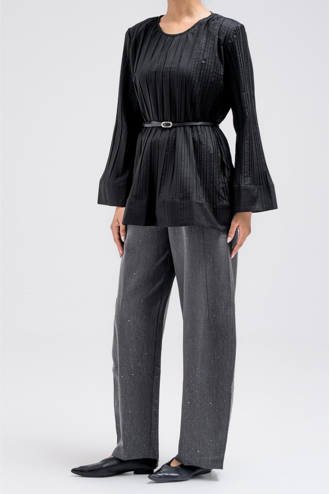 A light, airy top designed with soft pleats throughout for a flowy silhouette. It comes with a matching leather belt that cinches the waist, creating shape and contrast. The relaxed sleeves and fluid fabric make it comfortable yet polished—perfect to pair with tailored pants or skirts.