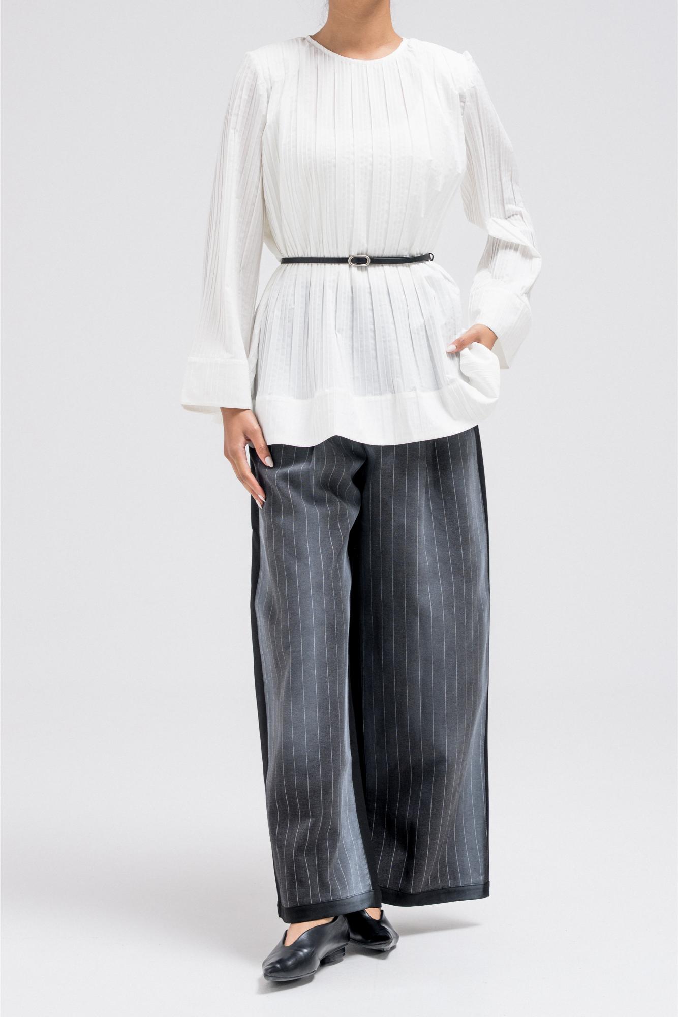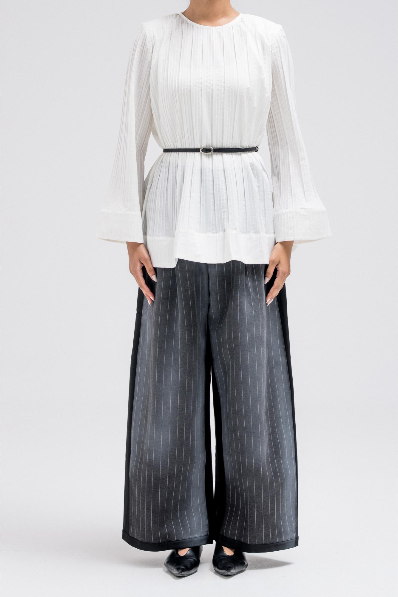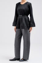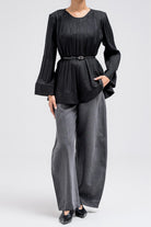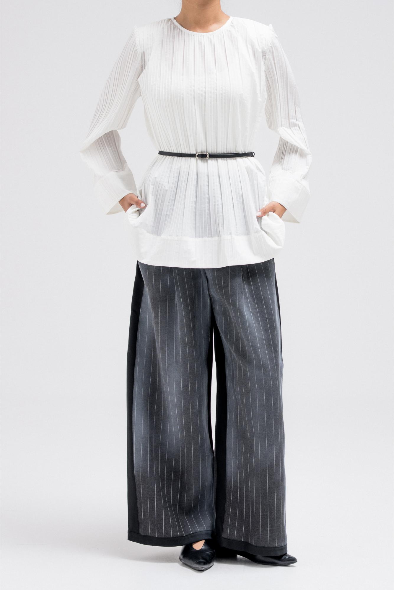 A light, airy top designed with soft pleats throughout for a flowy silhouette. It comes with a matching leather belt that cinches the waist, creating shape and contrast. The relaxed sleeves and fluid fabric make it comfortable yet polished—perfect to pair with tailored pants or skirts.
